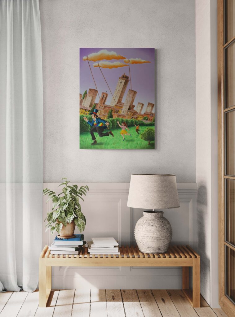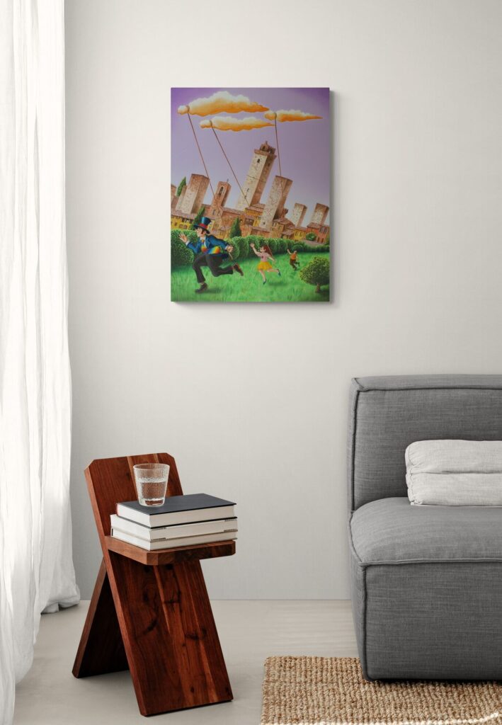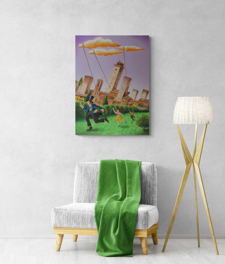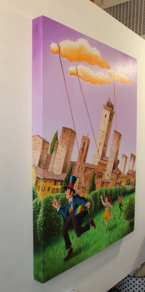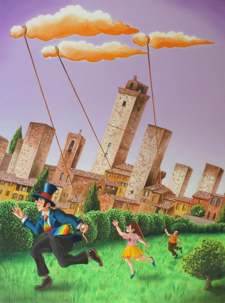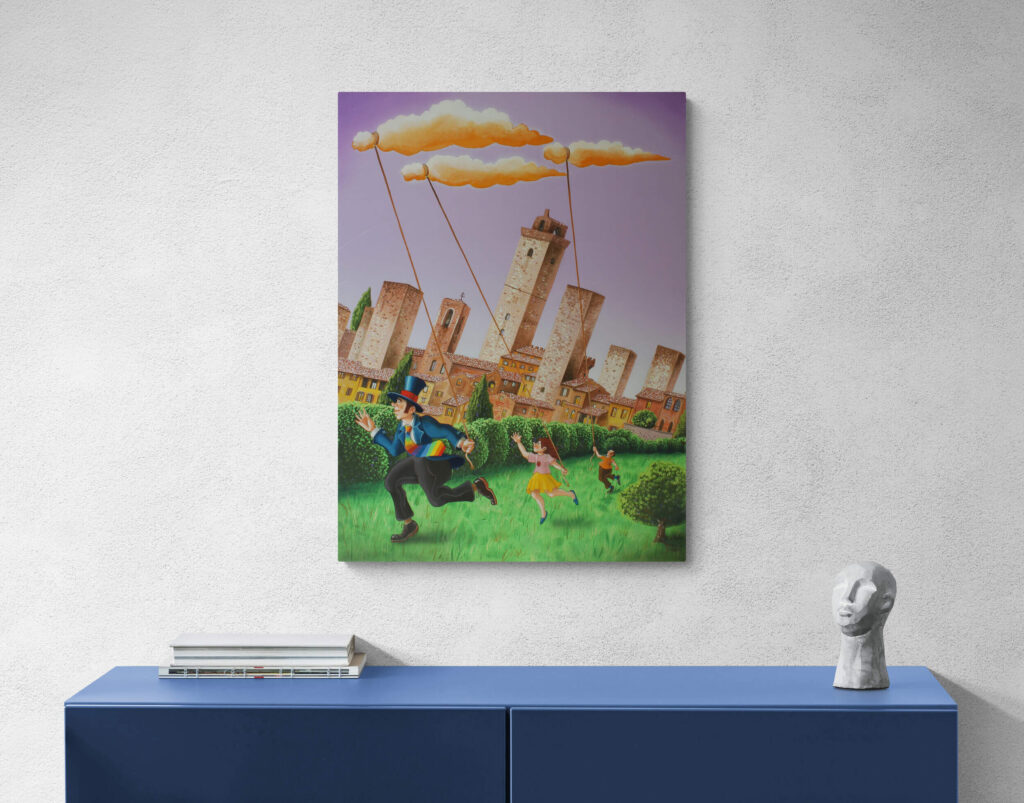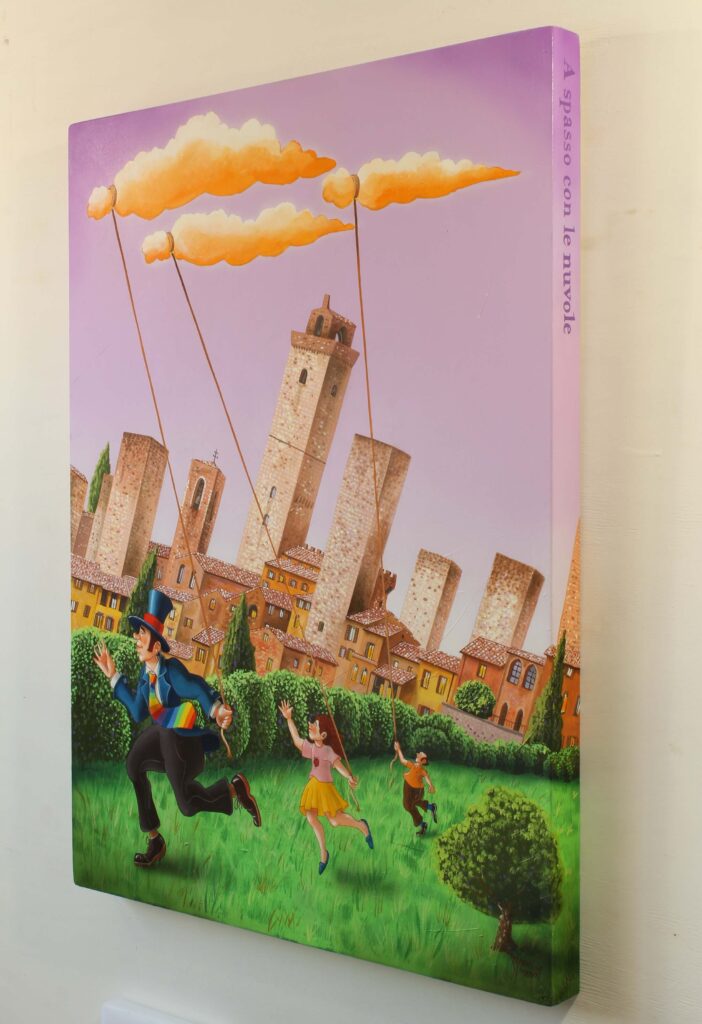 Così, nella mente un po’ stravagante di un’artista a San Gimignano, nasce l’immagine surreale di una passeggiata quotidiana… ma tra cielo e fantasia.