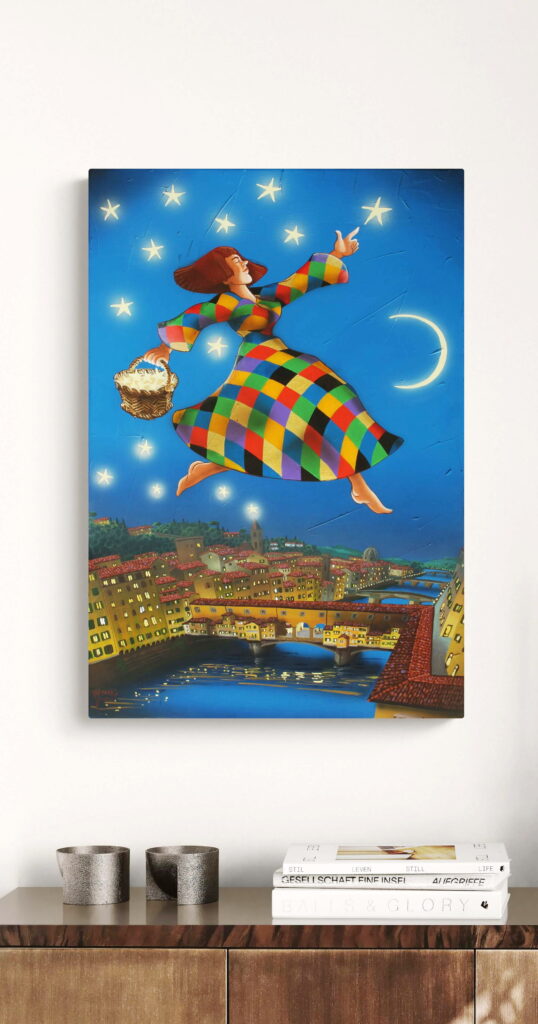 Quest’opera fa parte della collezione Nuove Prospettive del Surrealismo, il nuovo progetto espositivo di Maurizio Vinanti. In questo ciclo, l’artista abbandona la prospettiva tradizionale per esplorare un linguaggio visivo personale e inedito, in cui ogni quadro rappresenta una tappa di un viaggio di trasformazione, ricerca e libertà espressiva.