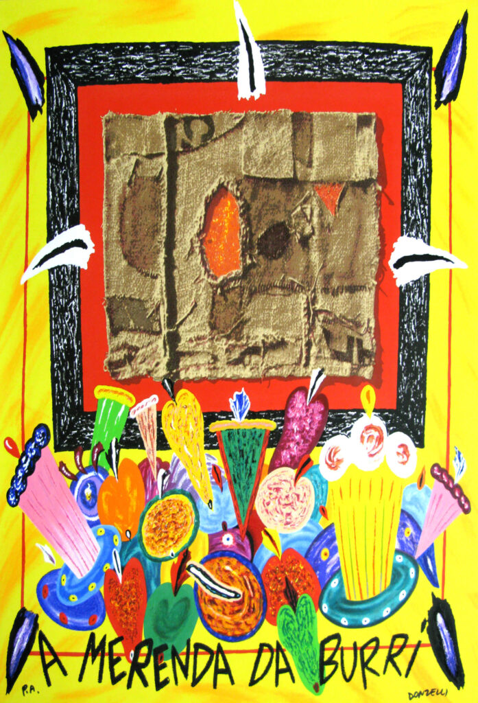 Donzelli include nelle sue opere coloratissime quelli che lui chiama “segni”, annotazioni personali che rappresentano la società contemporanea, una testimonianza delle sfide e dei problemi del nostro tempo.