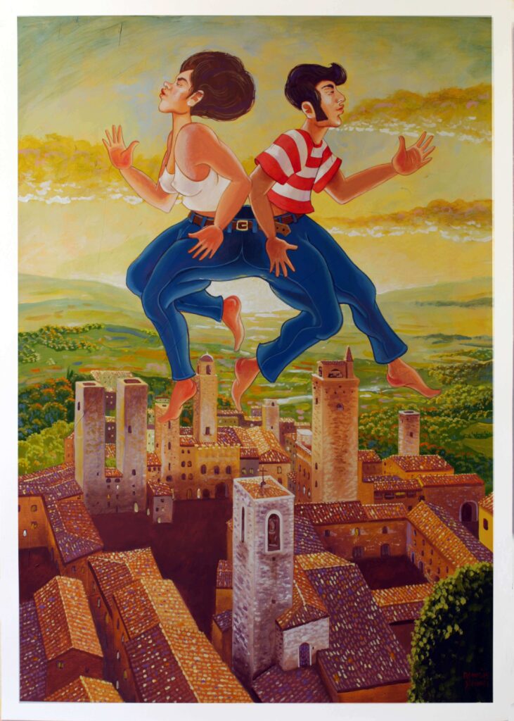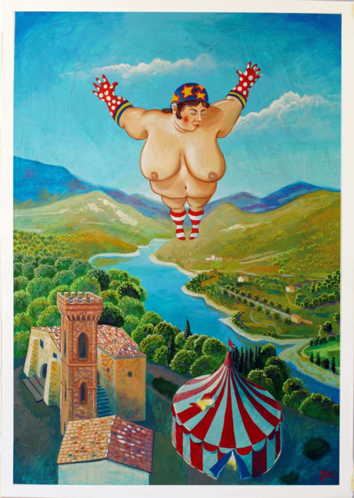 La sua arte è una continua ricerca figurativa, che parte dai paesaggi tipici toscani e si addentra in atmosfere surreali dove i colori sono in grado di esprimere stati d’animo e pensieri coinvolgenti. La dimensione fantastica raffigurata nelle sue tele è il sipario colorato e chimerico dietro il quale si nasconde la testimonianza tangibile e concreta delle passioni, degli incubi, dei sogni e delle aspirazioni che tutti condividiamo. I personaggi che nascono dalle sue pennellate sono sospesi nell’aria, tra realtà e illusione, le sue donne sono ricoperte da veli sottili come la differenza tra il mondo reale e quello dei sogni.