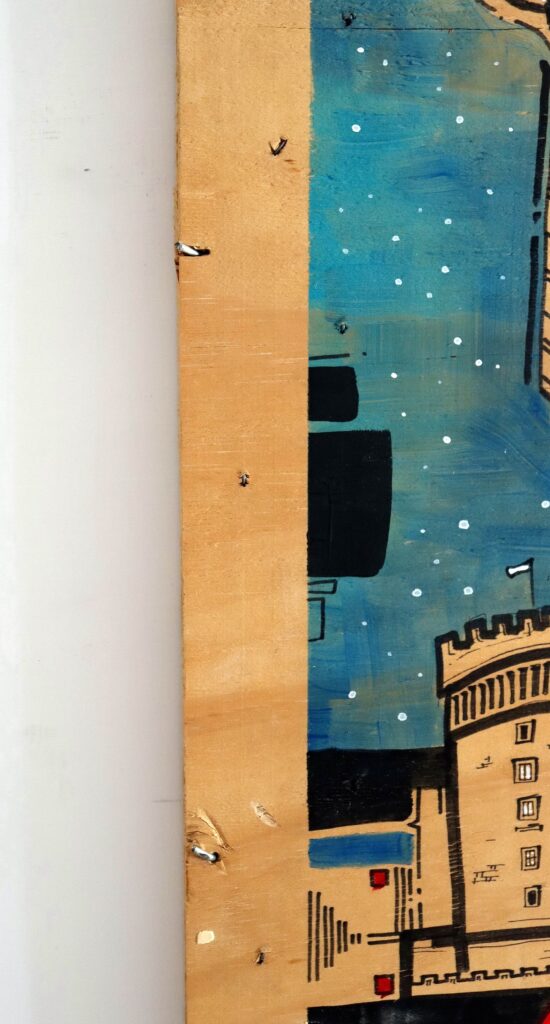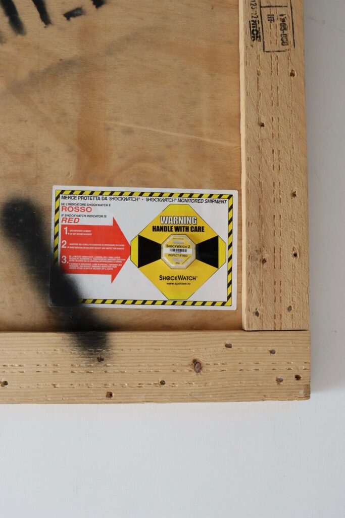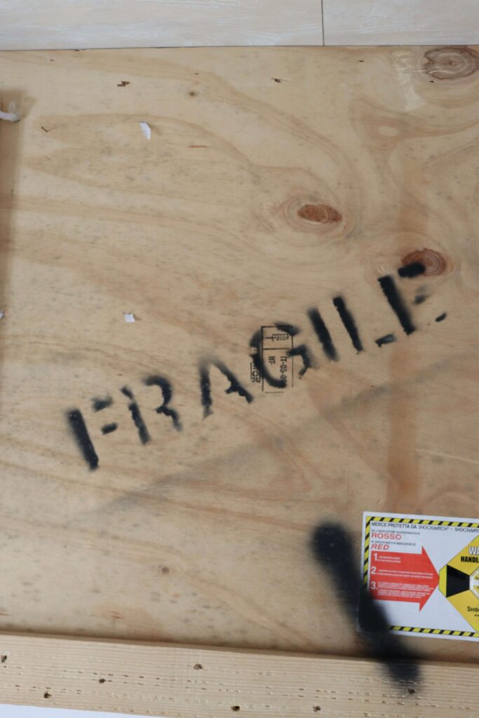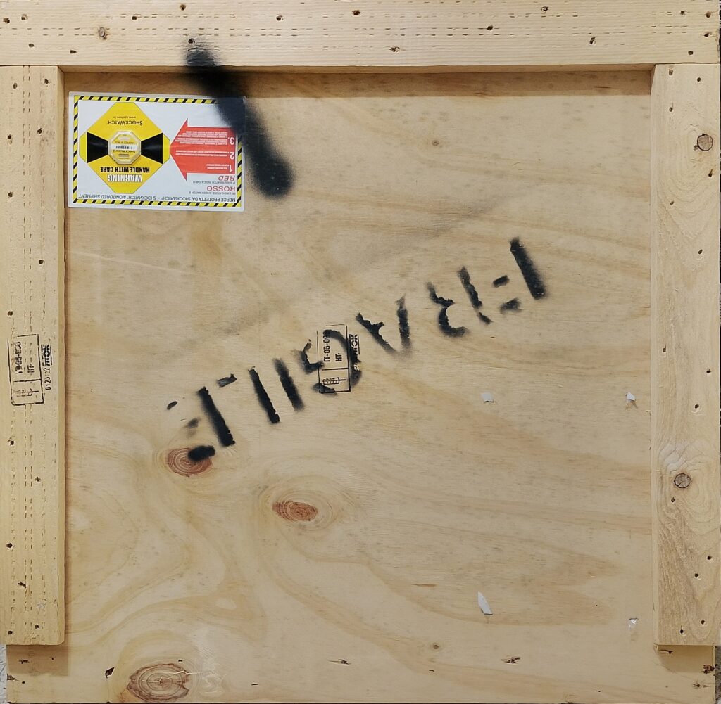 Il dipinto prende forma su un cassone da spedizione in legno, recuperato proprio a Napoli: un materiale che porta impressi i segni del viaggio, del tempo e della memoria. La scritta “fragile” e il sistema d’allarme ancora visibili testimoniano il percorso compiuto, il valore custodito, la vita precedente dell’oggetto. Un contenitore che un tempo trasportava qualcosa di prezioso e che oggi, attraverso l’arte, diventa esso stesso custode di una nuova storia.