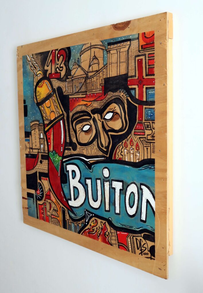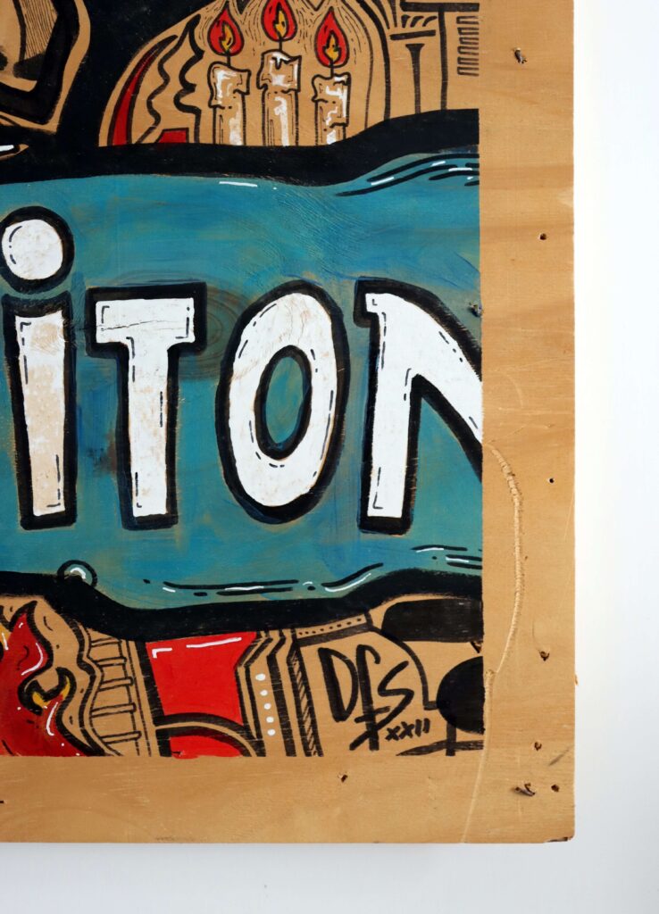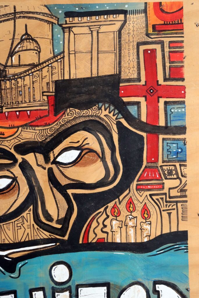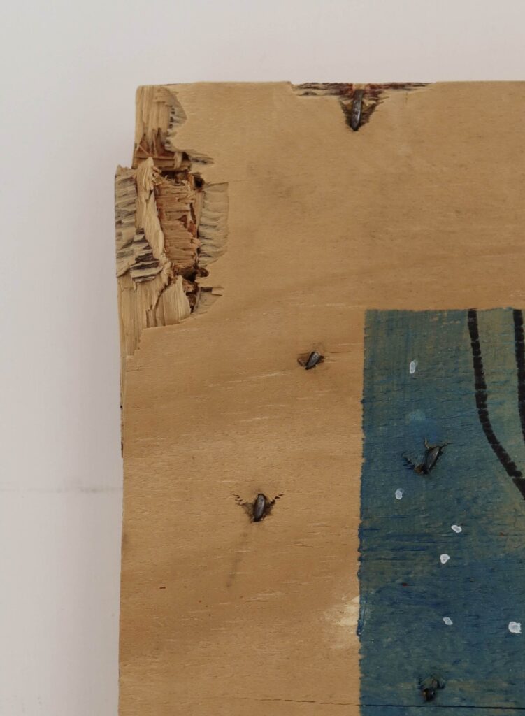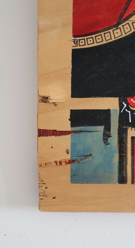 Il dipinto prende forma su un cassone da spedizione in legno, recuperato proprio a Napoli: un materiale che porta impressi i segni del viaggio, del tempo e della memoria. La scritta “fragile” e il sistema d’allarme ancora visibili testimoniano il percorso compiuto, il valore custodito, la vita precedente dell’oggetto. Un contenitore che un tempo trasportava qualcosa di prezioso e che oggi, attraverso l’arte, diventa esso stesso custode di una nuova storia.