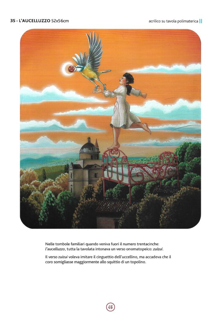 Il numero 35 nella Smorfia napoletana rappresenta l’uccello di qualsiasi razza o dimensione. Oltre al legame con il mondo animale, l’uccello ha nella tradizione napoletana un’importante connessione di tipo puramente fisico-carnale e simboleggia la necessità della realizzazione di desideri personali e profondi, nonché quella di liberarsi da giudizi, insoddisfazioni, pregiudizi e minacce in genere.