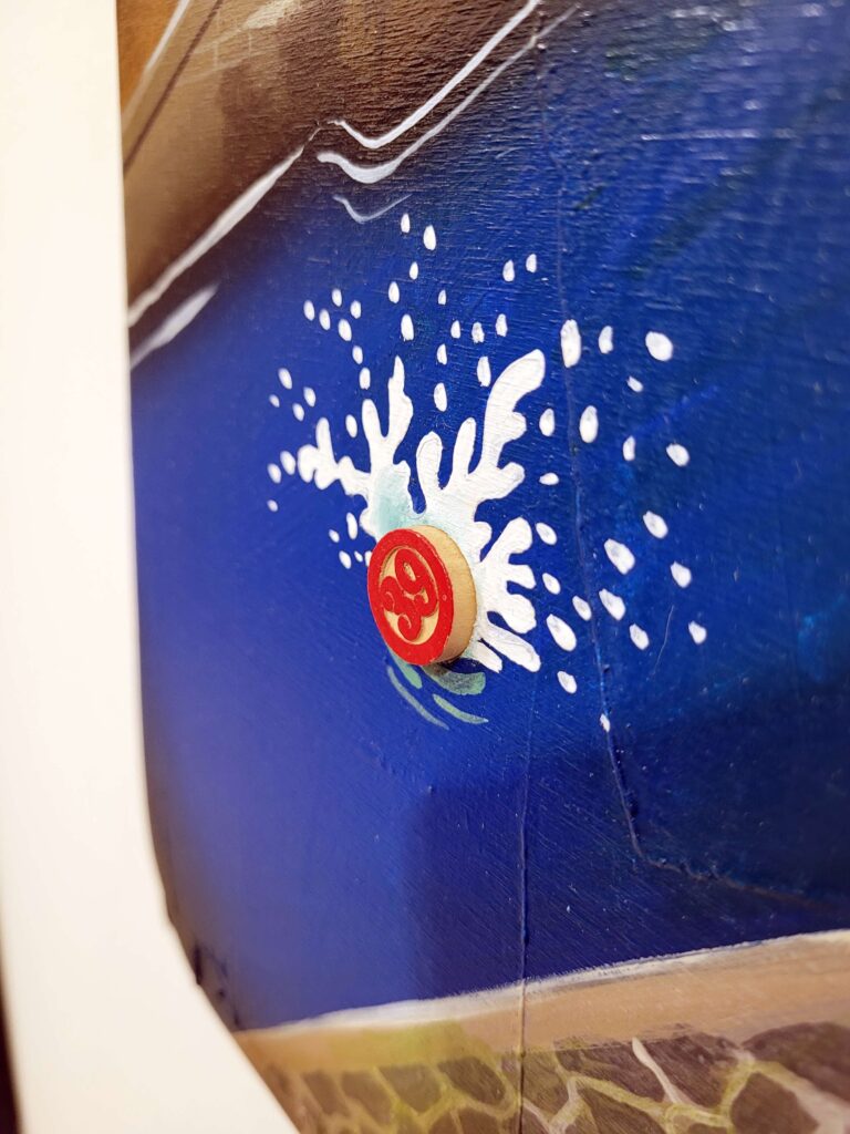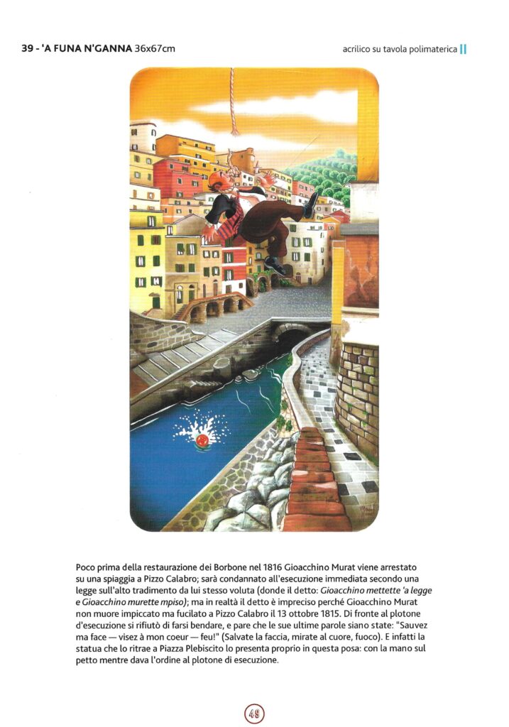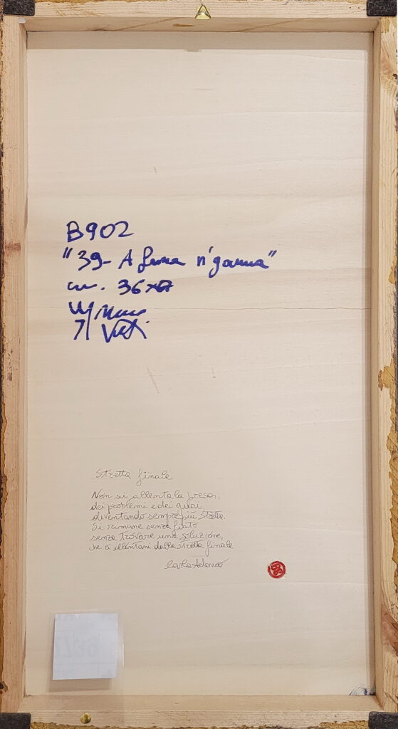 La corda che cinge la gola, secondo la tradizione della Smorfia napoletana, è associata al numero 39. Questa immagine evoca un grande senso di fragilità, sentimenti di disperazione, delusione e sfinimento, indicando una fase particolarmente impegnativa della vita. Tuttavia, l’artista ritrae una corda spezzata, a simboleggiare la speranza per il futuro e la risoluzione dei propri problemi.