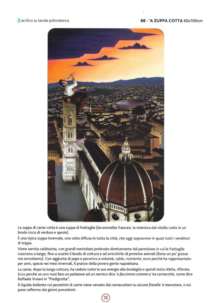 Nella Smorfia napoletana il numero 68 corrisponde a “la minestra cotta”, ovvero una sostanziosa zuppa di carne fatta con frattaglie, in particolare interiora di vitello bollite a fuoco lento in un ricco brodo vegetale. Questa zuppa viene servita bollente, versata generosamente su alcune “freselle”, ovvero fette di pane tostato e sbriciolato, in una grande ciotola. È accompagnata da un buon bicchiere di vino rosso ed è da sempre un piatto base per i meno abbienti, soprattutto durante i mesi invernali. Ma la zuppa non conosce confini di tempo o di luogo, poiché nasce dall’esigenza di utilizzare ciò che è stato considerato il sostentamento umano per eccellenza da tempo immemorabile: il pane. Nel Medioevo, era consuetudine per i nobili cenare con carni e altre prelibatezze su spesse fette di pane, sostituendo di fatto i piatti. Alla fine dei pasti, i resti di questo pane, imbevuti di sugo di carne e altri condimenti, venivano dati ai servi, che poi li facevano bollire con verdure e acqua… ottenendo così una zuppa!