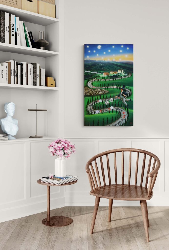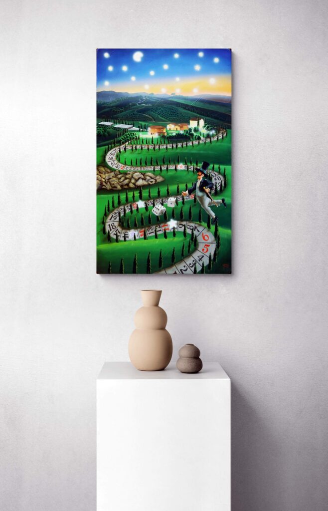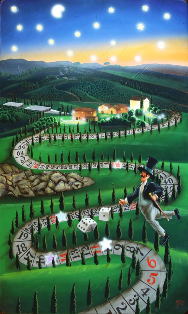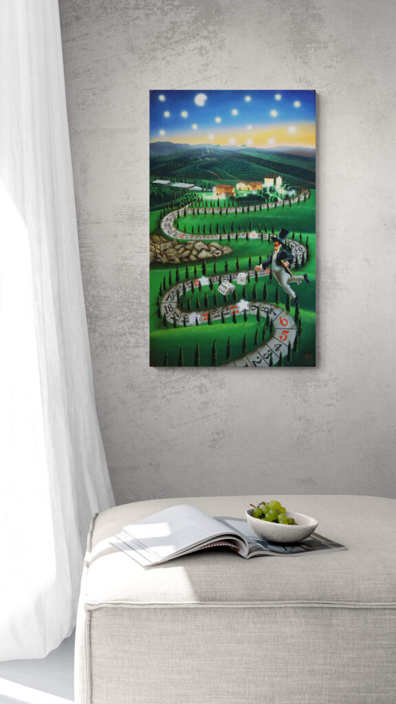 “Camminando un giorno con amici per le Crete senesi seguendo una delle innumerevoli strade bianche, ci trovammo davanti una strada talmente tortuosa che sembrava intrecciarsi. Sembrava proprio una tavola del gioco dell’oca. Quella sensazione da me provata finì subito nel mio blocco che porto sempre con me, e rimase lì per tanto tempo…. diversi tentativi di farla diventare quadro, finché un giorno nacque questo quadro ambientandola però nella vicina Val d’Orcia in provincia di Siena.”