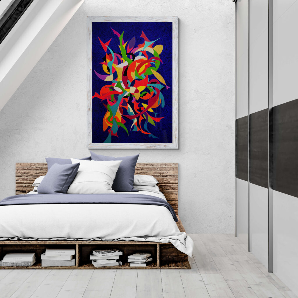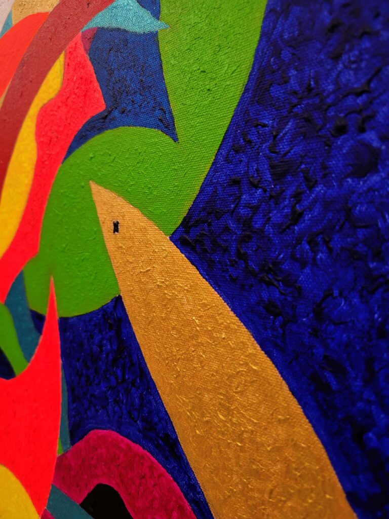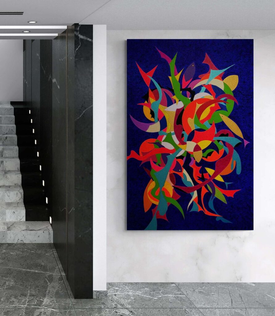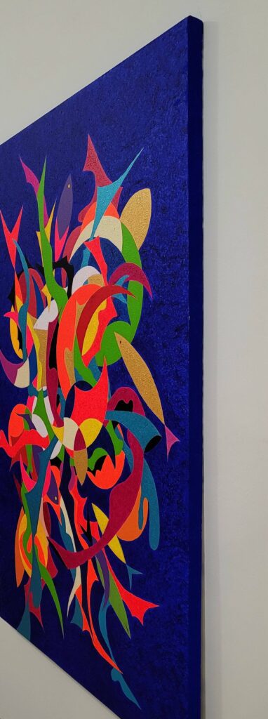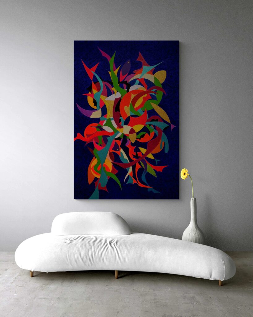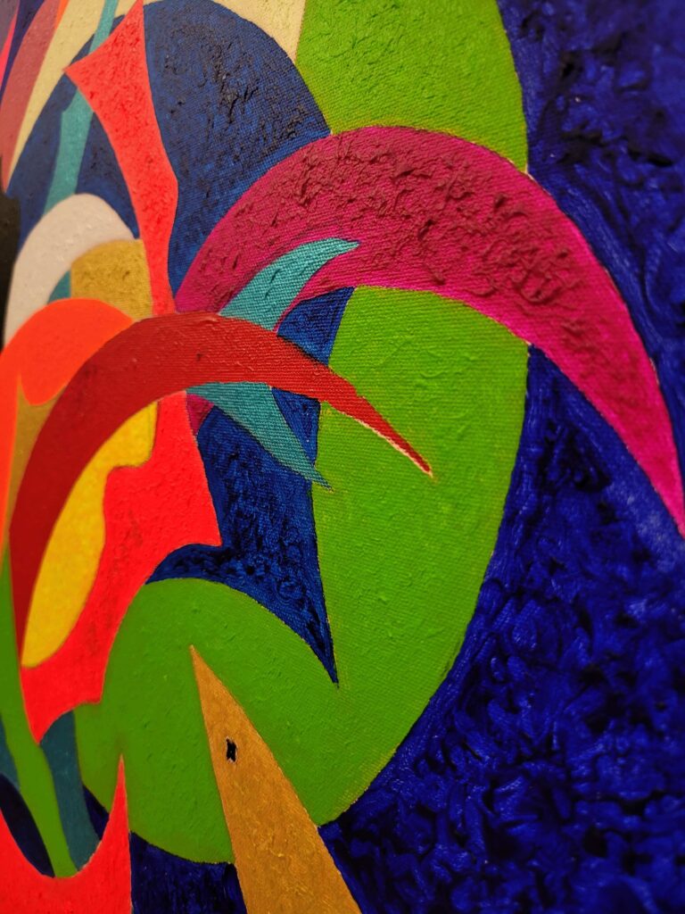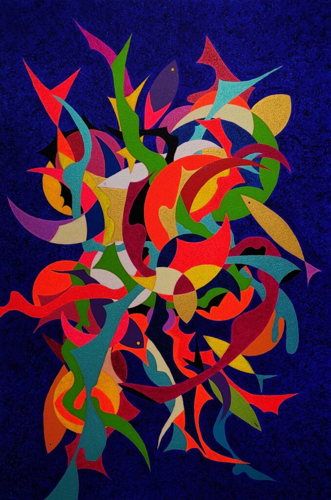 Attraverso il linguaggio dell’espressionismo geometrico, ho cercato di catturare il dinamismo del movimento, rappresentando il contrasto tra le forme rigide e quelle fluide, in un intreccio che riflette l’armonia e la tensione insite nella danza stessa. Ogni linea, ogni angolo e curva suggeriscono la musica interiore che guida i corpi, rendendo l’opera non solo una celebrazione del movimento fisico, ma anche un omaggio alle emozioni che si sprigionano con ogni passo, coinvolgendo lo spettatore in un viaggio sensoriale e riflessivo.’’
