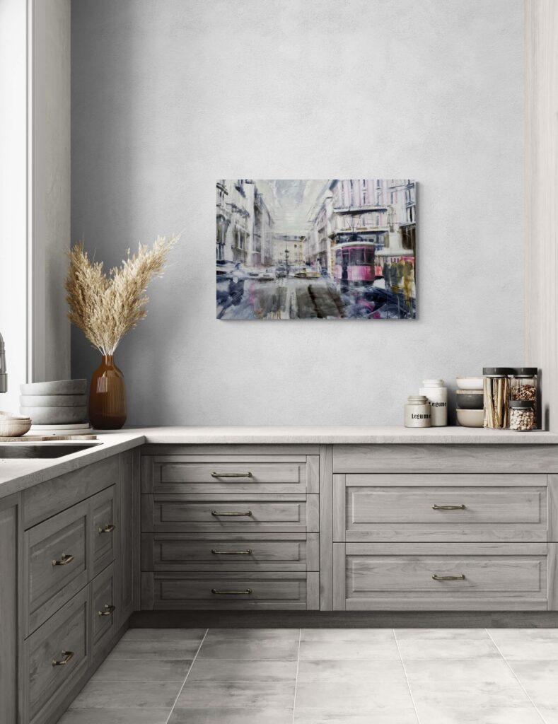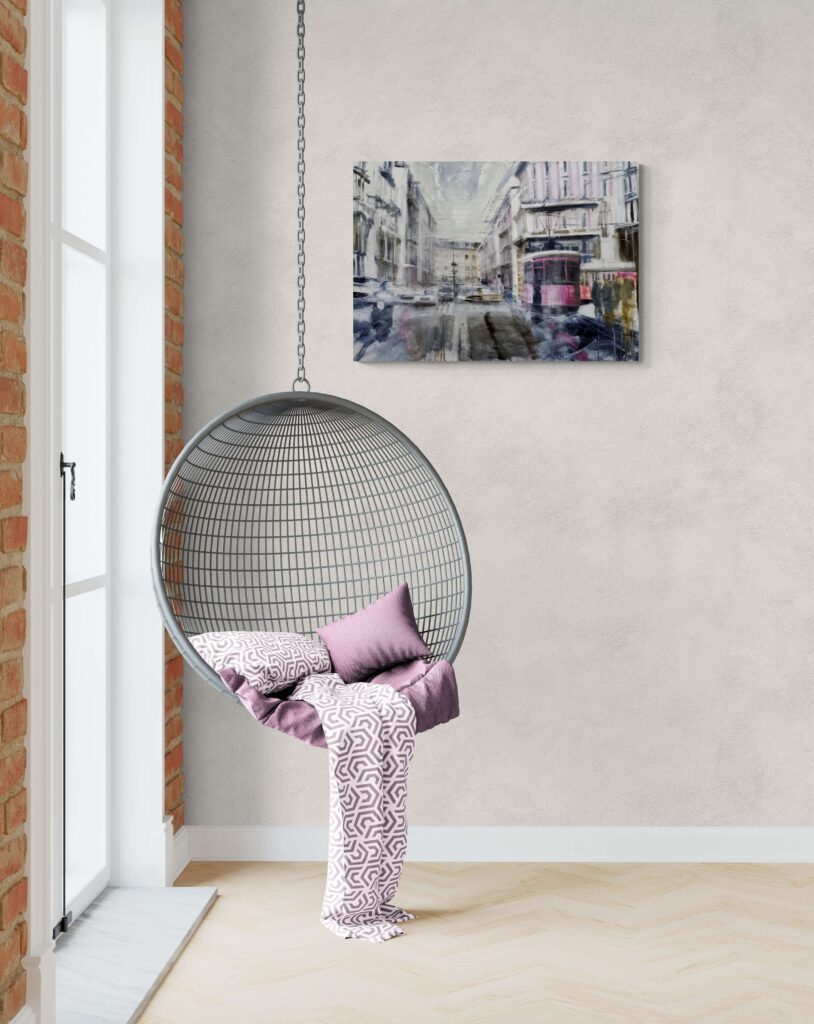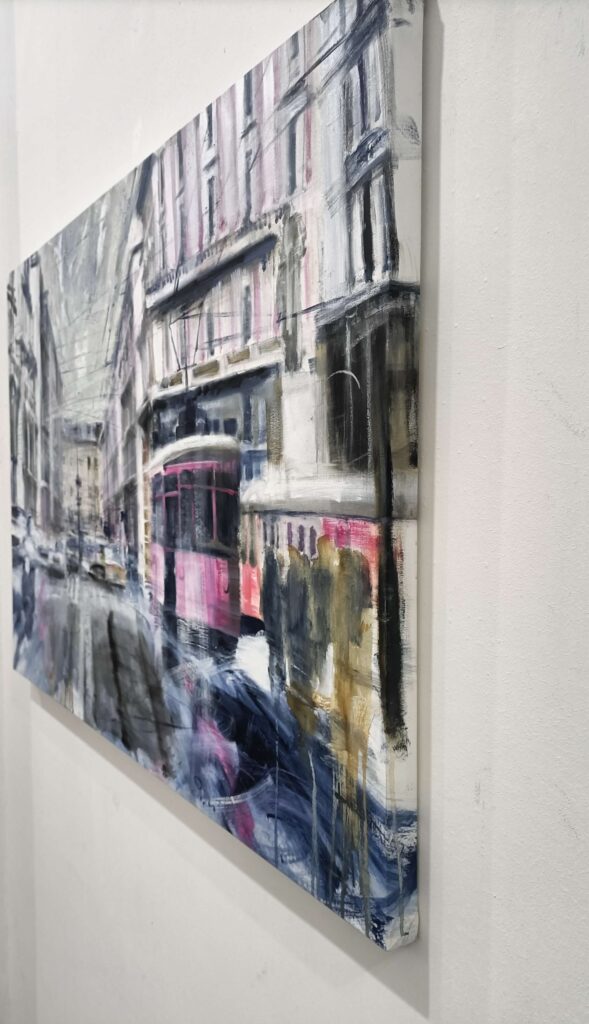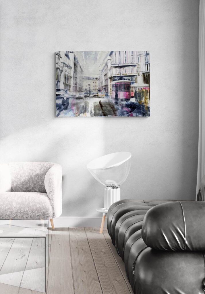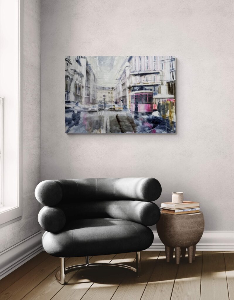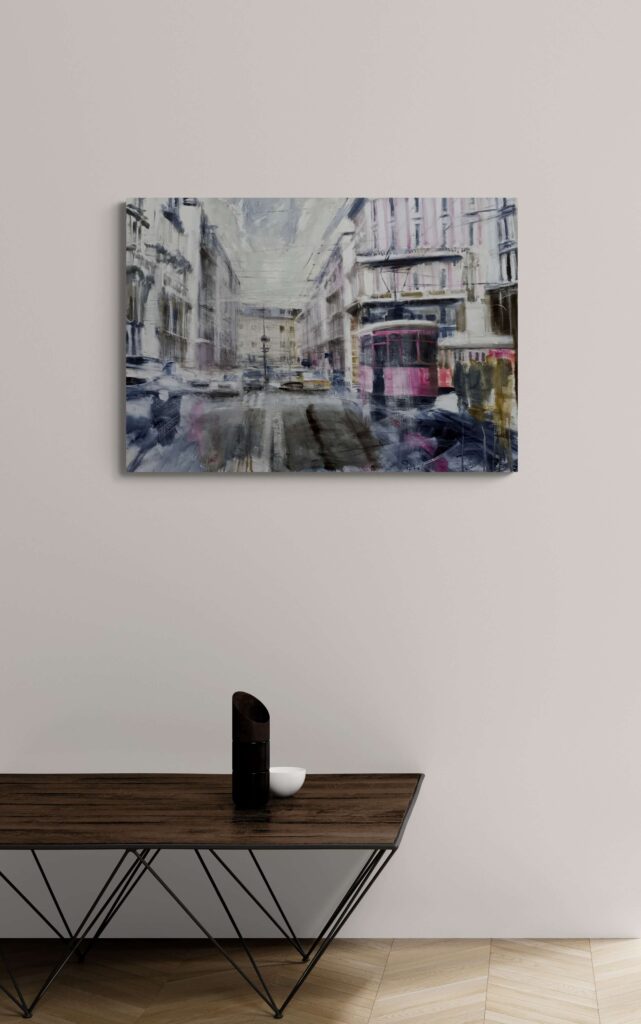 Per realizzare questo dipinto mi sono ispirato a Milano, ai suoi filobus ed ai suoi contrasti tra antico e moderno, ai suoi palazzi nobili che si adattano perfettamente con l’atmosfera urbana segnando prospettive e linee di fuga coi corsi e le strade. L’atmosfera è grigia, nordica, quasi anonima, creando sensazioni apparentemente dimessa, in netto contrasto col carattere deciso della città.