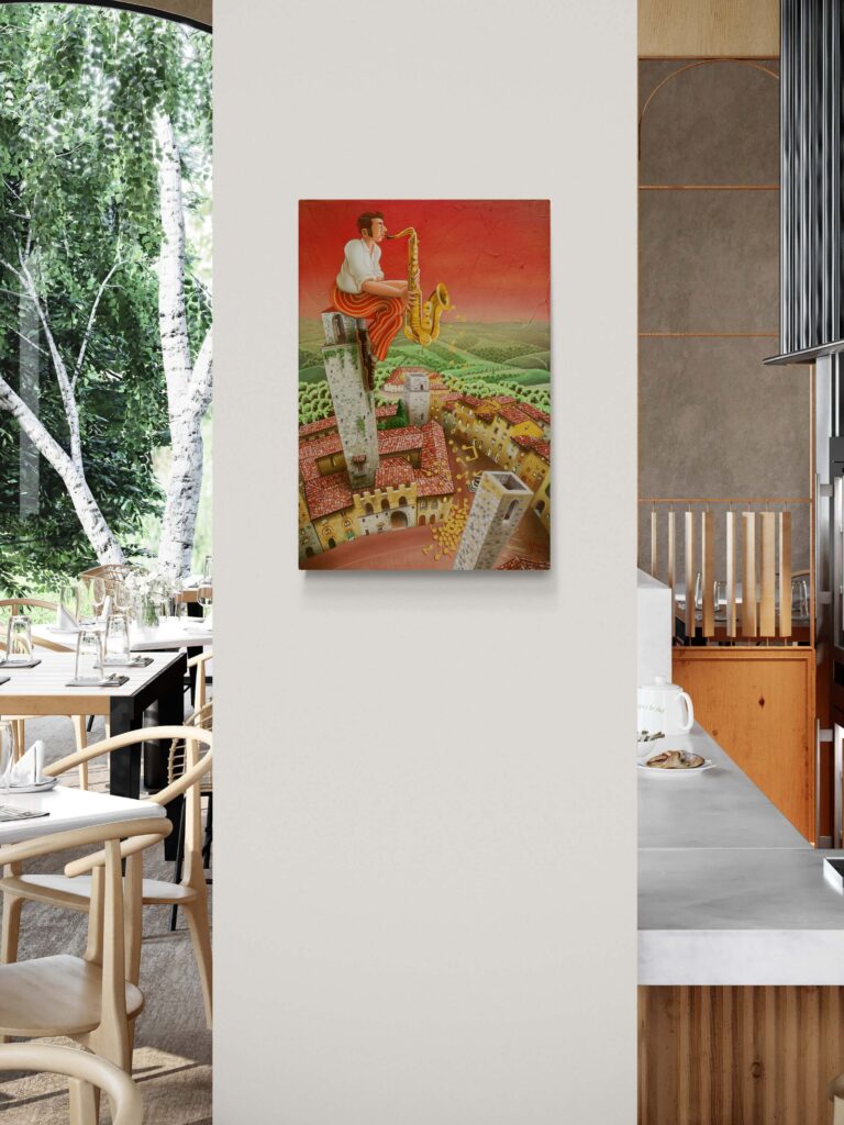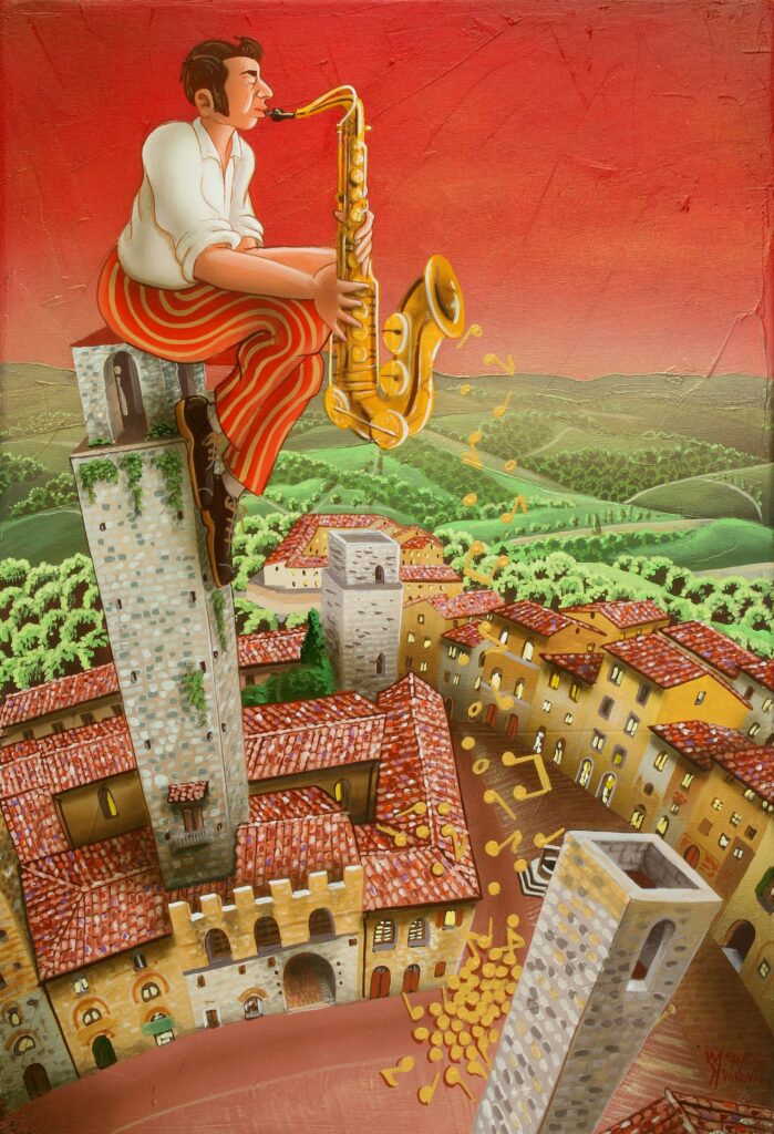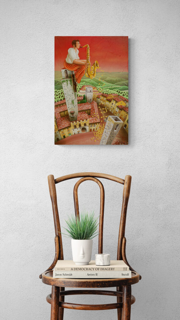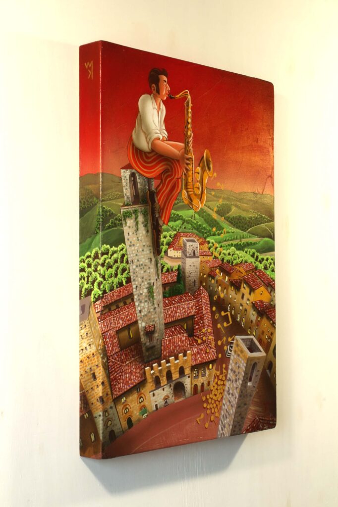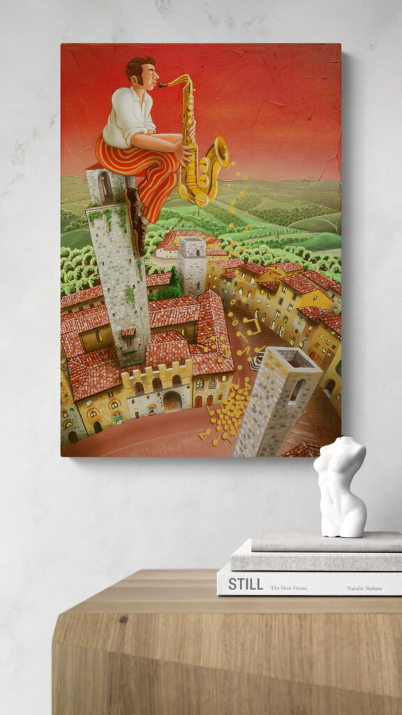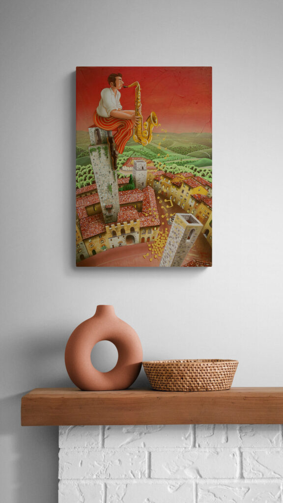 Così, in questo quadro, ho voluto catturare quell’attimo unico che regala San Gimignano, uno dei miei luoghi prediletti, dove anche un semplice suono diventa un dono per l’anima.