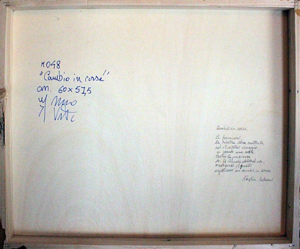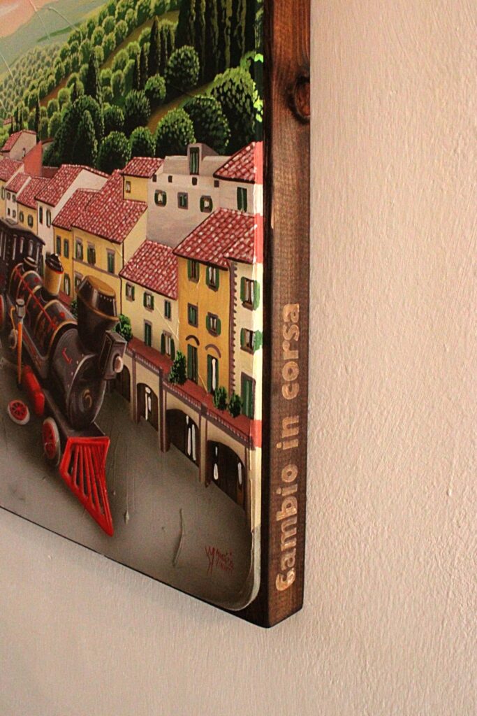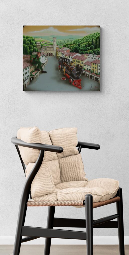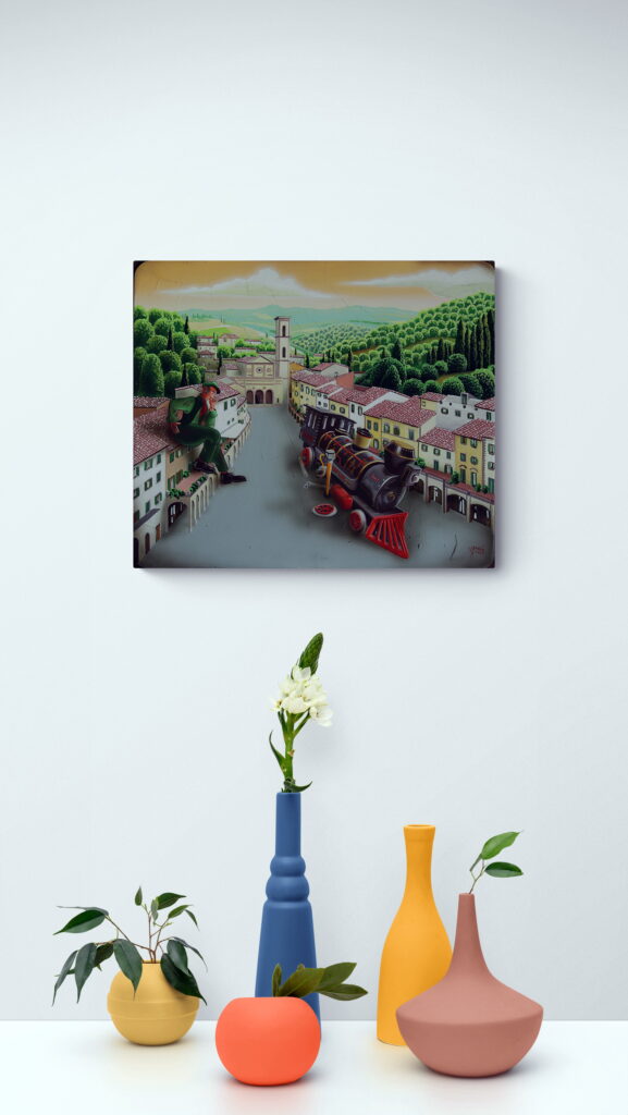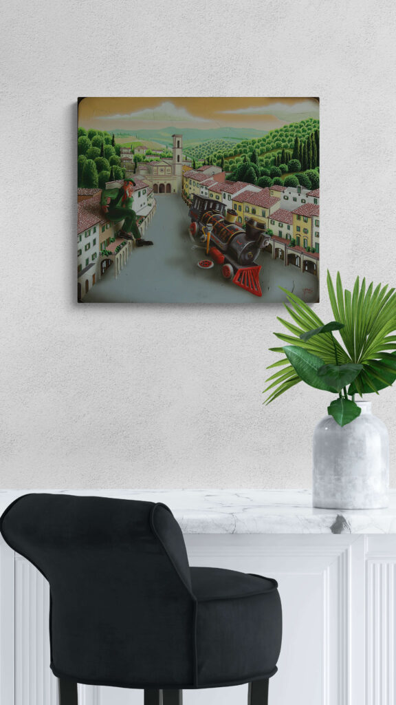 ”Questo è un quadro della memoria. Quand’ero piccolo e passavo l’estate all’inizio della strada (con molta salita) che portava fin su quella piazza dipinta. E mi faceva sorridere l’idea che fino a poco tempo prima ci arrivava il treno. E quando si guastava non c’era altro mezzo che… camminare… perché là cavalli non c’erano. Solo buoi!”