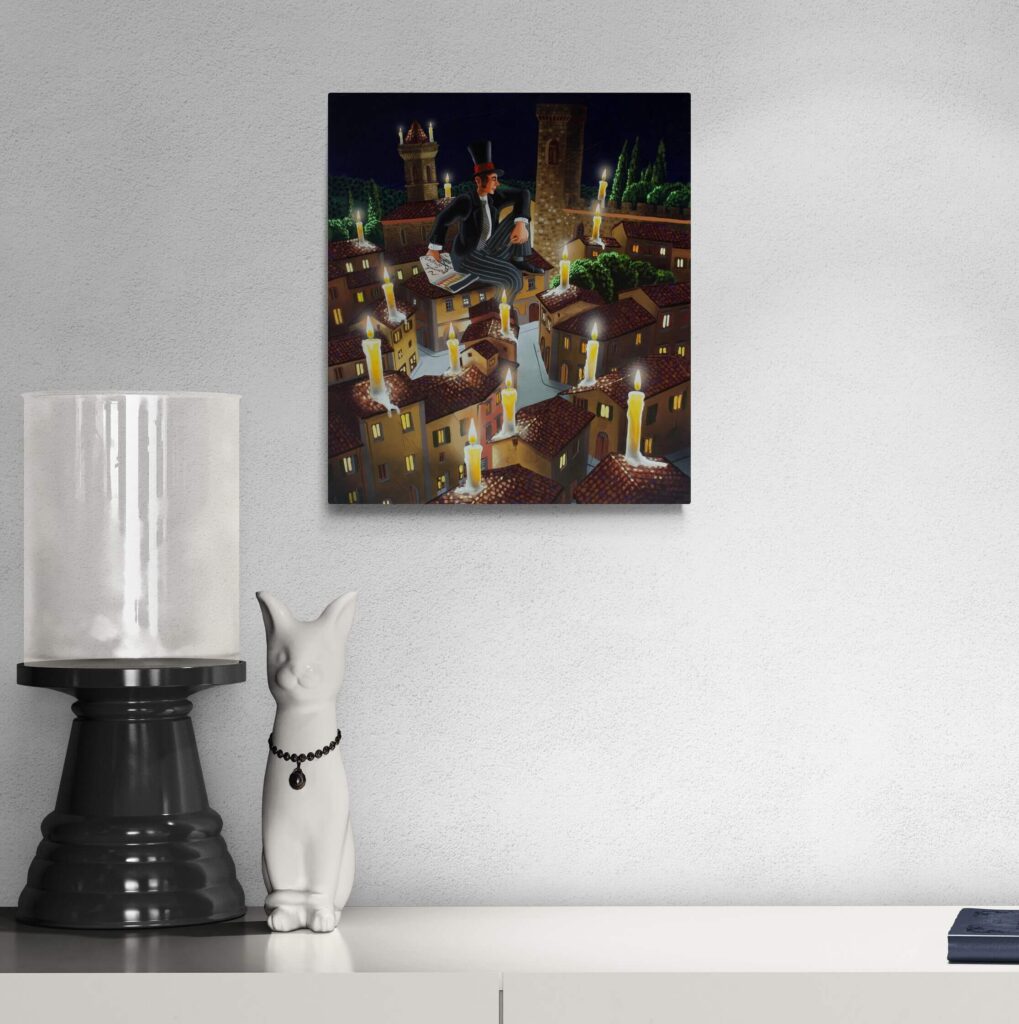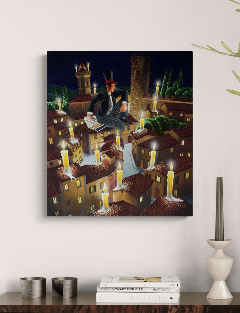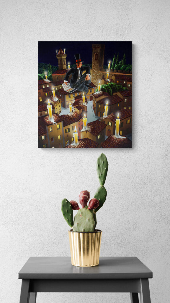 Nel quadro, per accendere le candele, non bastano accendini anonimi: servono i cerini profumati, proprio quelli che mio padre regalava ai suoi clienti a Natale, nel suo negozio da barbiere. O magari… anche quei cerini un po’ birichini, capaci di far sorridere la notte.