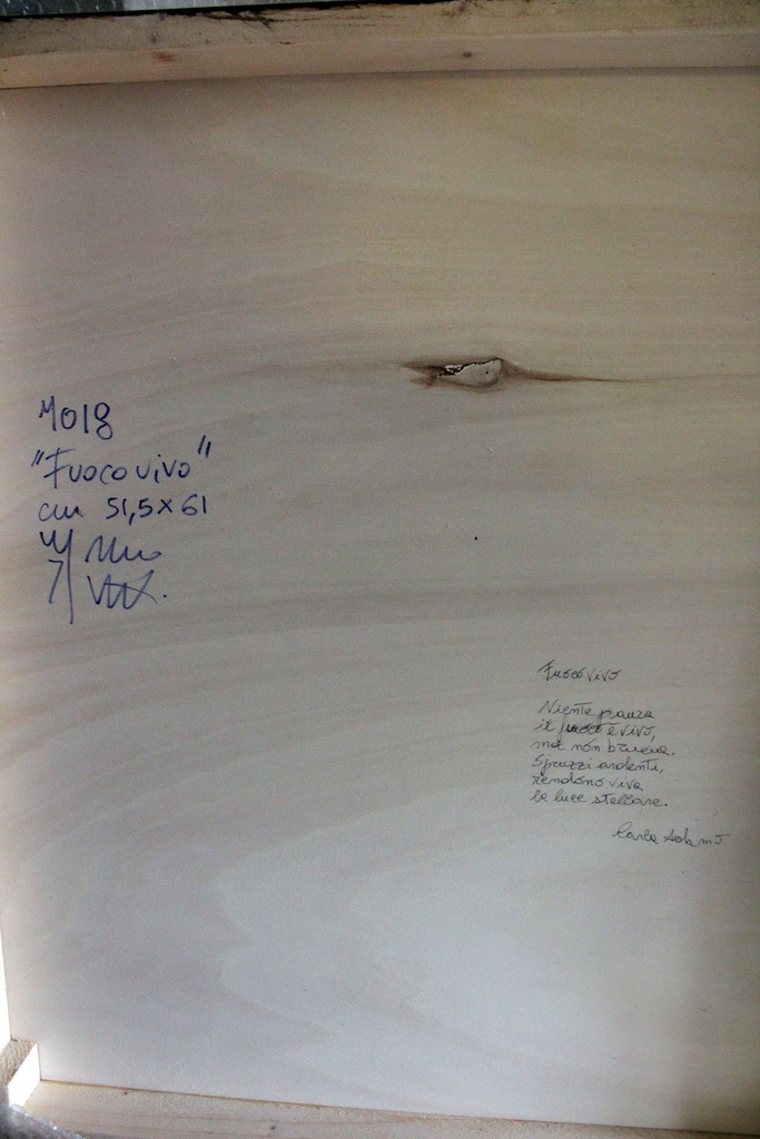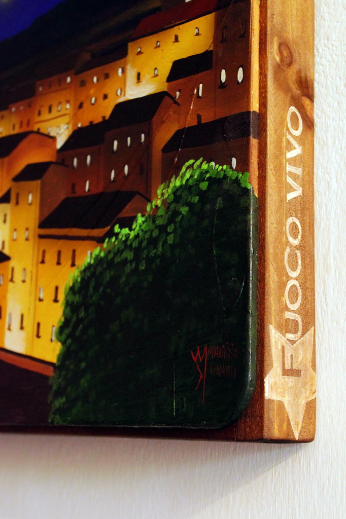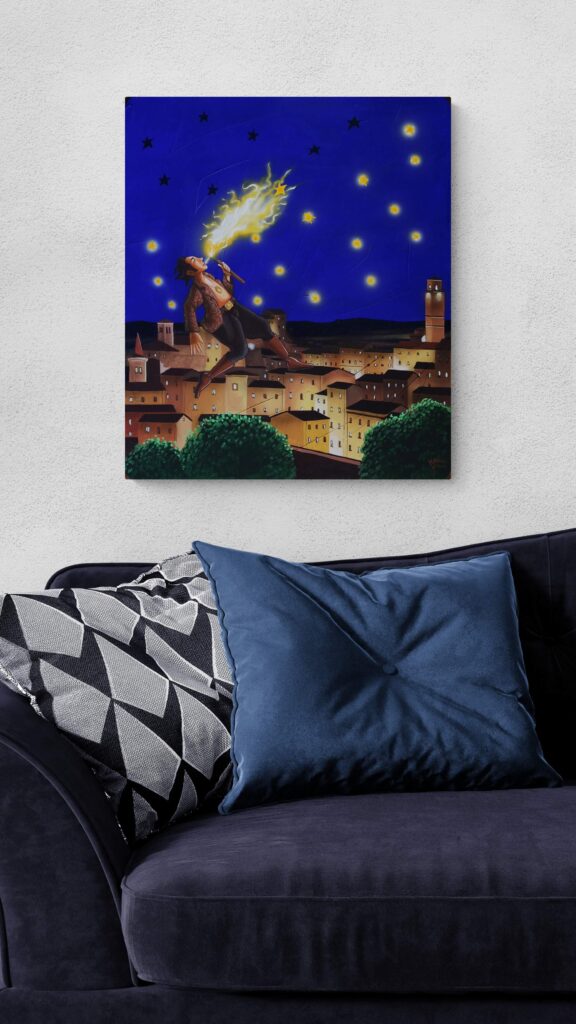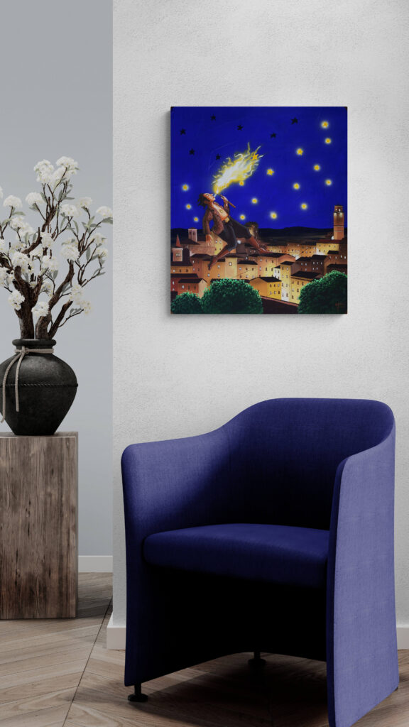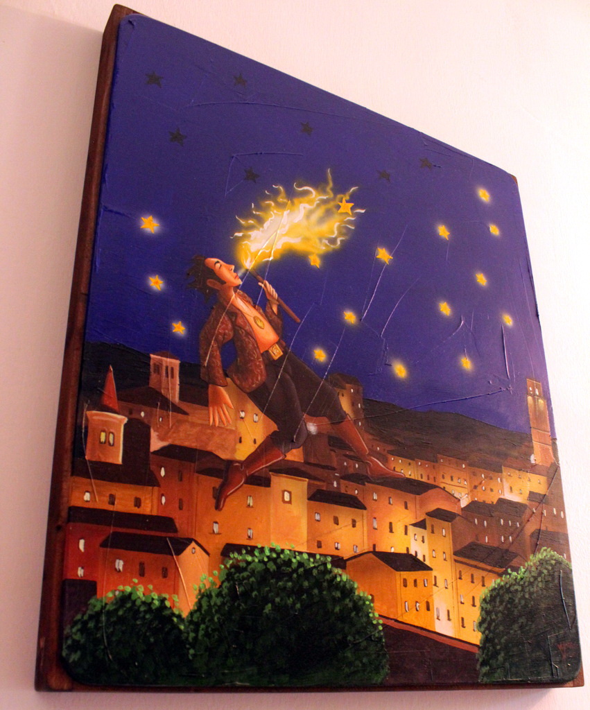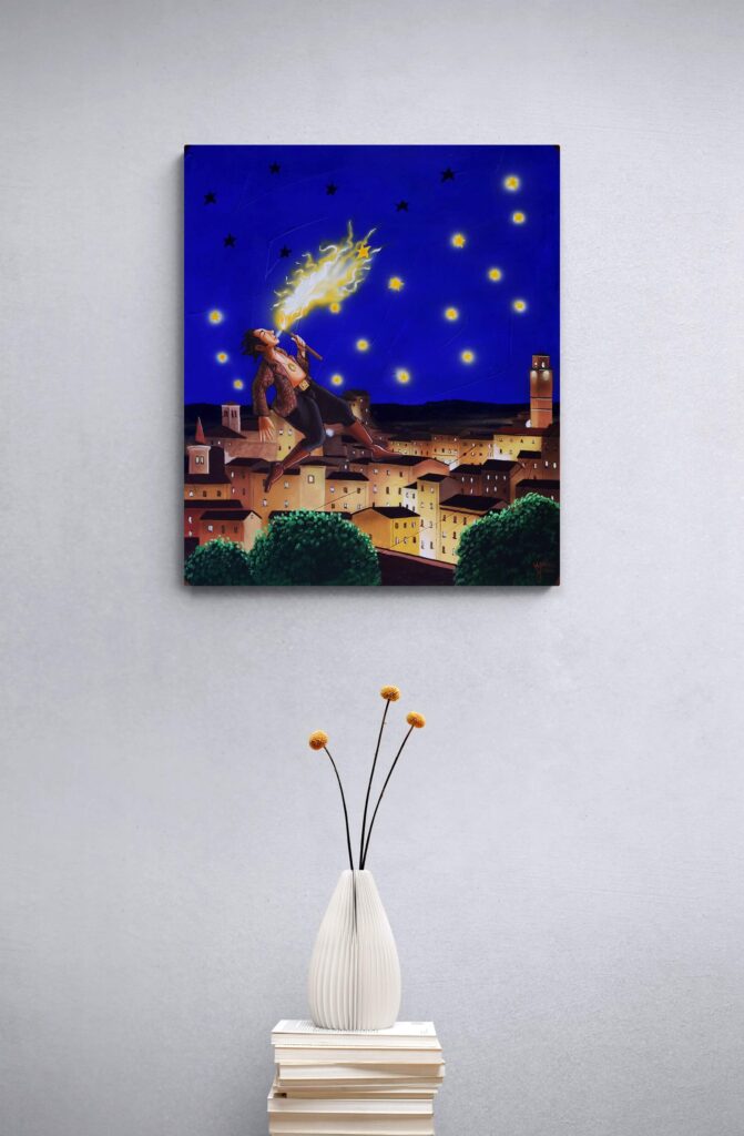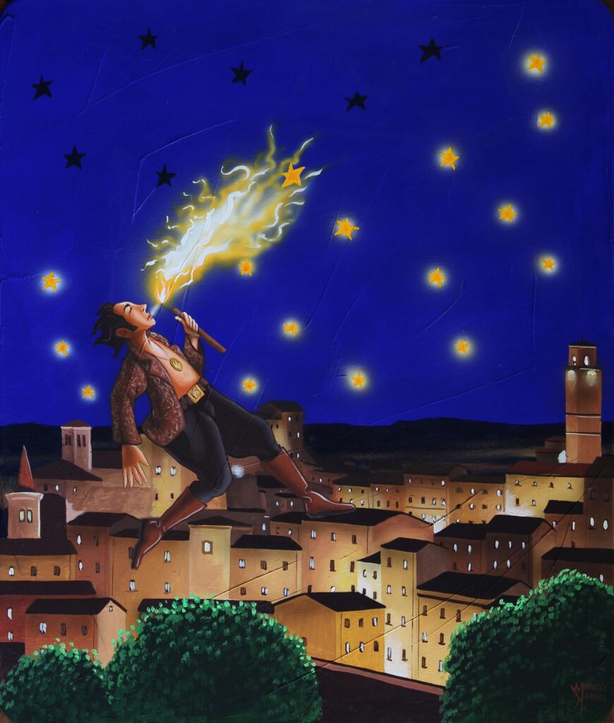“Ho sempre cercato di capire come si accendono le stelle… qualche volta premendo un interruttore, altre volte usando un cerino…. ma questa volta mi sono spinto oltre. Visto che ad Anghiari, ho visto un mangiatore di fuoco… un quadro così mi sembra il minimo.”