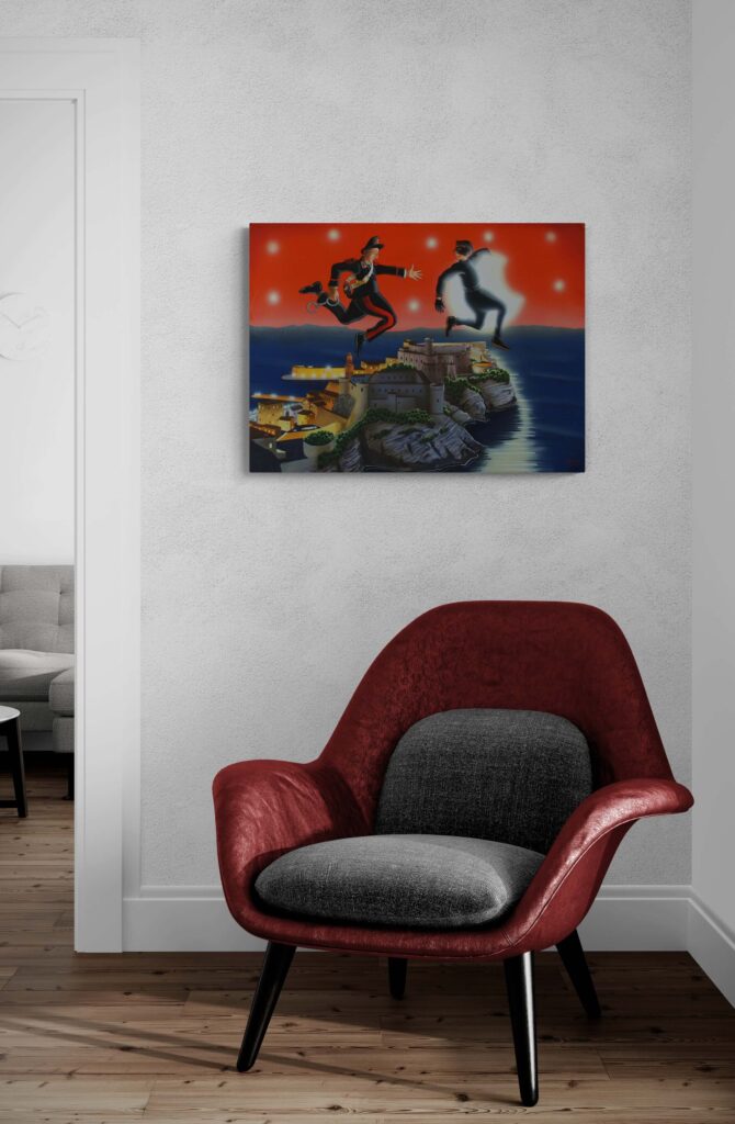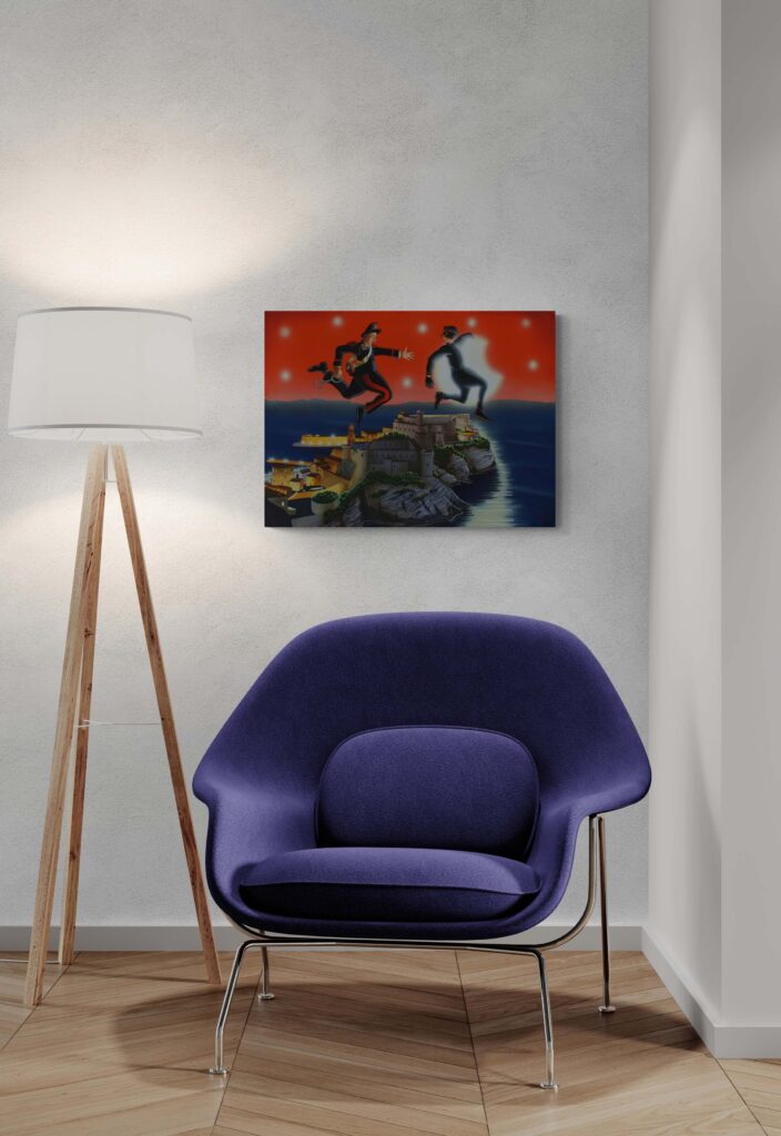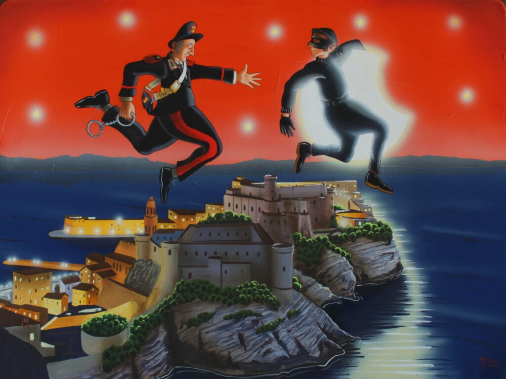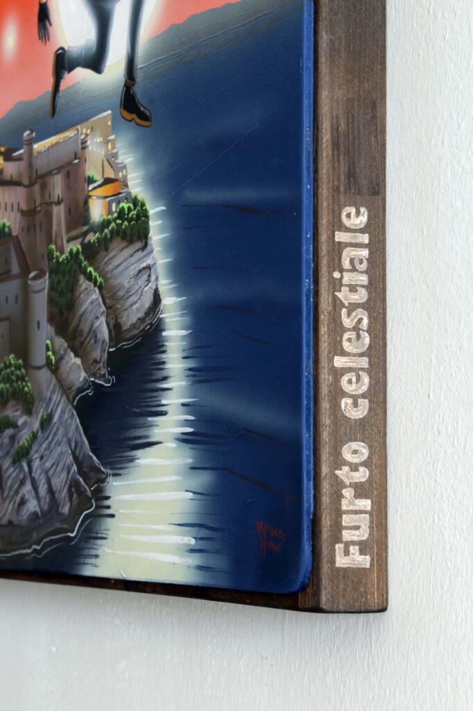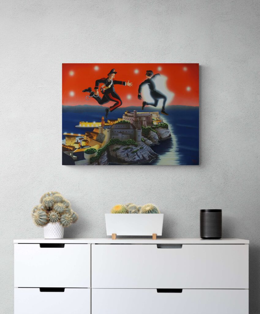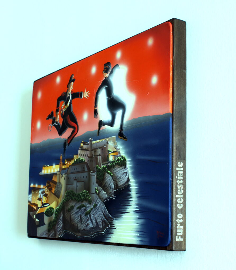 “Mi sono spesso chiesto dove vada a finire la luna quando non la possiamo vedere. Potreste dire: “dall’altra parte della Terra”. Ma per me non è così semplice; sono convinto che qualcuno la rubi ogni sera e la porti via, e poi la polizia la riacciuffi, arrestando il colpevole. Ho pensato di ambientare questa storia a Gaeta, dove si trova una delle carceri più grandi d’Italia, in un antico castello. Un quadro prende vita anche quando visiti casualmente un luogo che ti colpisce profondamente.”