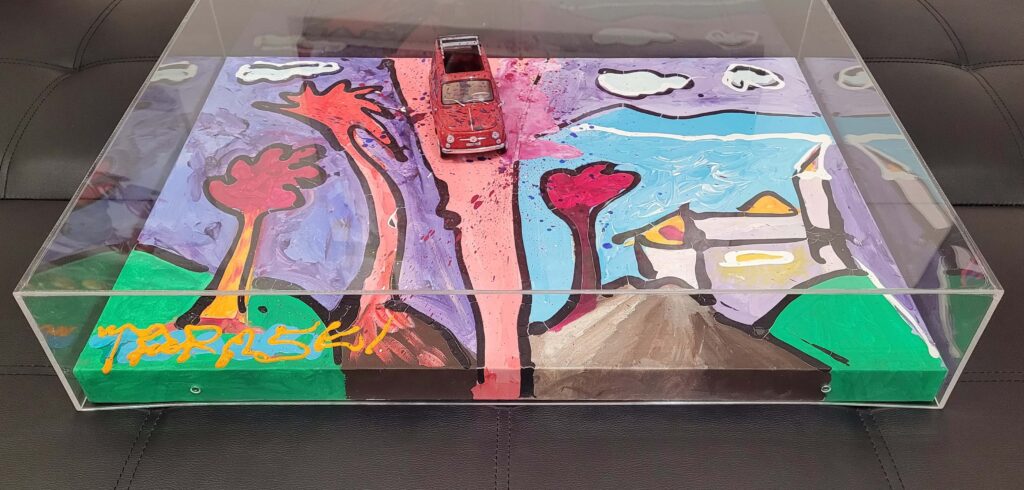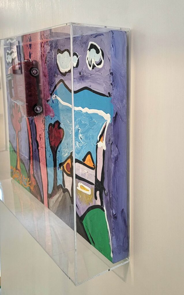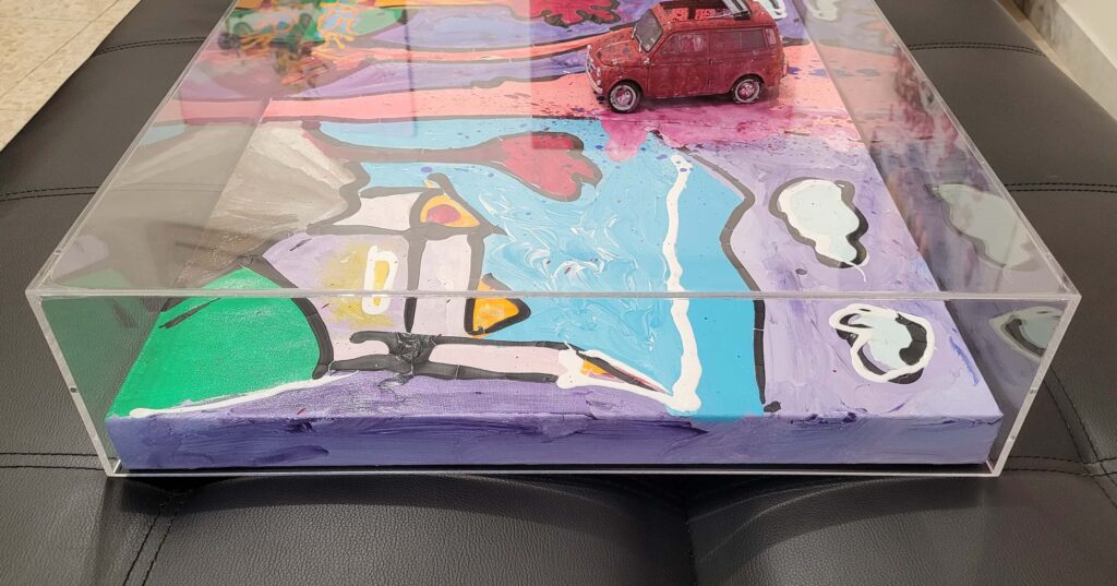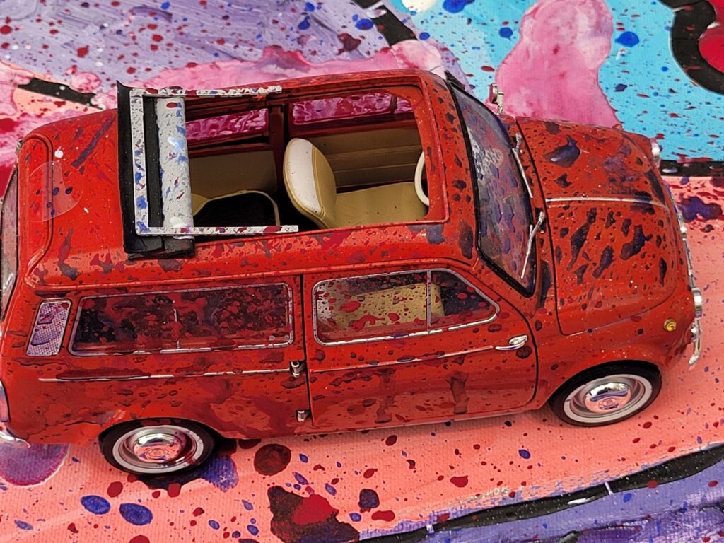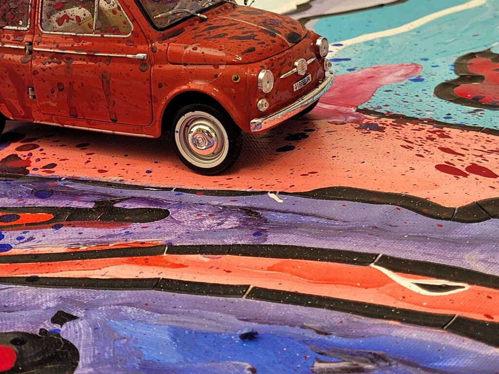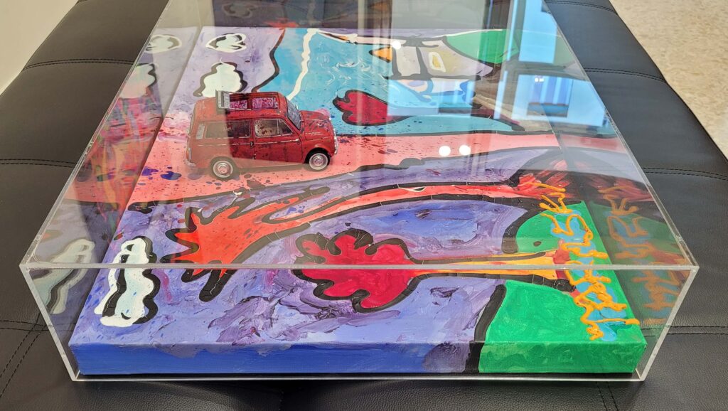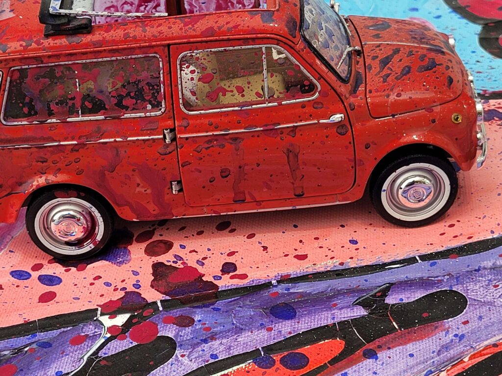 Tecnica: Acrilico, smalto ad acqua, permanent marker, modellino scala 1:18 su tela in box di plexiglass