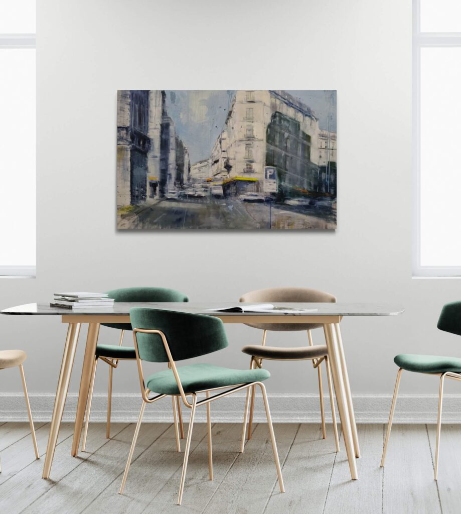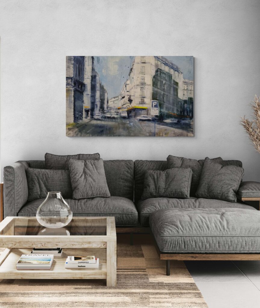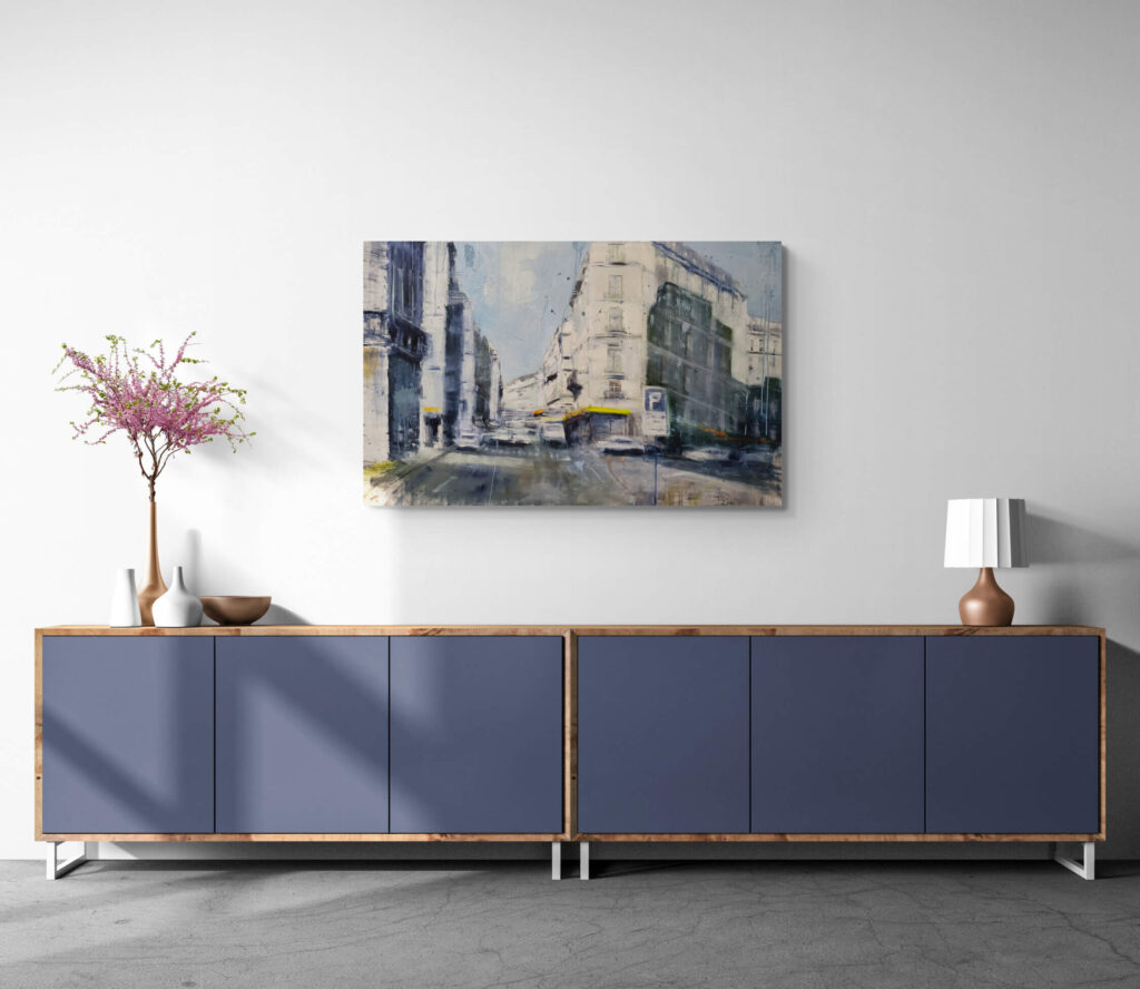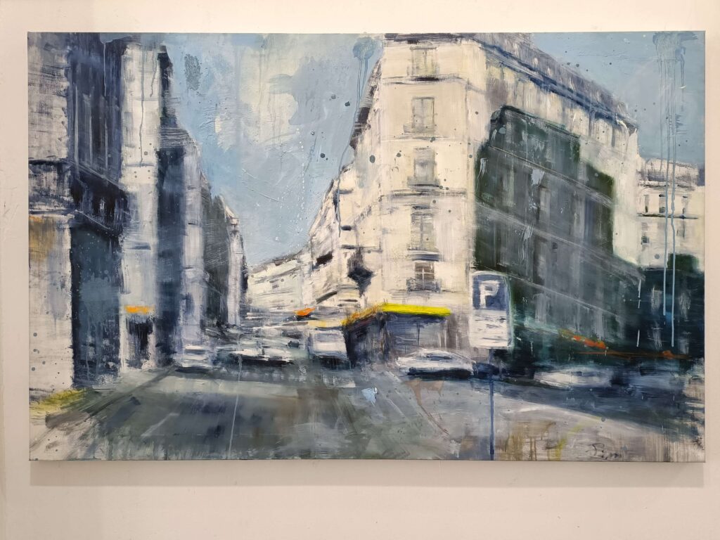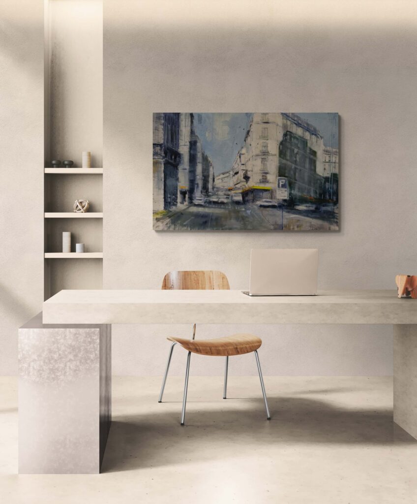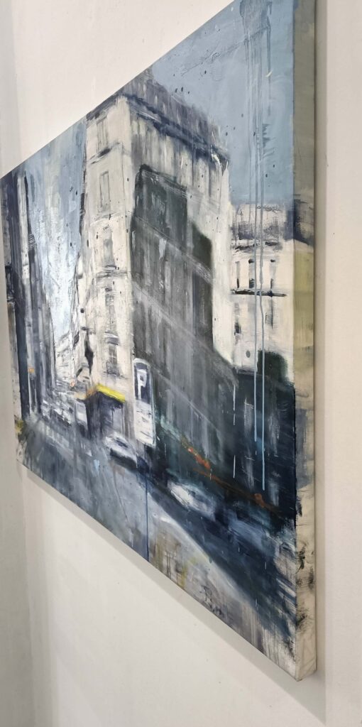 Quest’opera cattura l’anima vibrante della città contemporanea attraverso un affascinante intreccio di luci e ombre. L’artista fonde con maestria realismo e astrazione per evocare il ritmo incalzante della vita urbana, dove edifici, strade e figure umane emergono da pennellate che restituiscono la simmetrica imperfezione del reale. Le ombre dialogano con la luce, creando un mosaico visivo che racconta storie silenziose di quotidiano splendore e disordine. È un invito a osservare più a fondo, a scoprire la bellezza nascosta e la complessità poetica che si celano dietro ogni angolo della città.