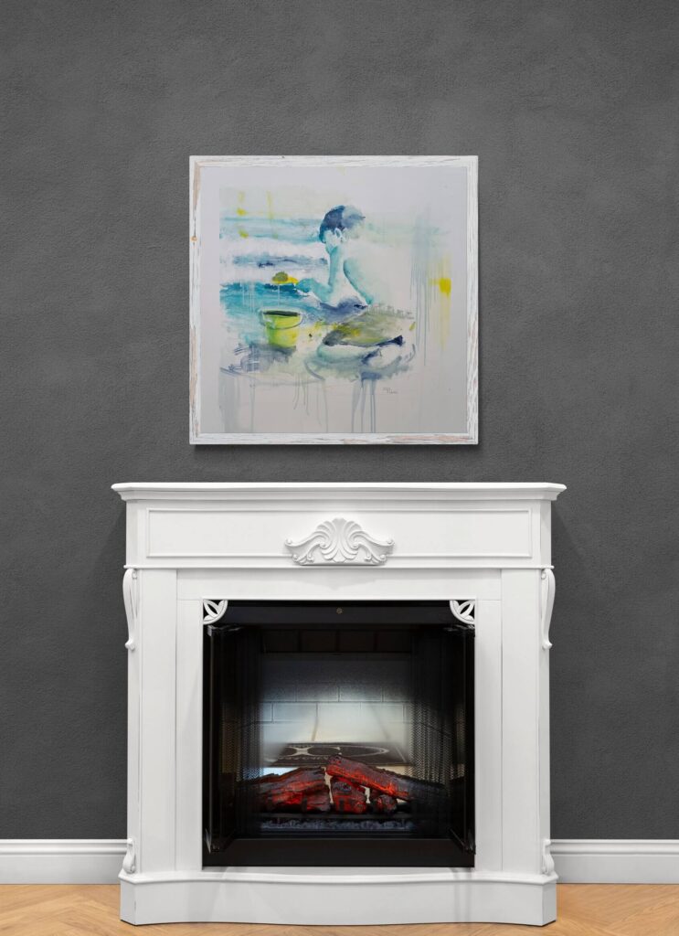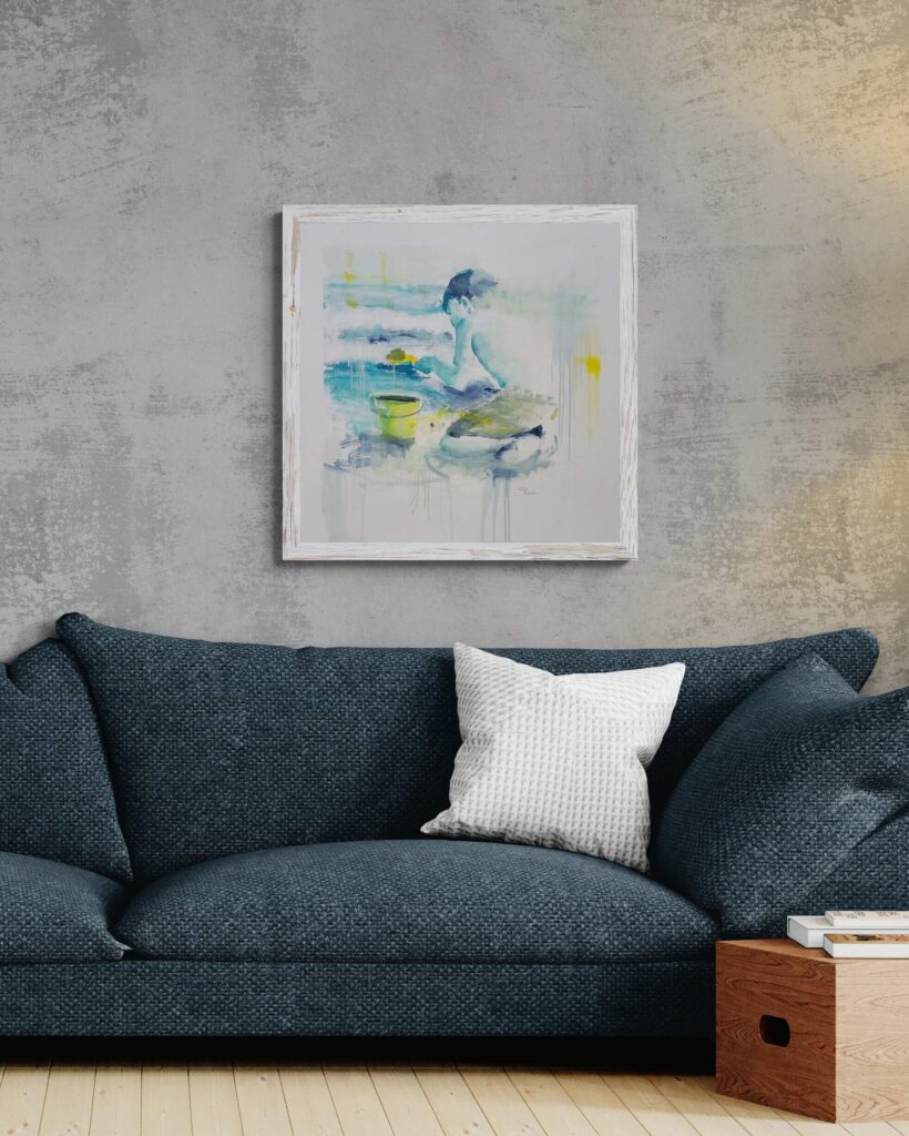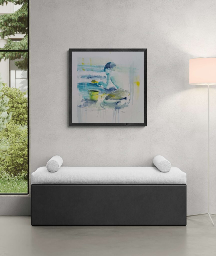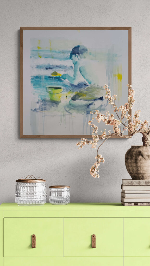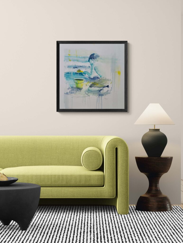 La composizione è attraversata da velature delicate e colature leggere che dissolvono i contorni, trasformando la scena in una percezione più che in una descrizione. La luce non definisce, ma avvolge: costruisce uno spazio emotivo silenzioso, in equilibrio tra presenza e introspezione.