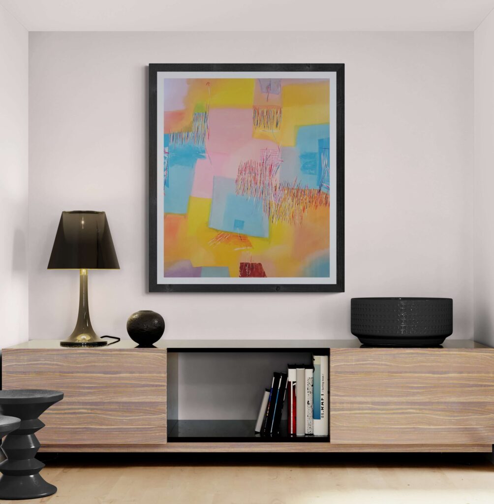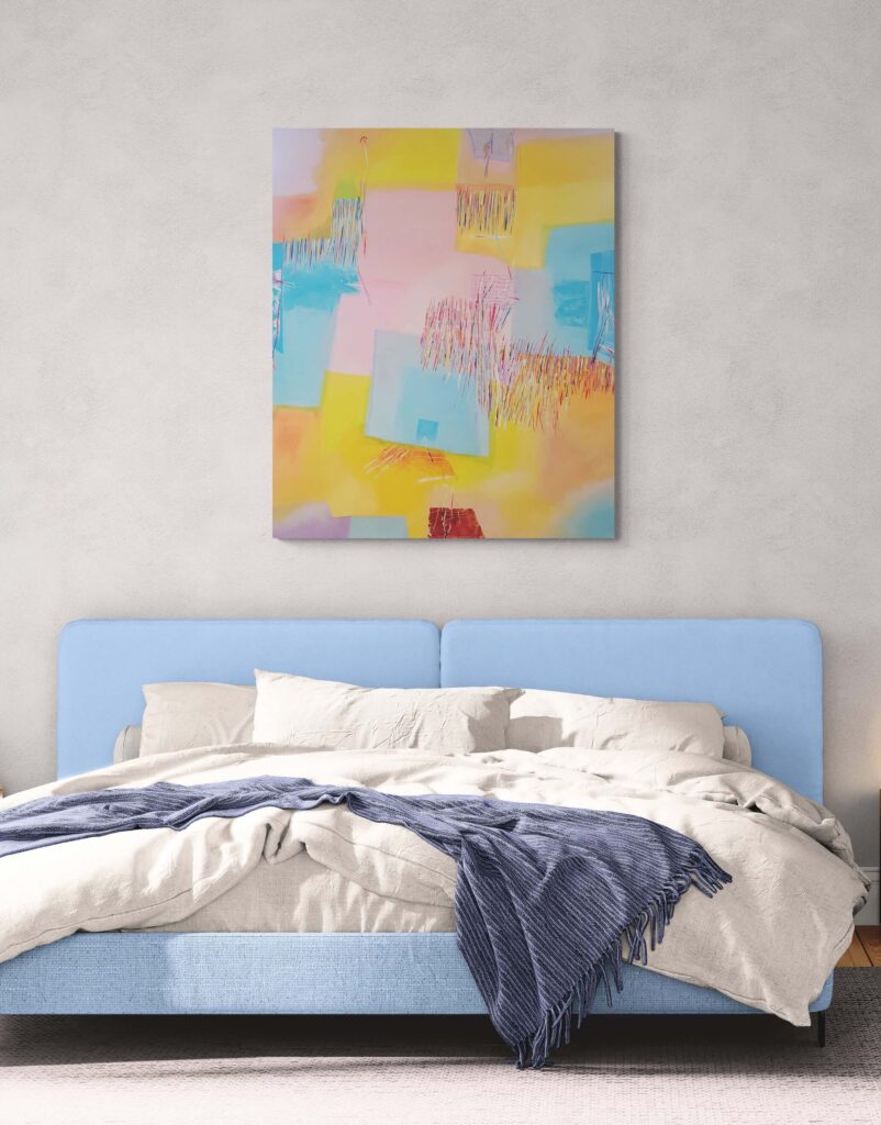 “Invasion” segna una rottura netta rispetto ai paesaggi più riconoscibili di Bazzoni. Qui, il linguaggio si fa astratto e vibrante: campiture di colori caldi e freddi, sovrapposti e interrotti da segni lineari multicolori, creano una tensione dinamica. L’“invasione” evocata dal titolo sembra più una penetrazione di energie e direzioni, un moto di espansione che rompe la quiete e porta con sé vitalità e disordine creativo. L’opera appare come una mappa emotiva, un campo aperto di forze in conflitto e in dialogo.