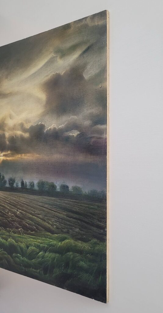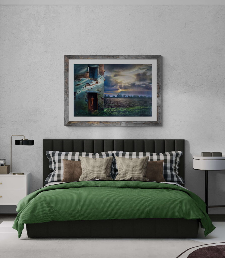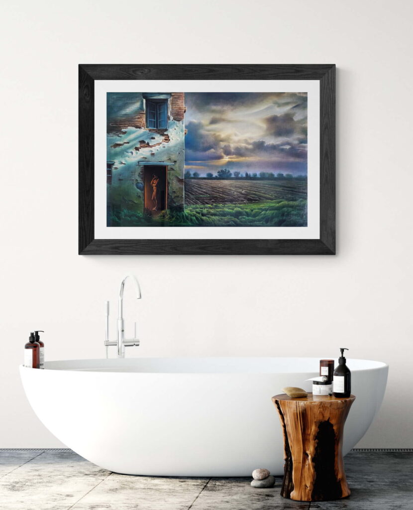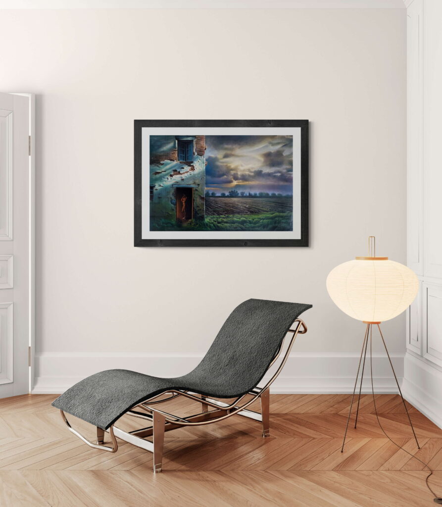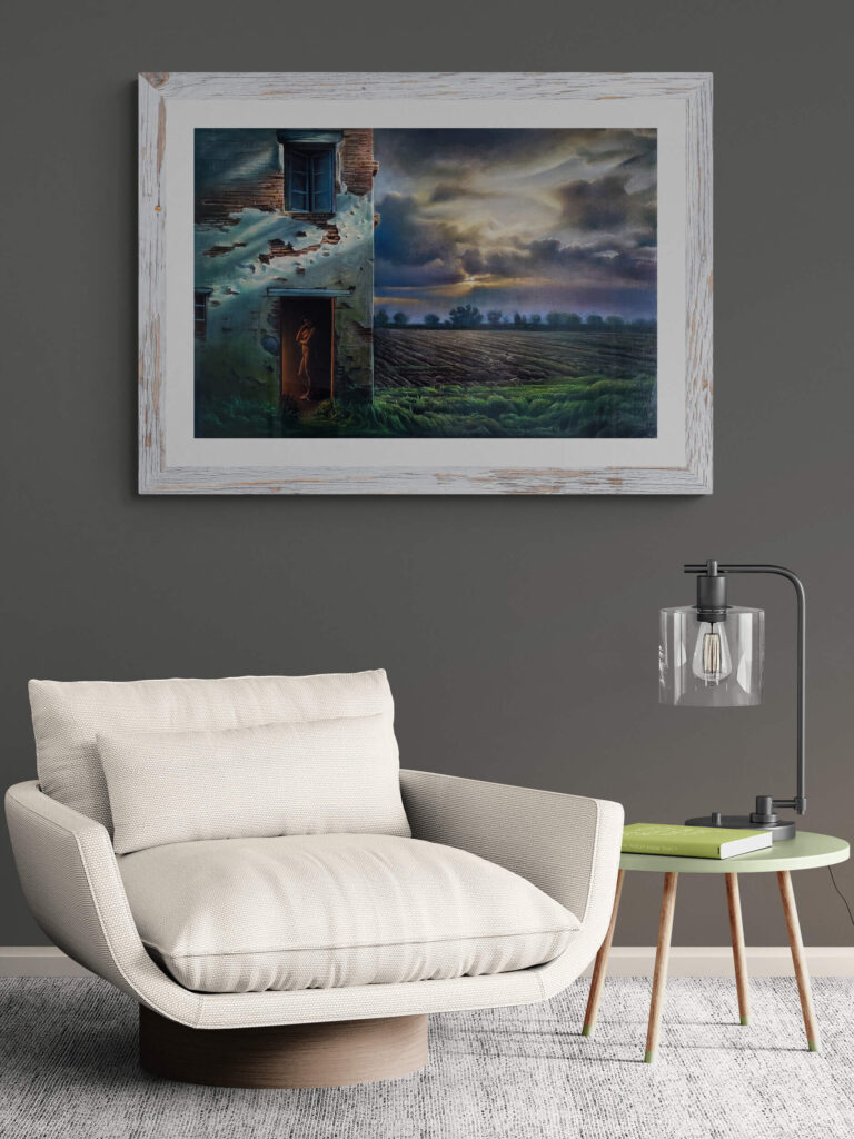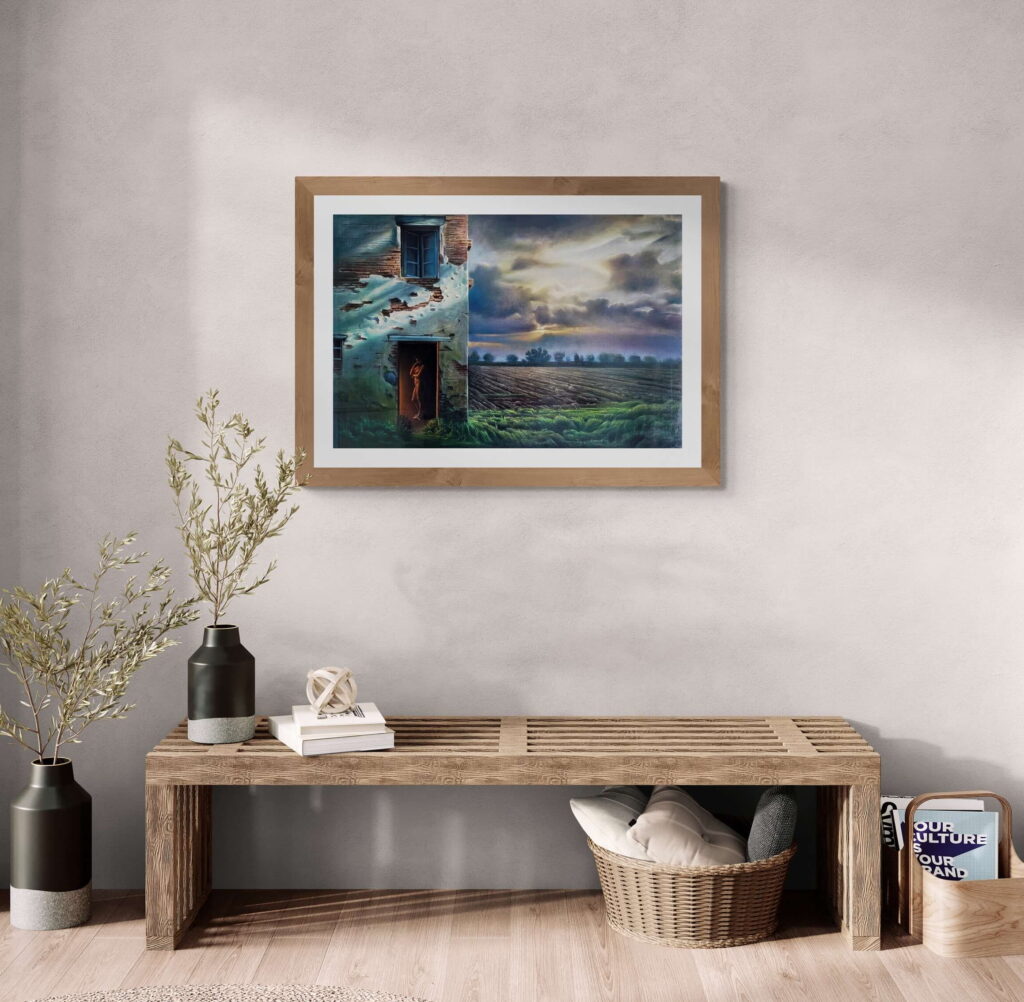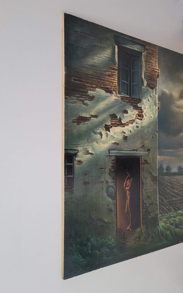 “Nonostante il titolo si tratta di una casa realmente esistente che mi ha colpito per l’interessantissima luce di taglio che ne colpisce il muro. Ho aggiunto poi uno scorcio dell’interno con una figura femminile che evoca come luogo accogliente e caldo.”