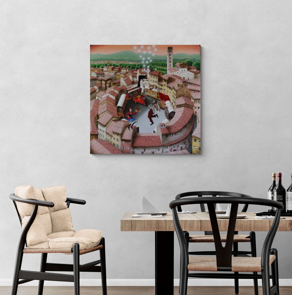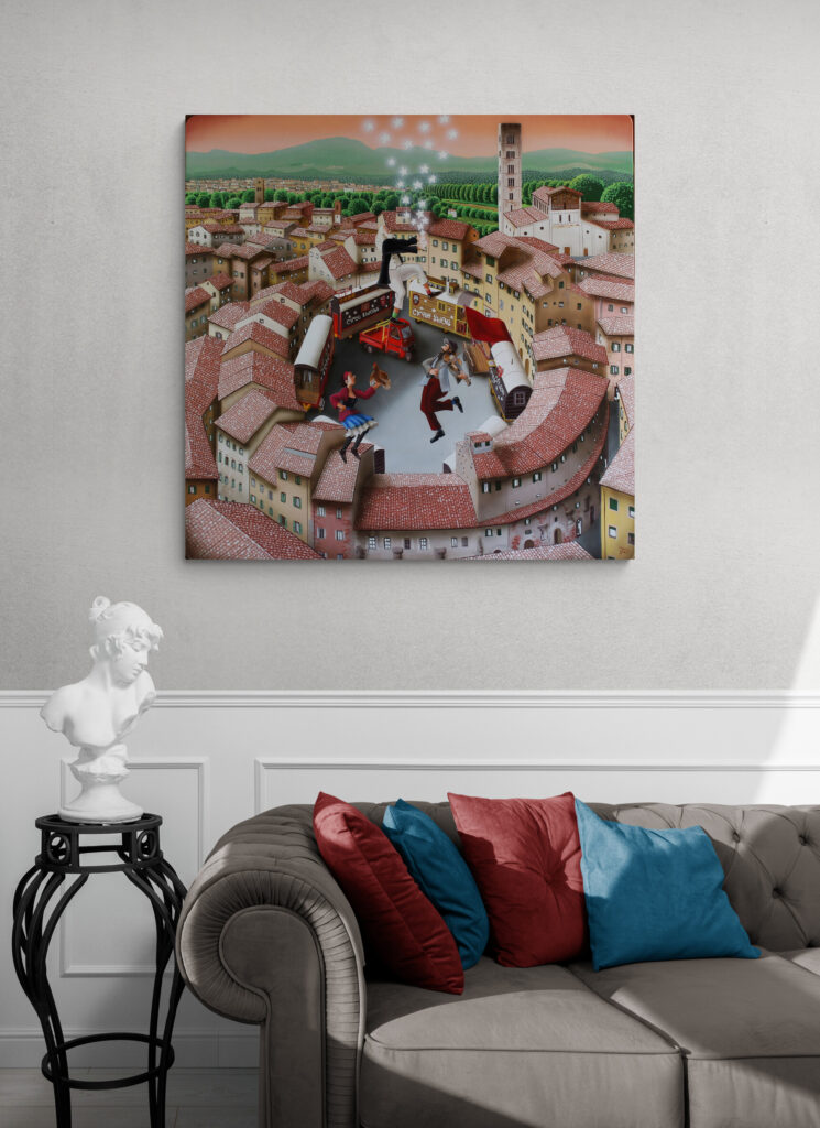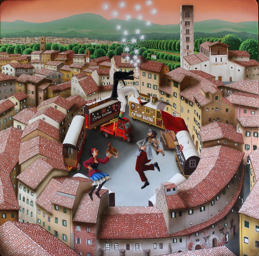 “Da sempre il circo usa come simbolo le stelle. Ci illumina e ci diverte. Il Circo Bidon gira l’Europa con le sue stelle bianche dipinte sui magici carrozzoni e, come una stella cometa, lascia una scia stellare durante i suoi viaggi. Dedicato al mio amico pittore Giuliano Zoppi.”