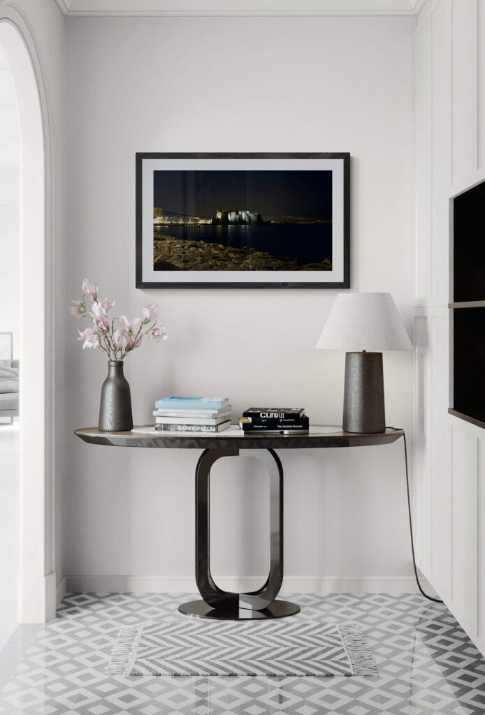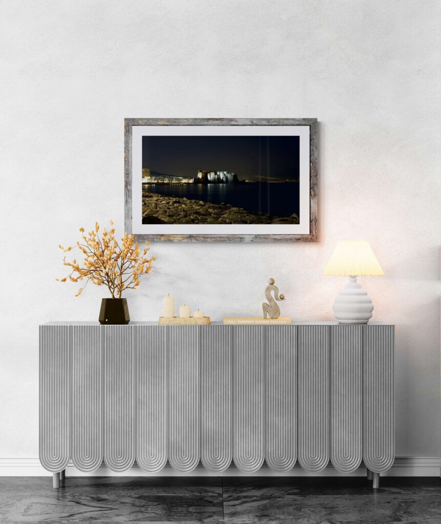 Nella fotografia MEGARIDE, Antonio Gargiulo cattura l’essenza sospesa e silenziosa di una notte estiva sul lungomare Partenope. Il Castel dell’Ovo, cuore antico di Napoli, emerge dalla penombra come un blocco di memoria scolpito nella roccia e nella luce. L’occhio del fotografo traduce l’immobilità apparente del paesaggio in un tempo contemplativo: il mare levigato dai riflessi notturni, le luci della città che si dissolvono all’orizzonte, la pietra che si fa custode di una lunga storia.