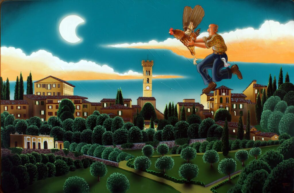 “Questa opera è, in realtà, una sorta di scherzo. Fiesole è il borgo collinare che ha dato vita alla città di Firenze ed è anche il luogo dove io e Carla, mia moglie, ci siamo incontrati da bambini. Nel corso degli anni abbiamo conosciuto molte persone, ma ce n’è stata una in particolare che sembrava così piena di sé da sembrare pronta a spiccare il volo da terra… Quest’opera è dedicata a lei.”