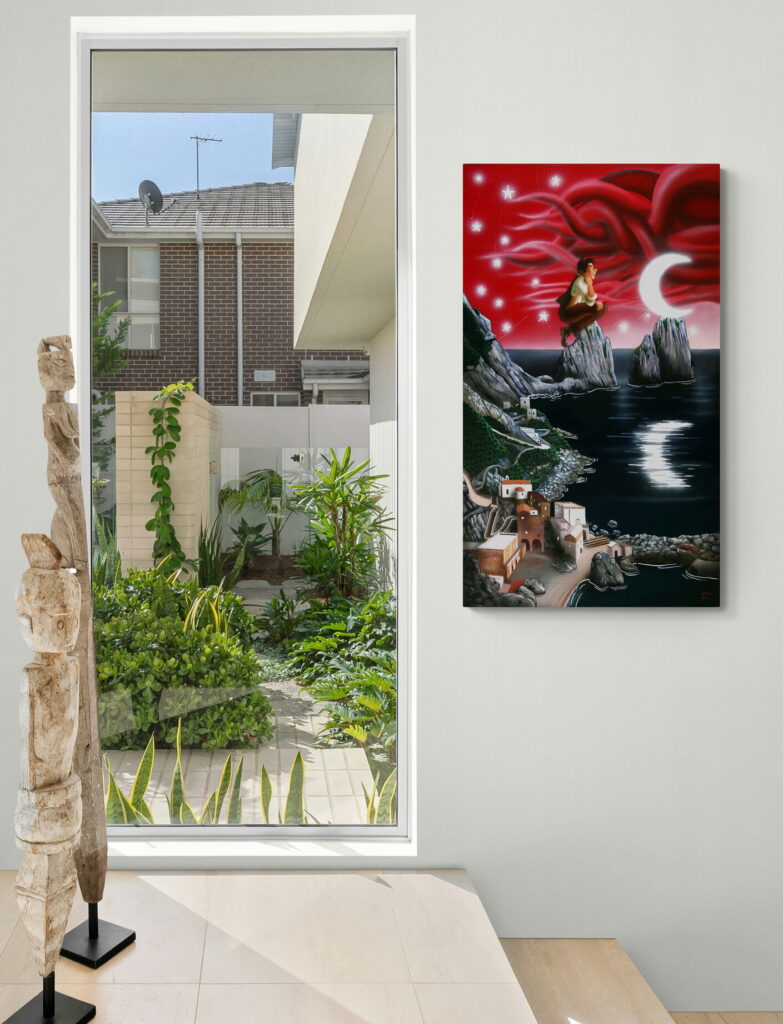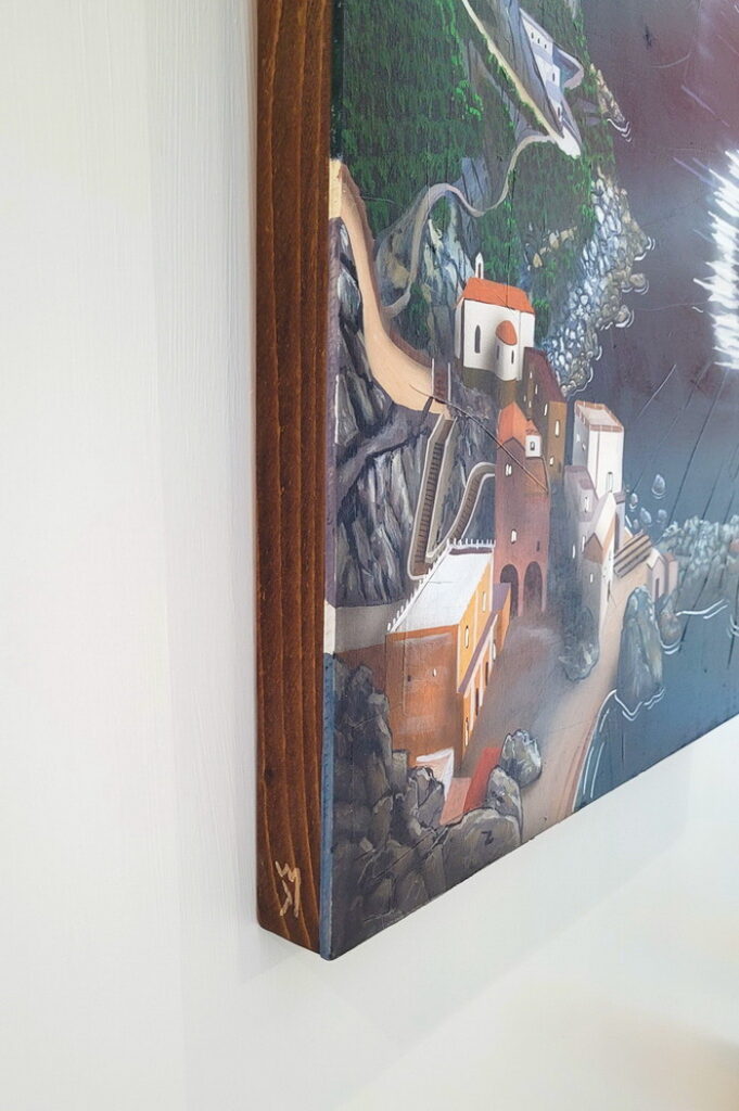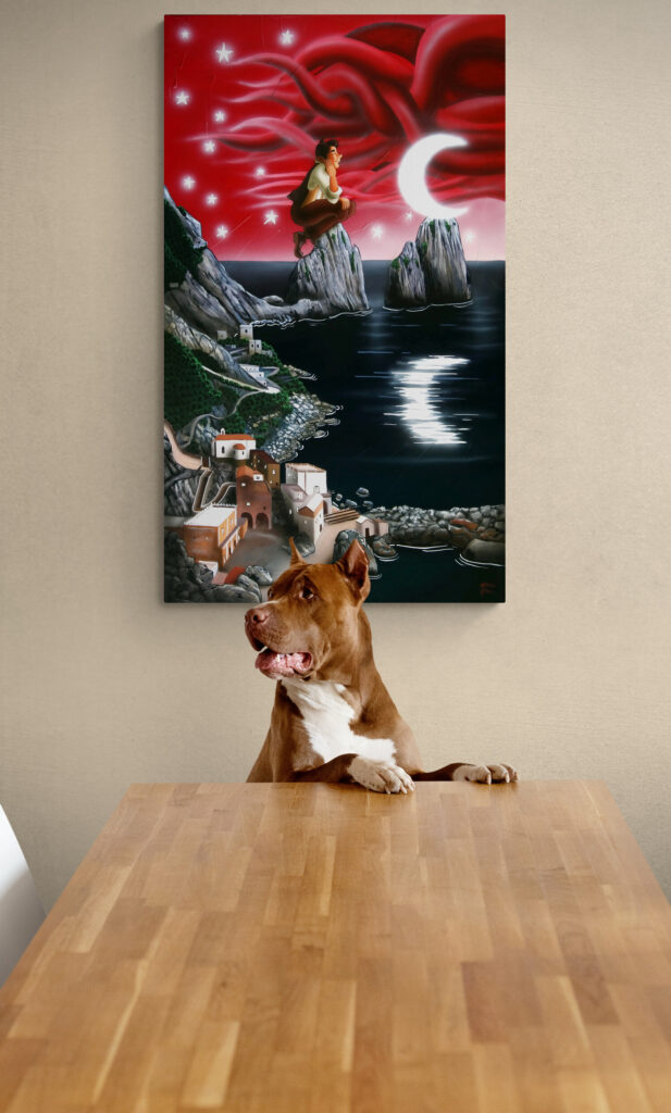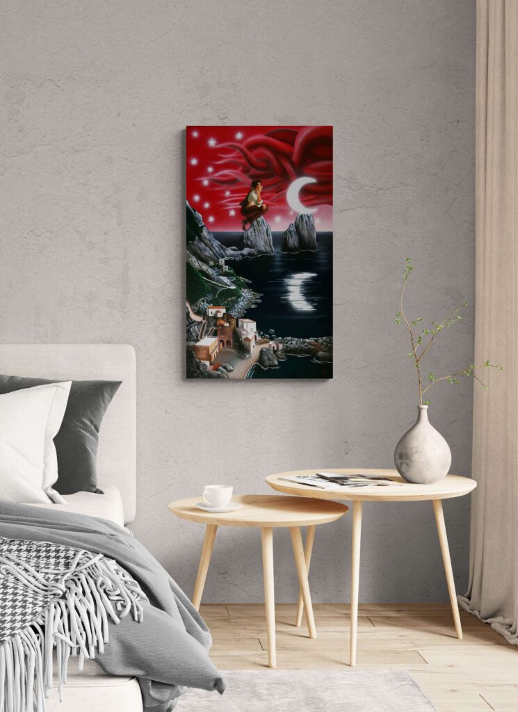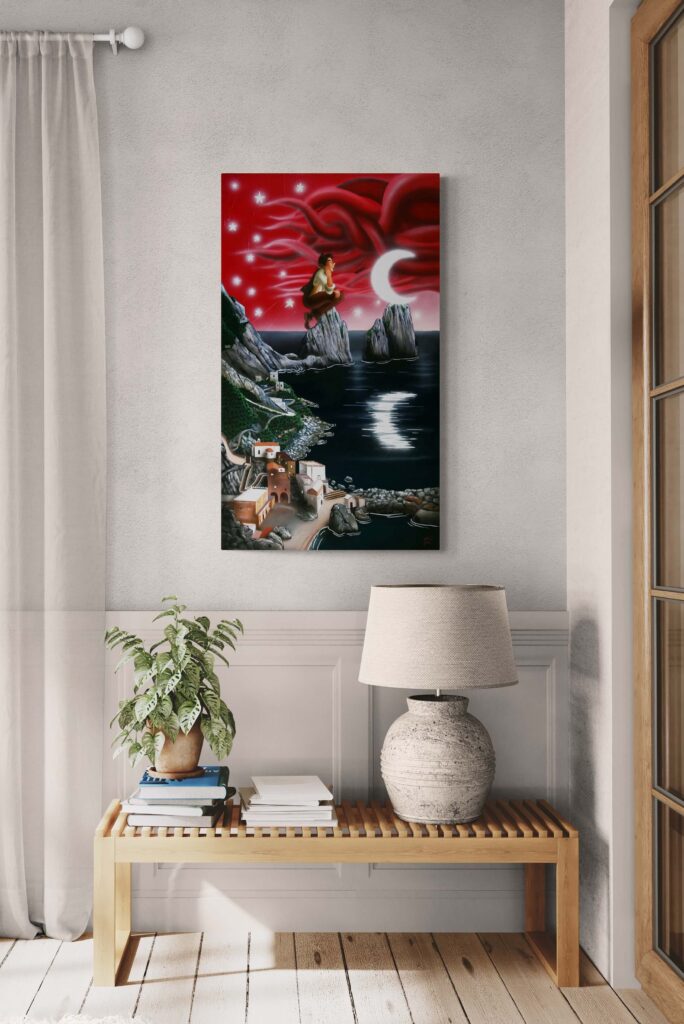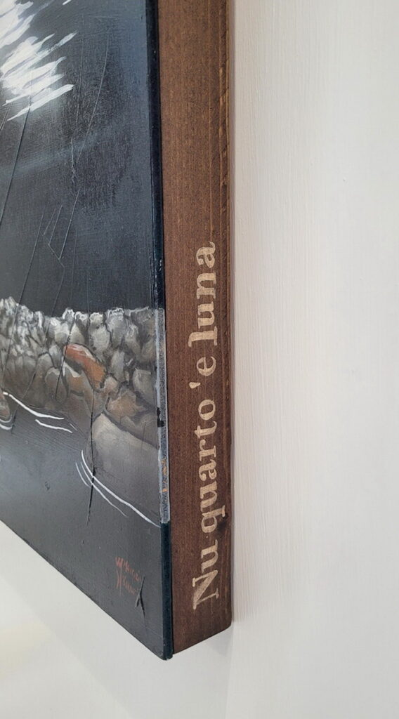 “La mia prima sera a Capri è stata indimenticabile. Ci siamo diretti verso i Faraglioni mentre le ultime luci del tramonto tingevano il cielo di tonalità calde. Tuttavia, nonostante la bellezza del momento, ho avvertito un senso di tristezza profonda, una sensazione inaspettata che mi ha colto di sorpresa. Il giorno seguente, a bordo di una barca, abbiamo navigato attorno e sotto il grande arco del Faraglione maggiore, vivendo una giornata meravigliosa e piena di emozioni. Nonostante ciò, quell’immagine di malinconia ha continuato a rimanere con me per lungo tempo, fino a quando non ho trovato un’eco simile di tristezza nella canzone di Murolo, che da sempre desideravo dipingere e che fu eseguita per la prima volta proprio a Capri.”
