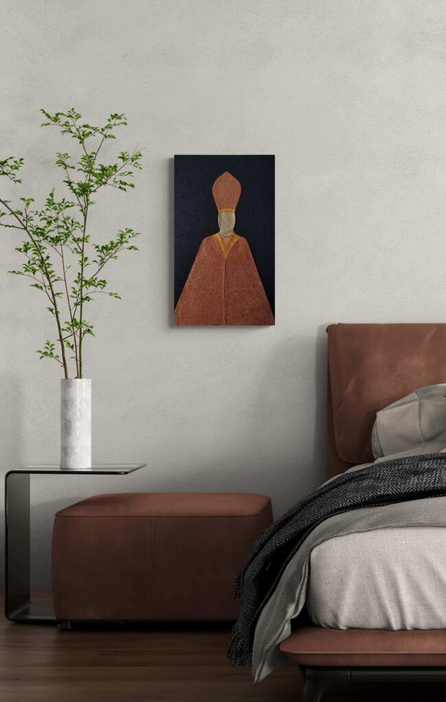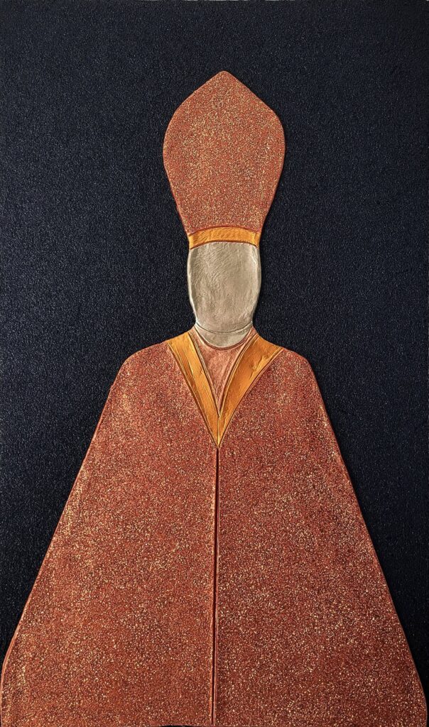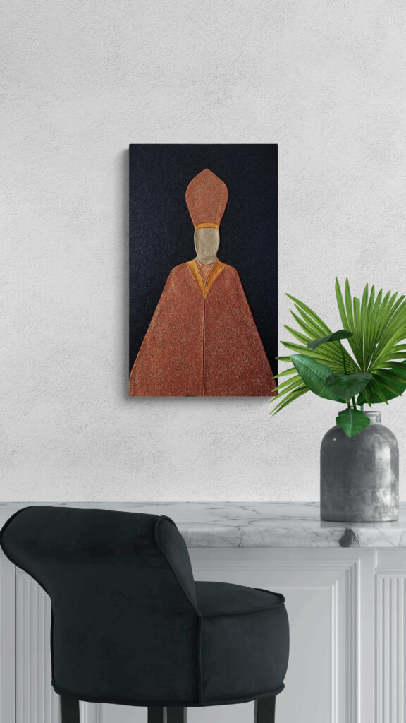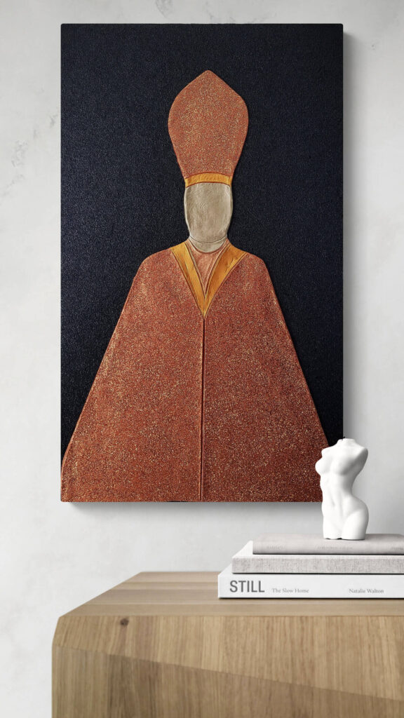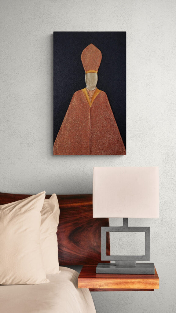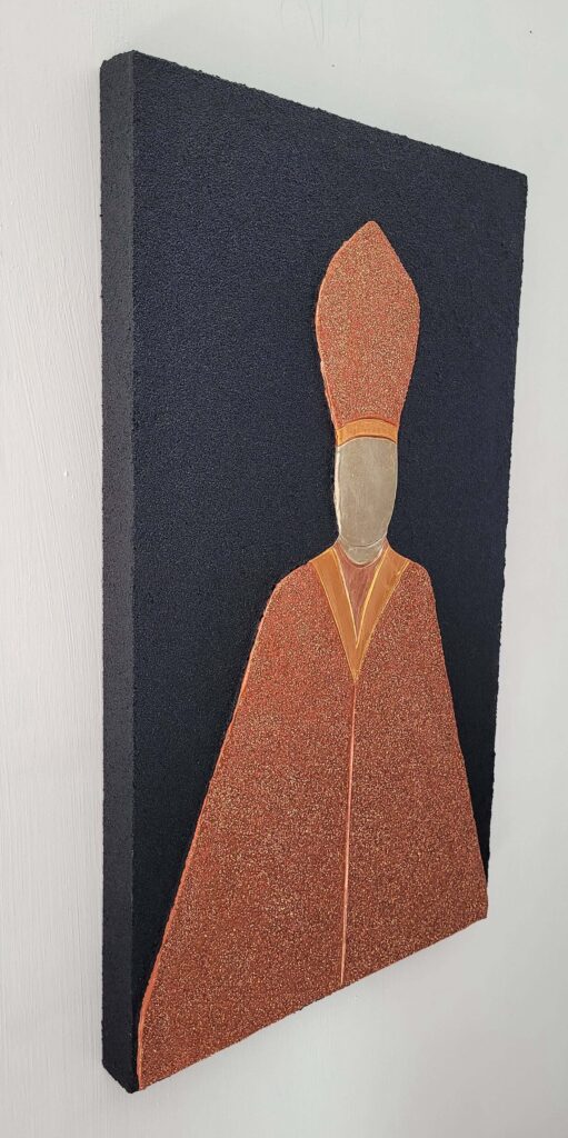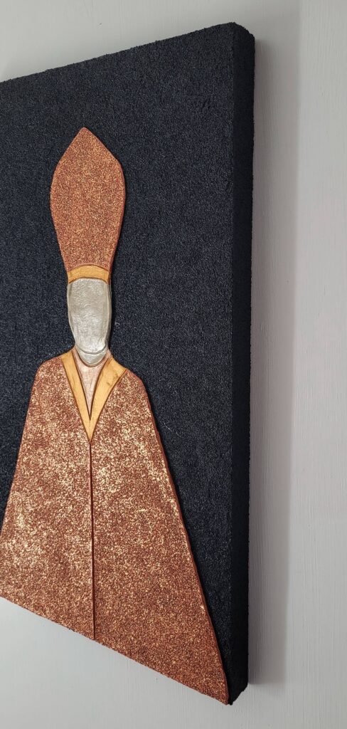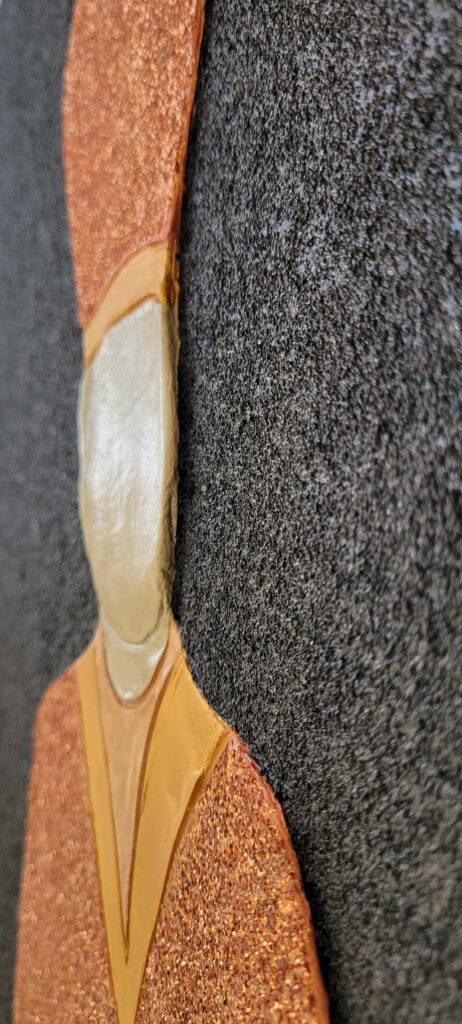 Materiale usato per la tecnica mista: legno, pasta per modellare, malta micacea, acrilico, pasta glitter.