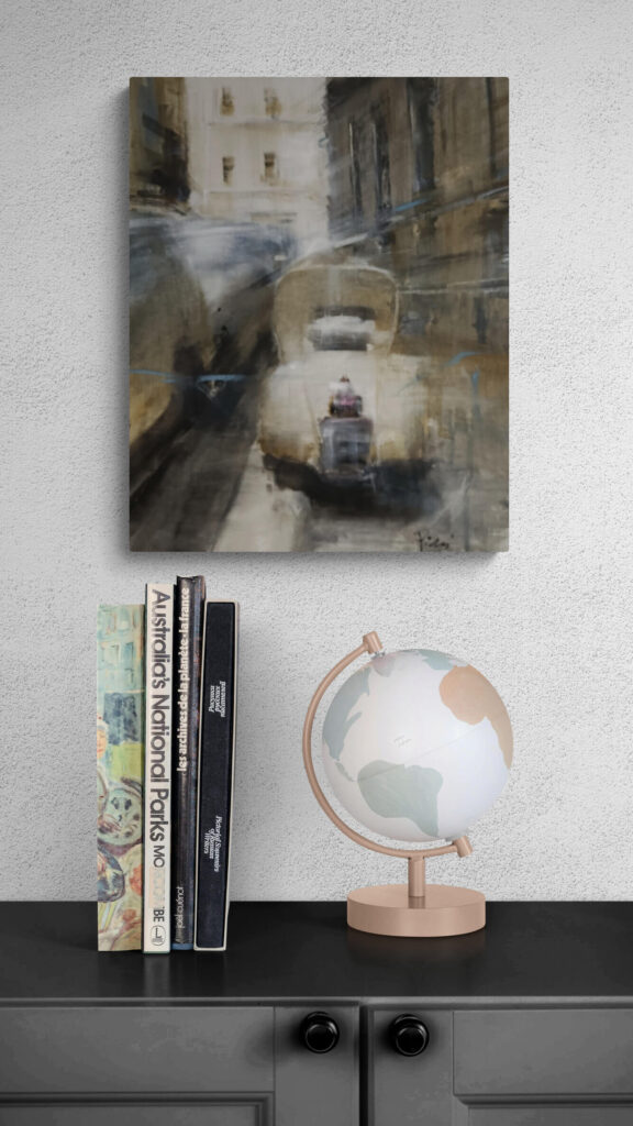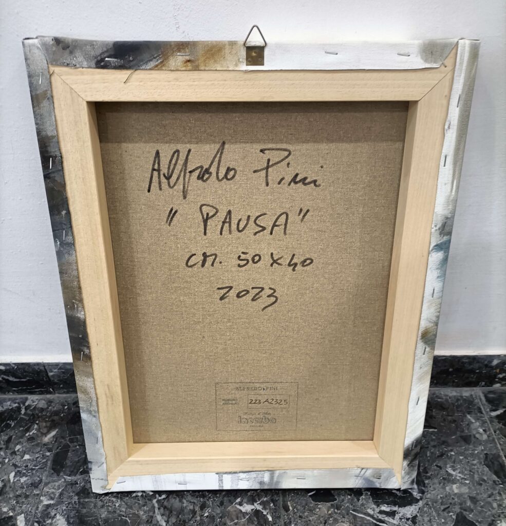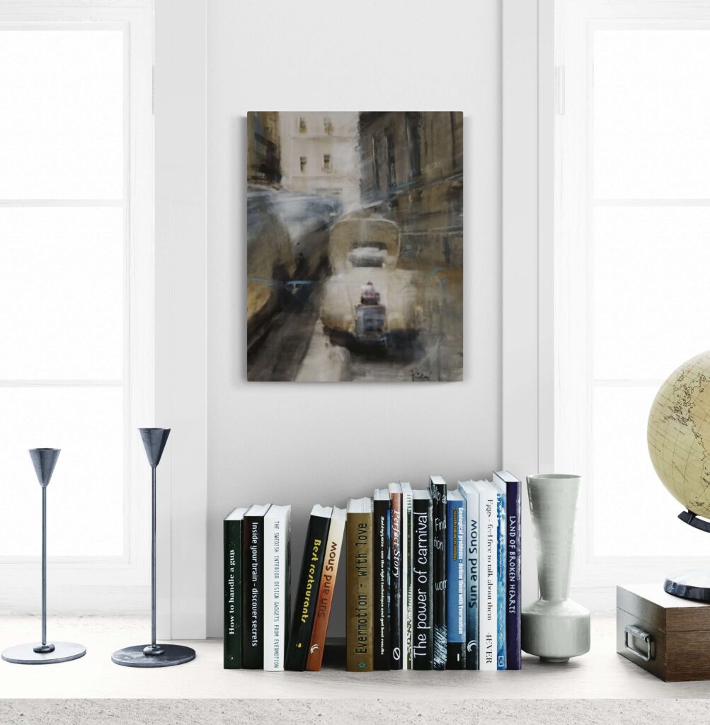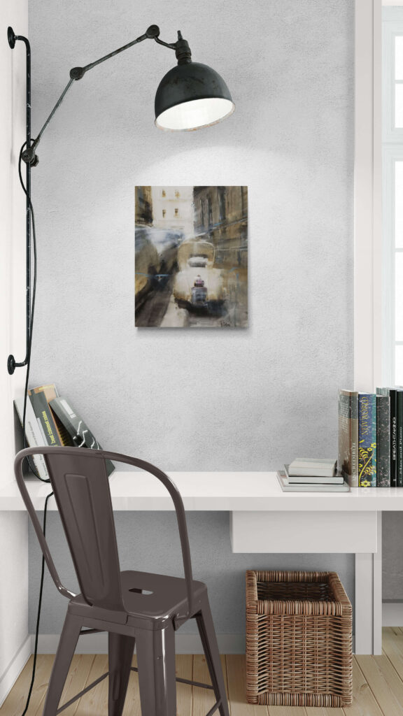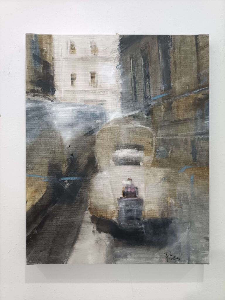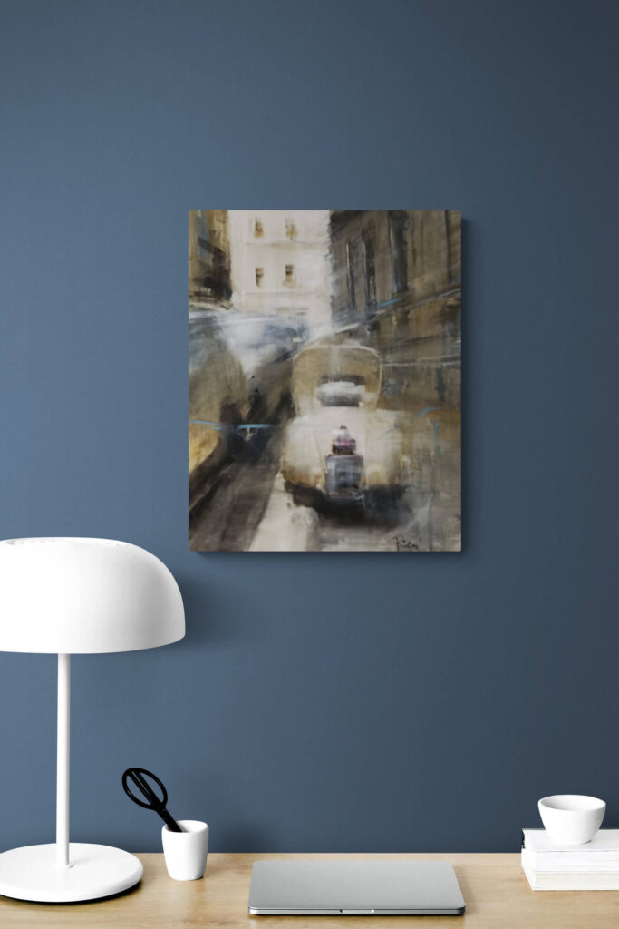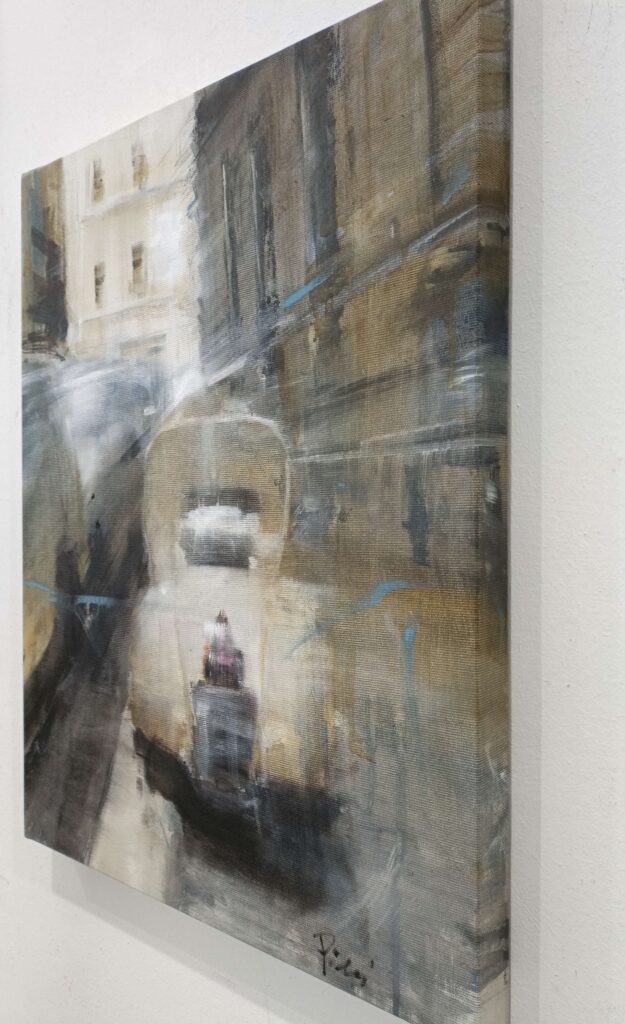 La vespa, ferma e silenziosa, si fa custode di un tempo sospeso, dilatato, in cui tutto scorreva lentamente e con calma. Intorno a lei, le auto parcheggiate sono rappresentate con pennellate rapide e dinamiche, suggerendo un movimento nascosto e simbolizzando la frenesia e il ritmo accelerato della vita contemporanea. Un contrasto tra quiete e agitazione, tra passato e presente, che invita a riflettere sulla velocità del tempo e sulla necessità di ritagliarsi momenti di pausa.