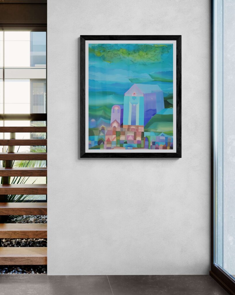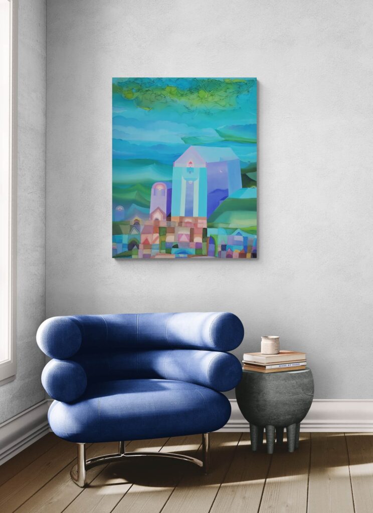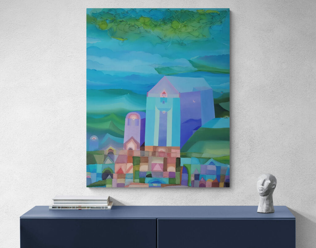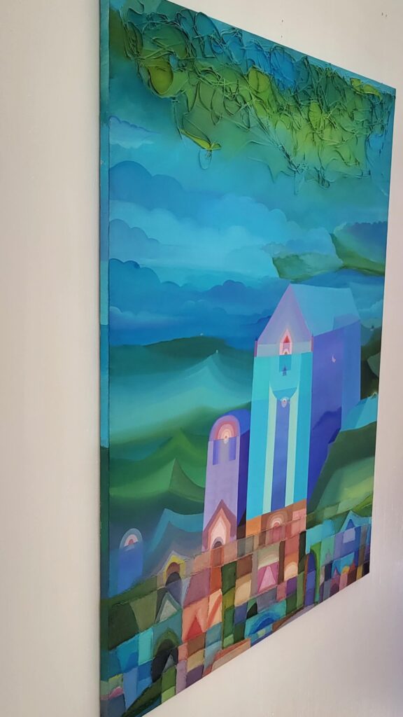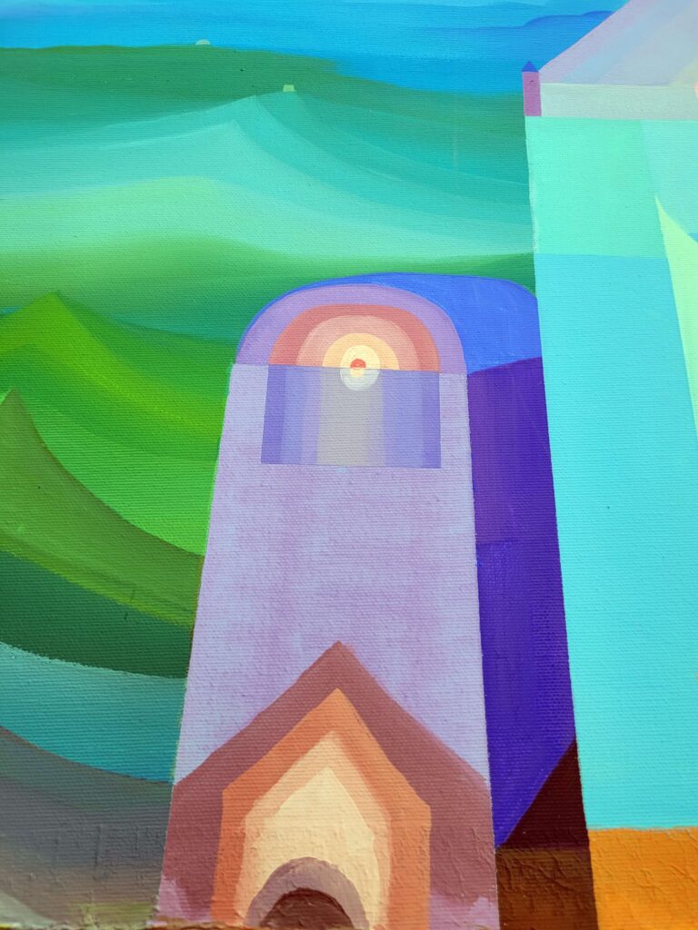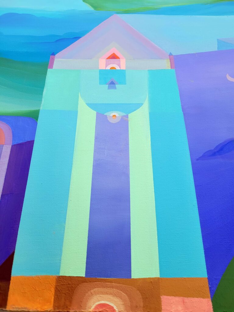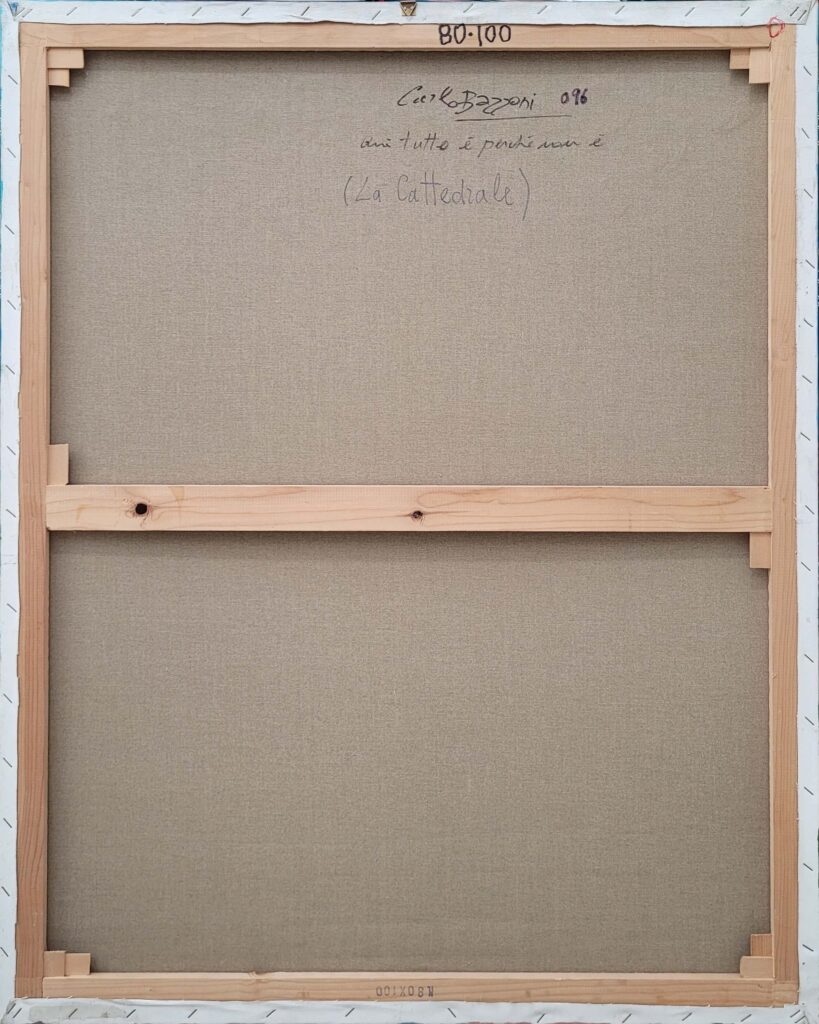 In qui tutto è perchè non è, l’artista edifica un luogo interiore dove l’architettura si fa visione. Le strutture geometriche, simili a torri o templi, si innalzano come forme sacre da un mosaico cromatico fatto non di pietra, ma di silenzio, assenza e allusione metafisica. Sono cattedrali non della terra, ma del pensiero.