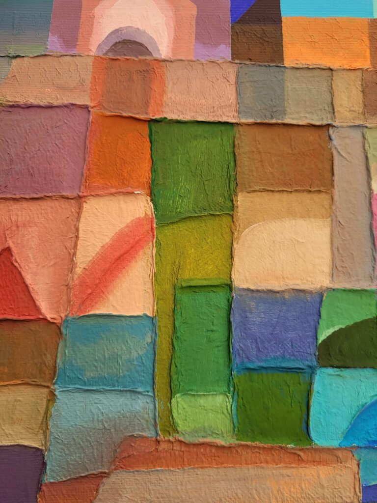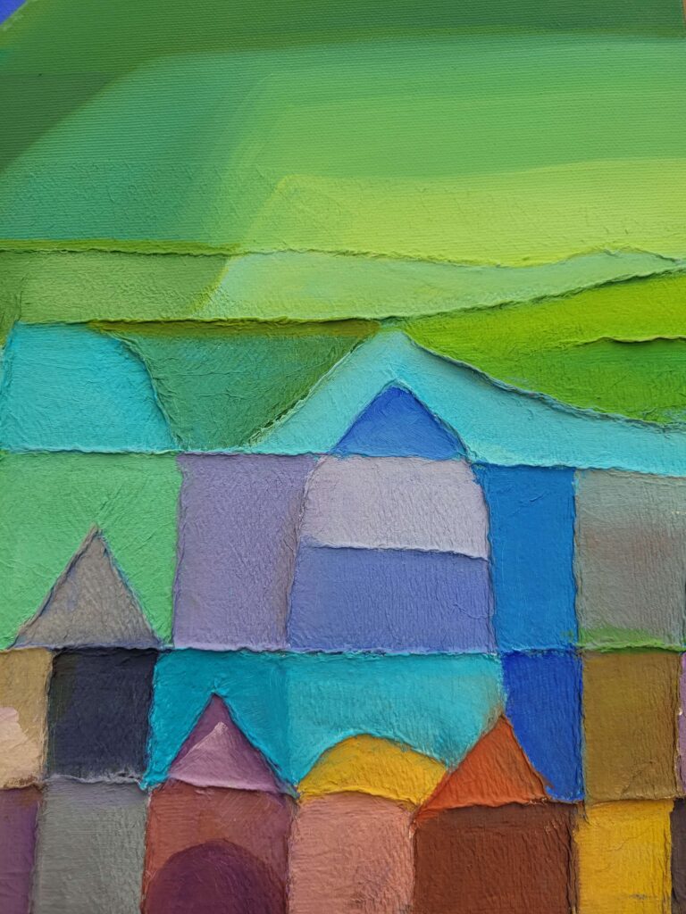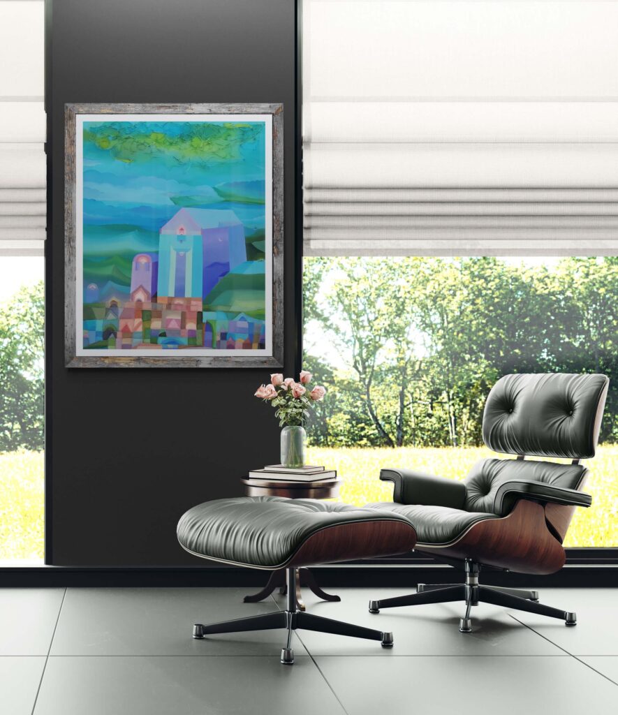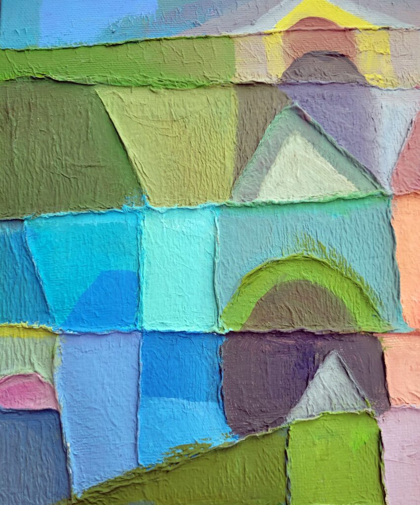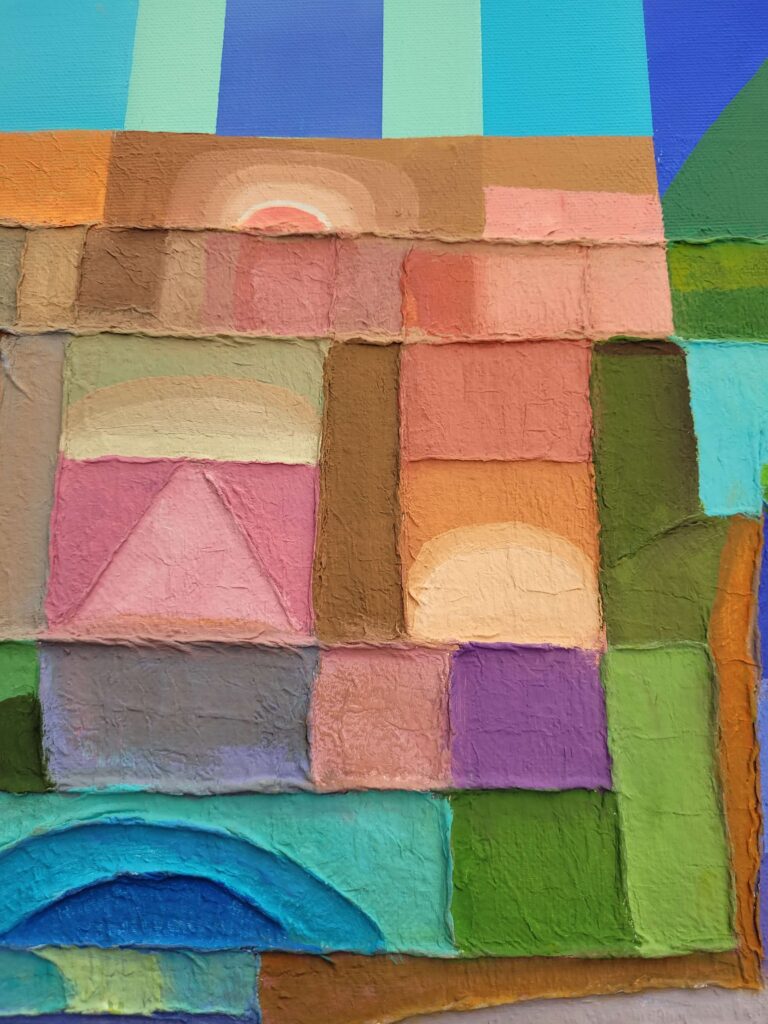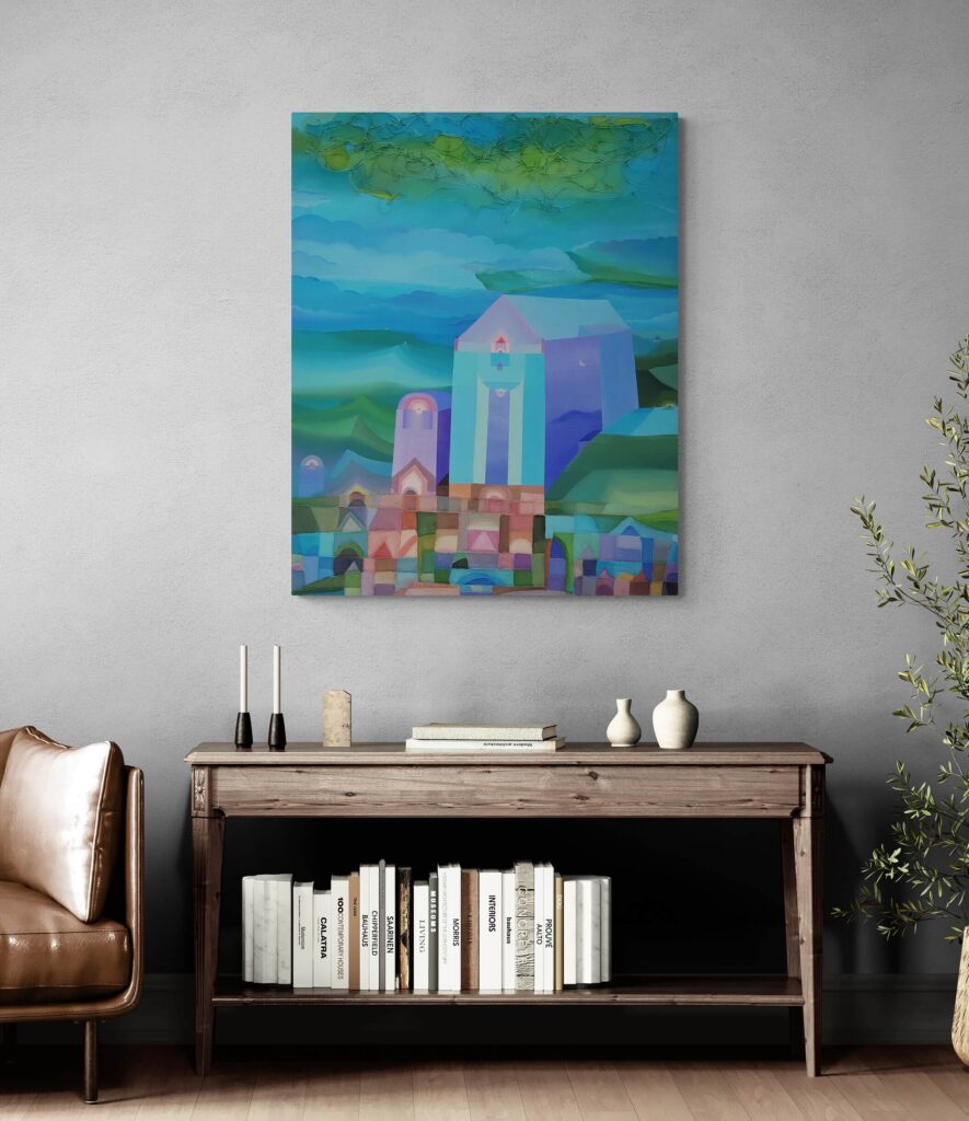 In qui tutto è perchè non è, l’artista edifica un luogo interiore dove l’architettura si fa visione. Le strutture geometriche, simili a torri o templi, si innalzano come forme sacre da un mosaico cromatico fatto non di pietra, ma di silenzio, assenza e allusione metafisica. Sono cattedrali non della terra, ma del pensiero.