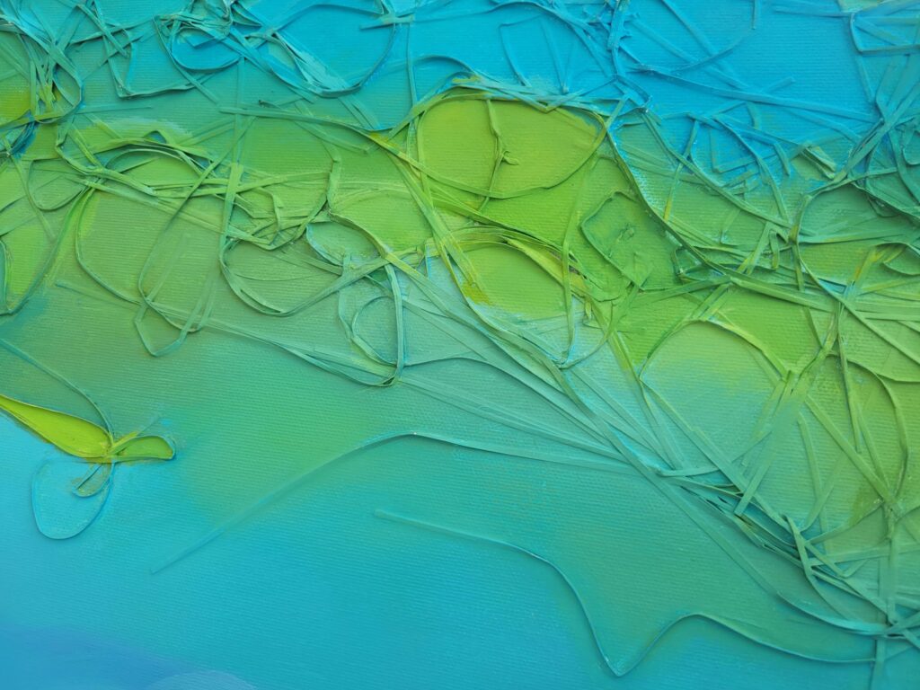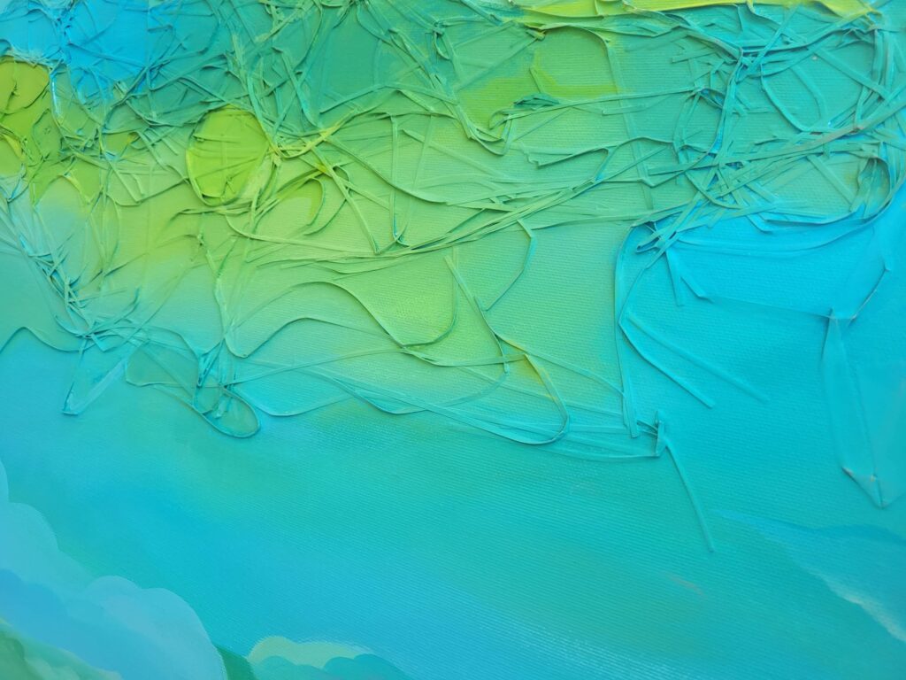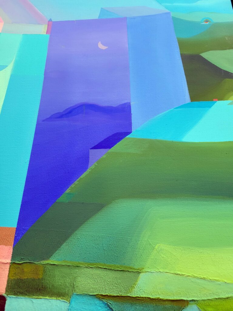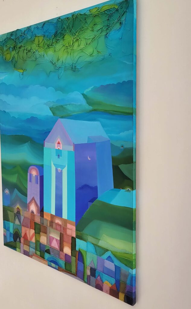Immerso in tonalità sovrapposte di blu, viola e verde, il paesaggio evoca un senso di elevazione e sospensione. Una luna discreta osserva da lontano, mentre nel cielo si agitano trame organiche, segno che anche nello spazio sacro il caos continua a vibrare.