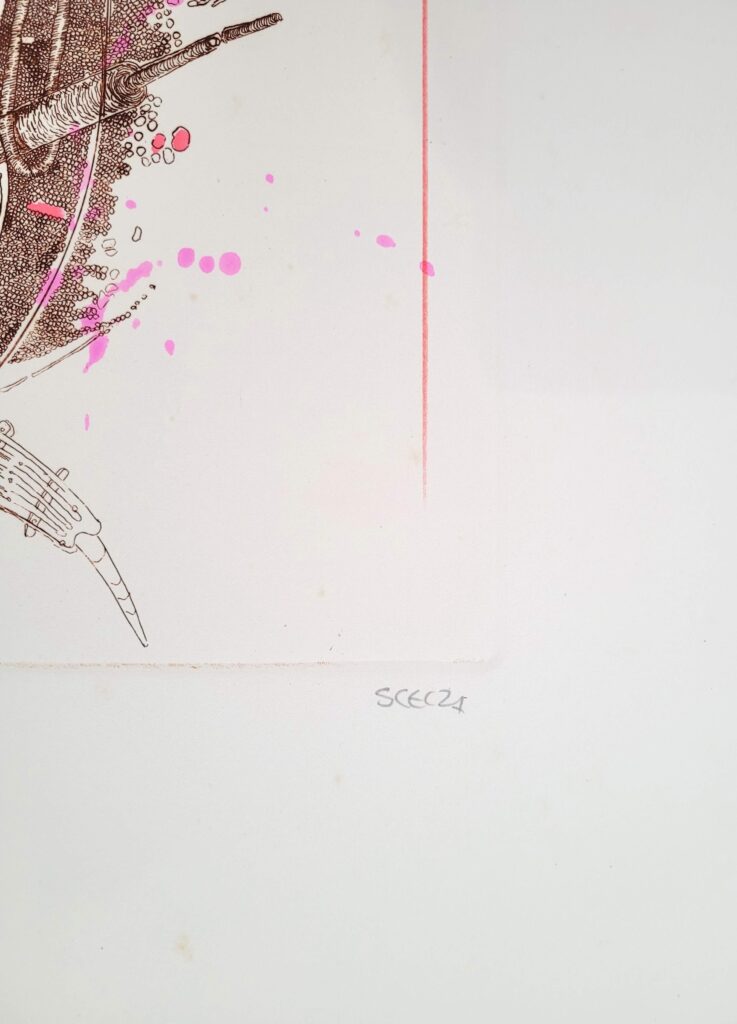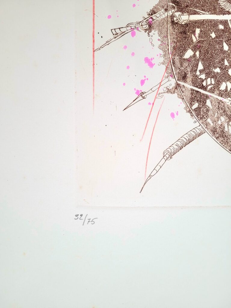 Sul catalogo è erroneamente dichiarato che sono stati tirati 75 esemplari suddivisi in 50 numeri arabi + XX numeri romani + 5 prove di autore. In realtà l’artista li numerò totalmente in numeri arabi, vale a dire da 1/75 a 75/75.