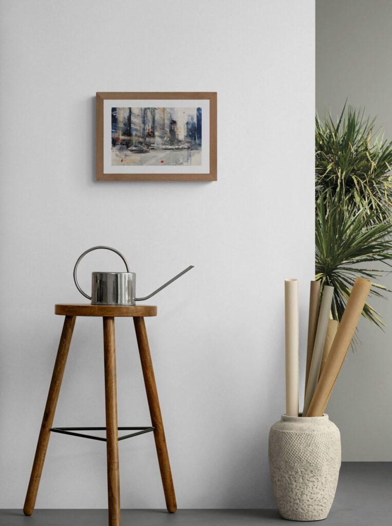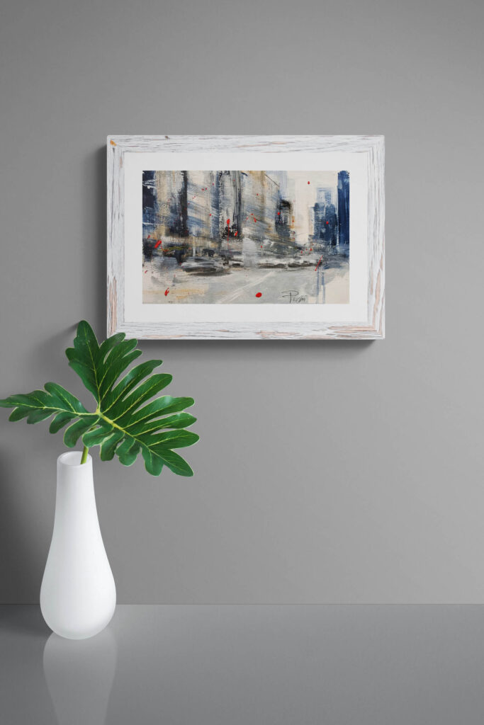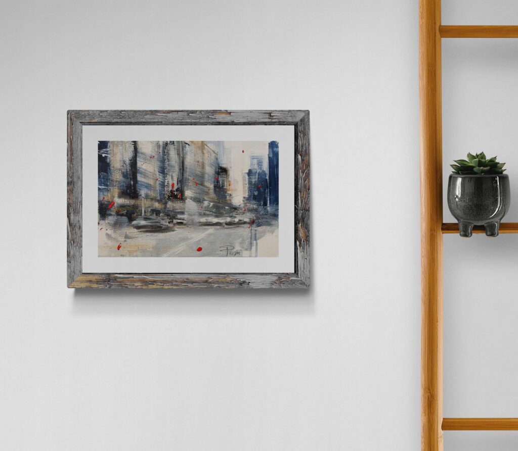 Senza riferimenti restituisce una percezione urbana priva di ancoraggi stabili. Lo spazio appare frammentato, quasi smarrito, come se l’osservatore avesse perso i propri punti di orientamento. Le architetture si dissolvono in segni e stratificazioni, mentre la superficie pittorica trattiene una tensione silenziosa. È un’immagine che non guida lo sguardo, ma lo espone a una condizione di incertezza, riflesso di un’esperienza contemporanea discontinua e instabile.