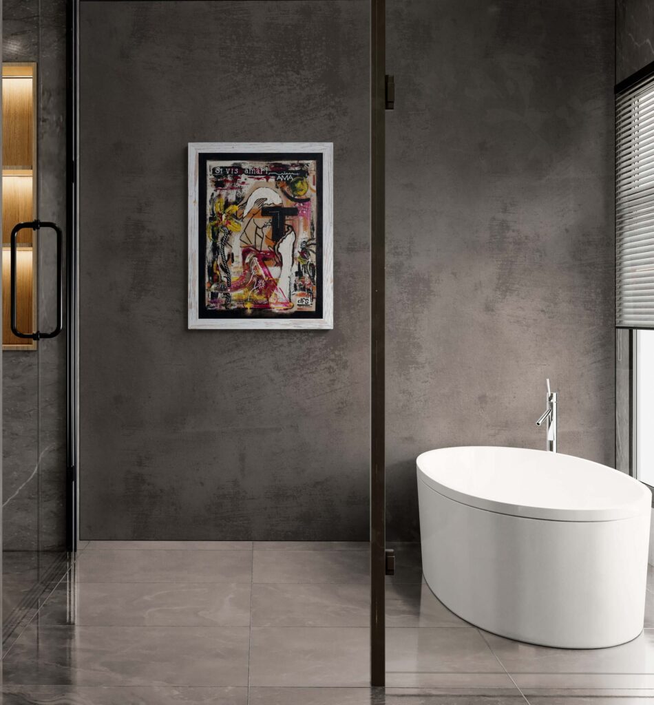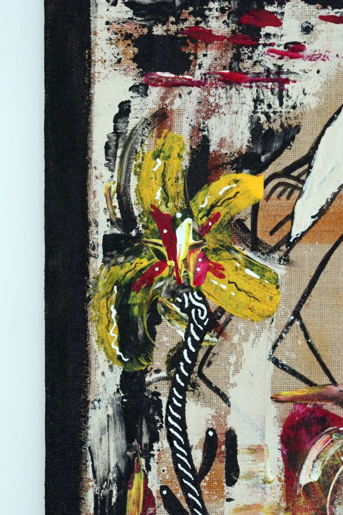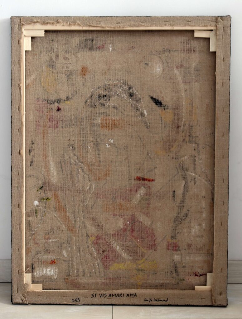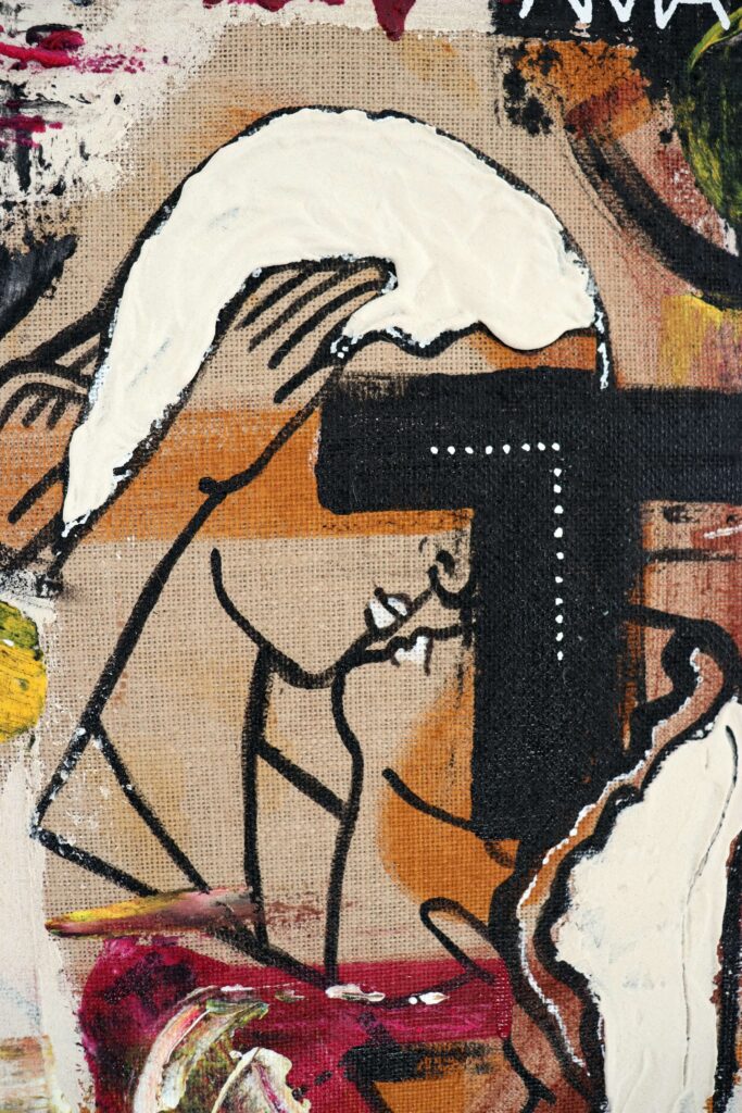 In questa tela, il gesto pittorico diventa confessione e rinascita. Le linee essenziali del volto evocano la vulnerabilità del sentire, mentre le