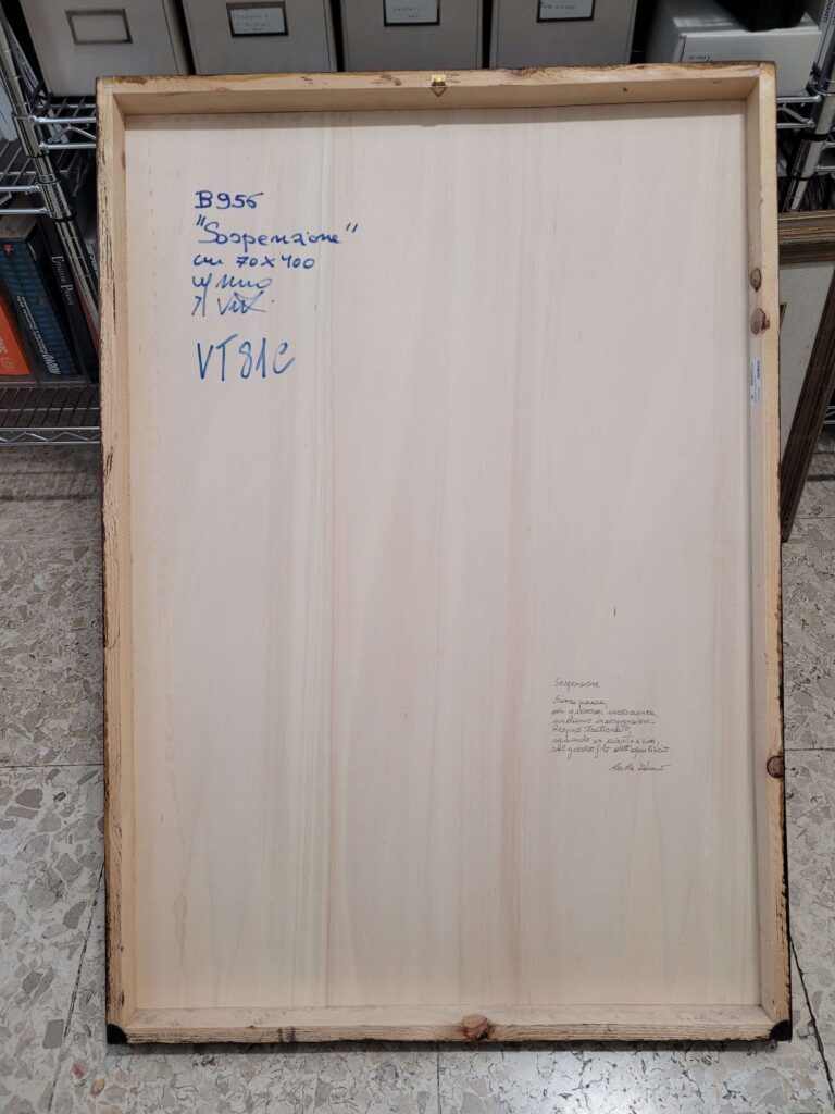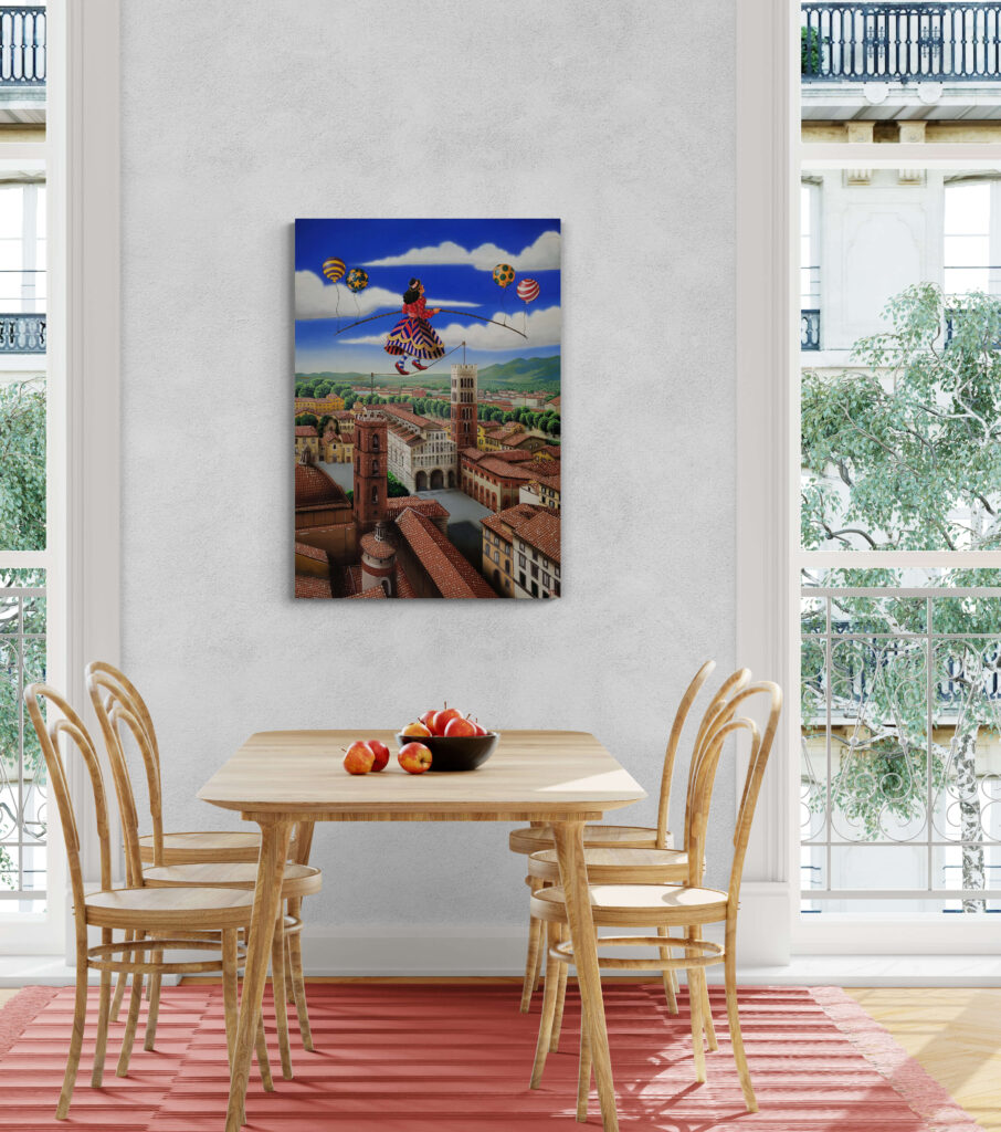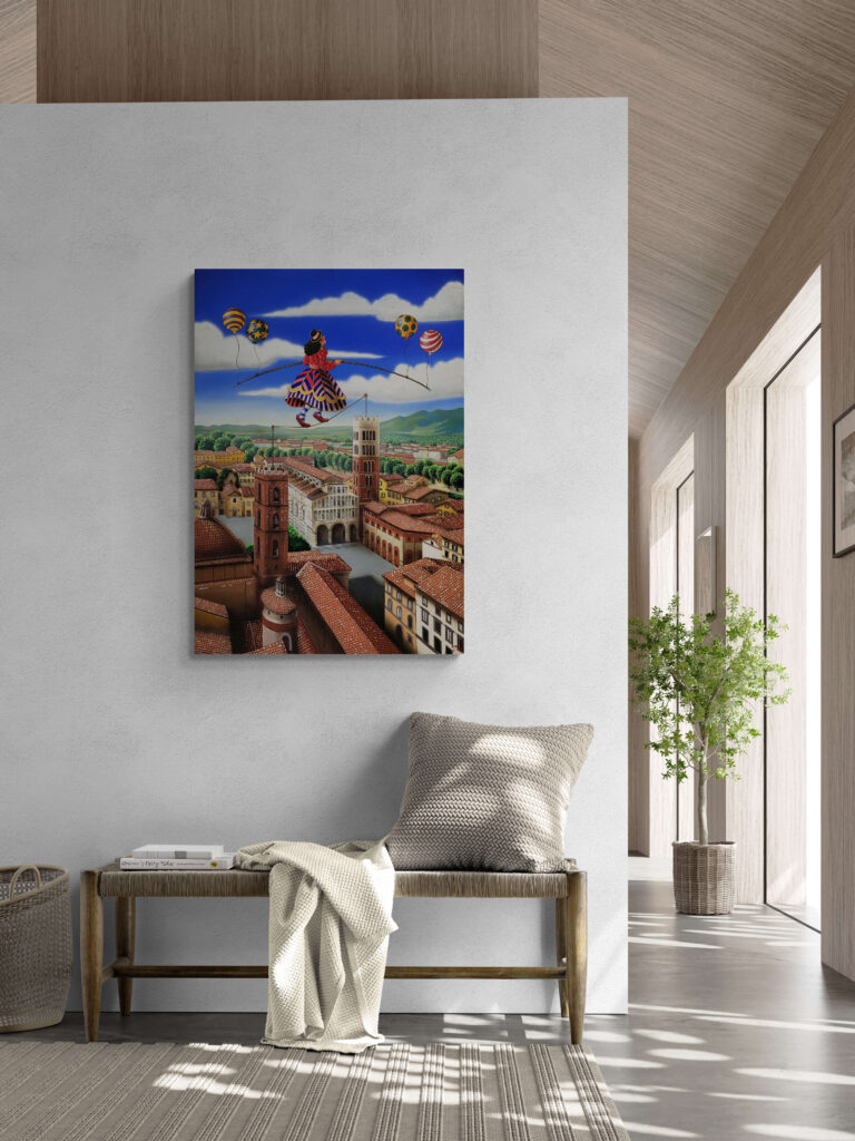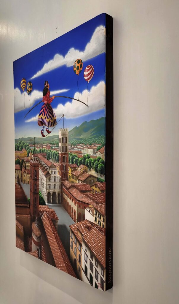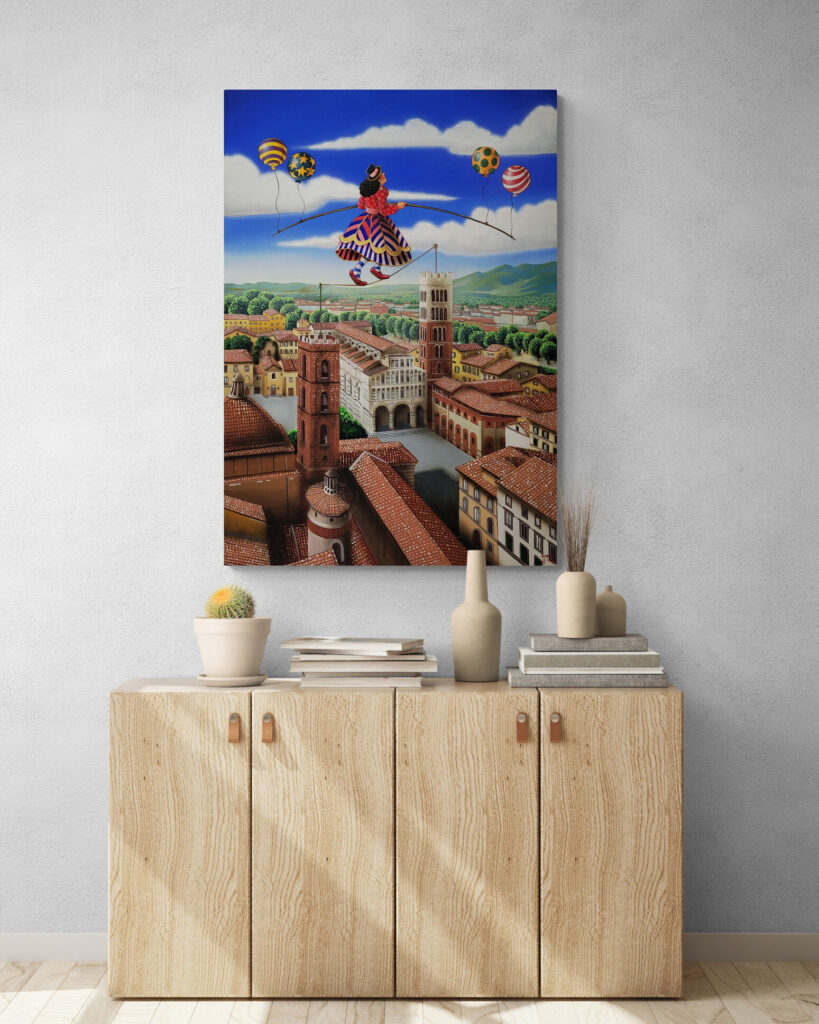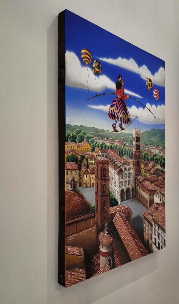“Salire sopra un qualsiasi campanile di Lucca è un’emozione incredibile. La città è tutta lì. Ti sembra di toccarla e di volarci sopra… E io, che non so volare, sarei costretto a camminare su un filo. Ecco, questa l’idea del quadro nato proprio sul posto.”