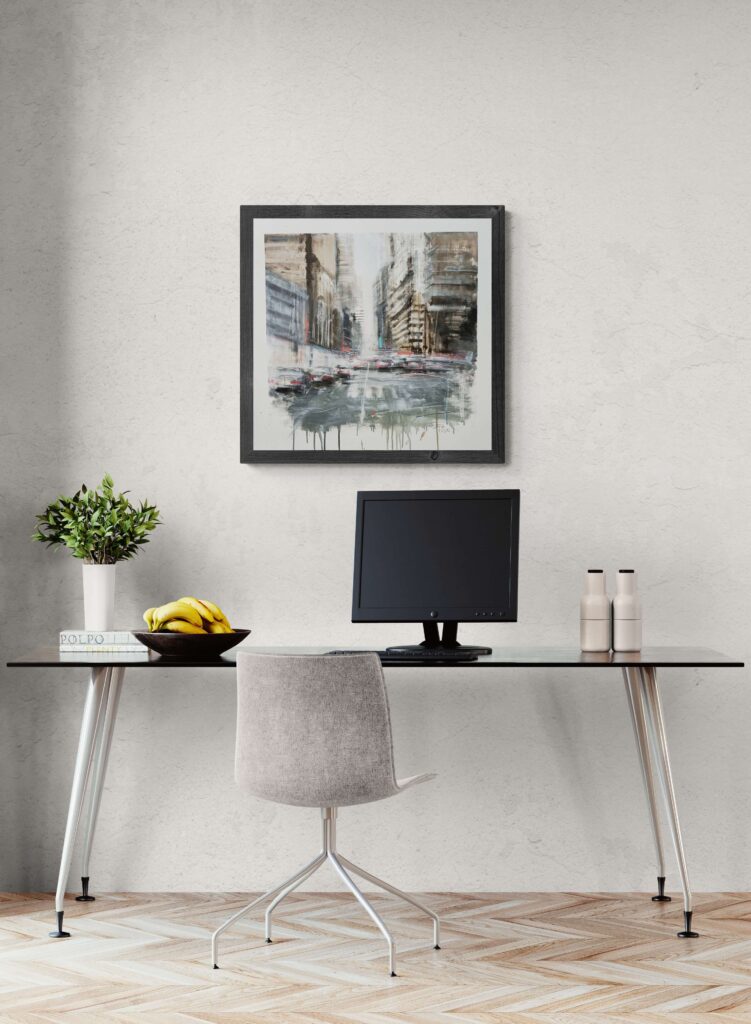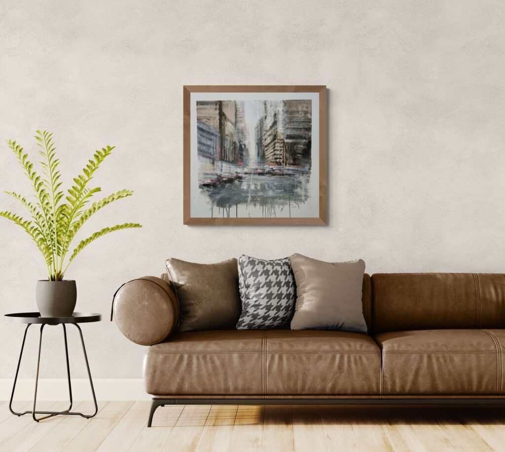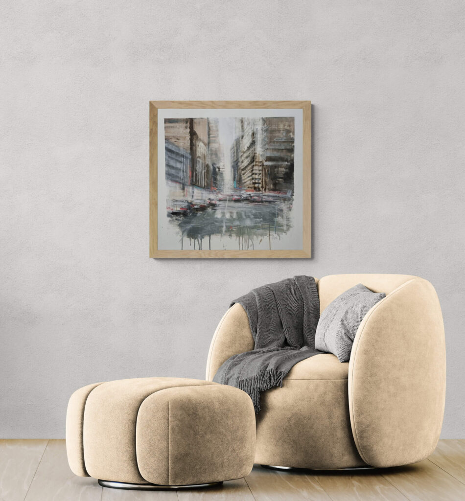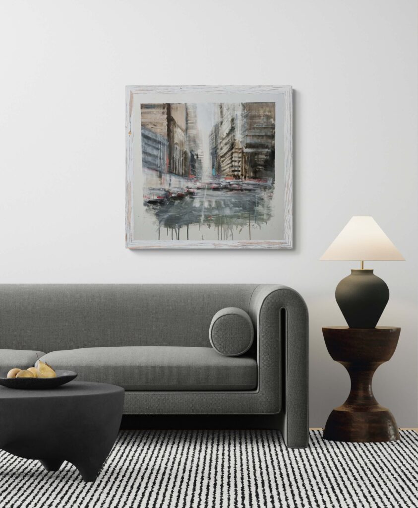 La pittura restituisce la dimensione emotiva del vivere urbano: non il racconto di un luogo preciso, ma la memoria sensibile di un’esperienza collettiva, in cui ogni gesto quotidiano si confonde con quello degli altri. La città, così, non è uno spazio da abitare, ma un flusso da attraversare.