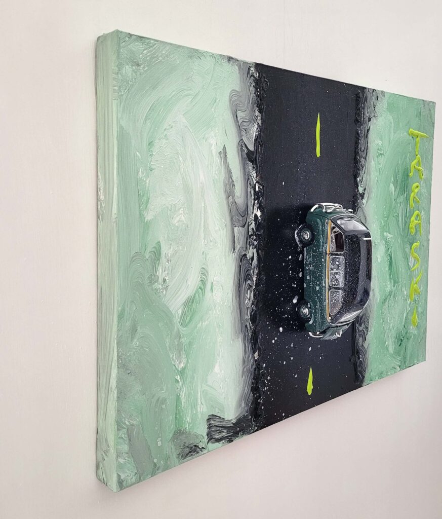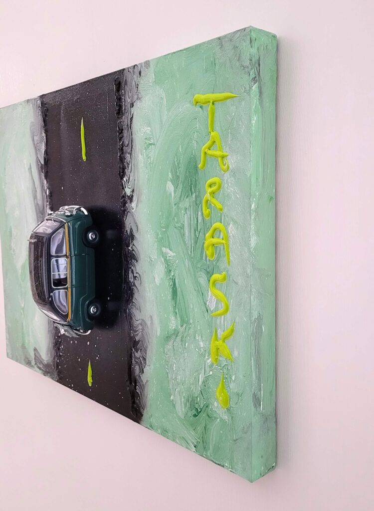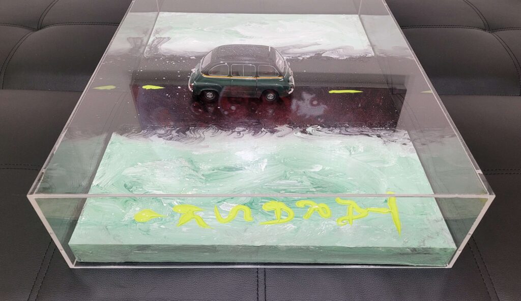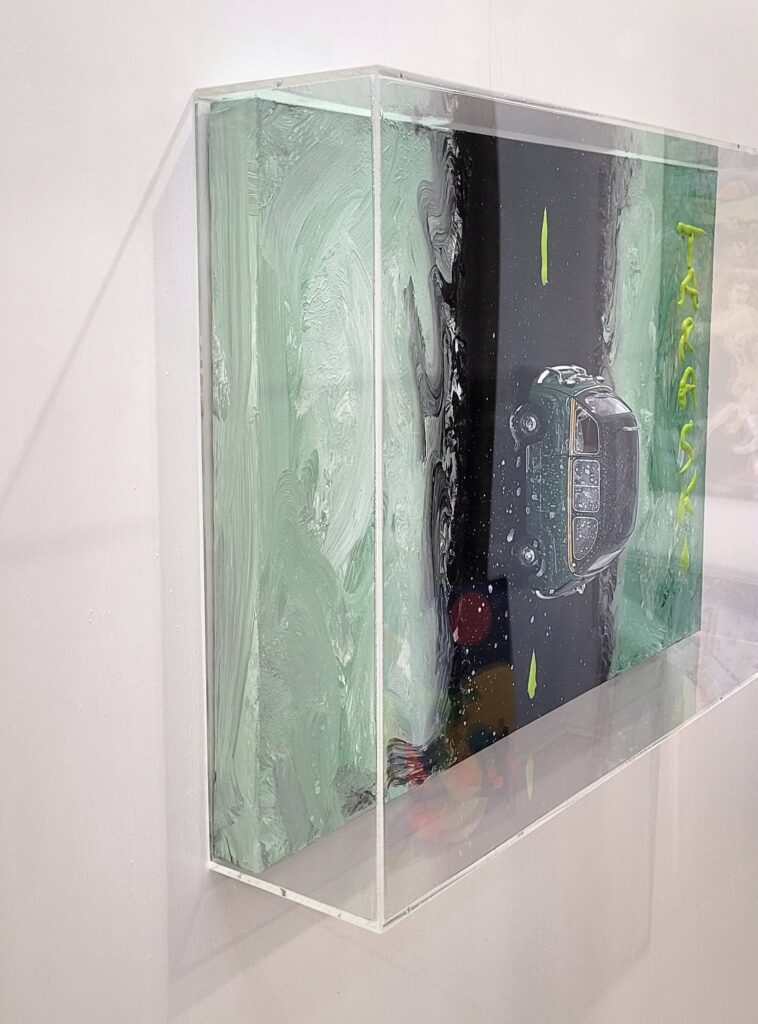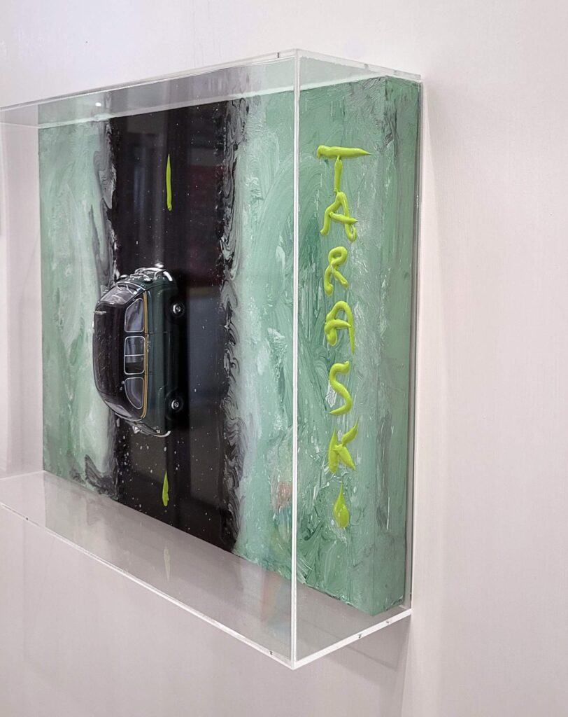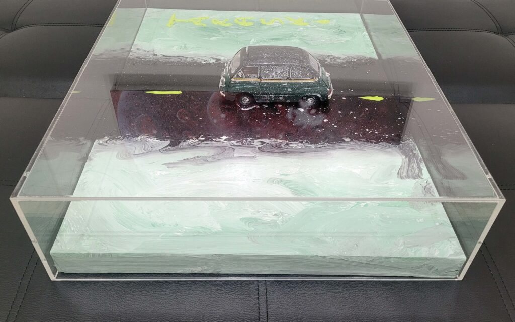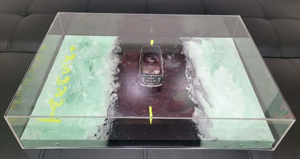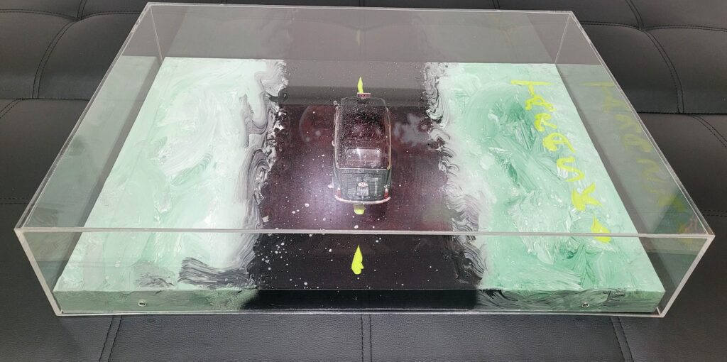 Tecnica: Acrilico, smalto, gesso, permanent marker, modellino su tela in box di plexiglass