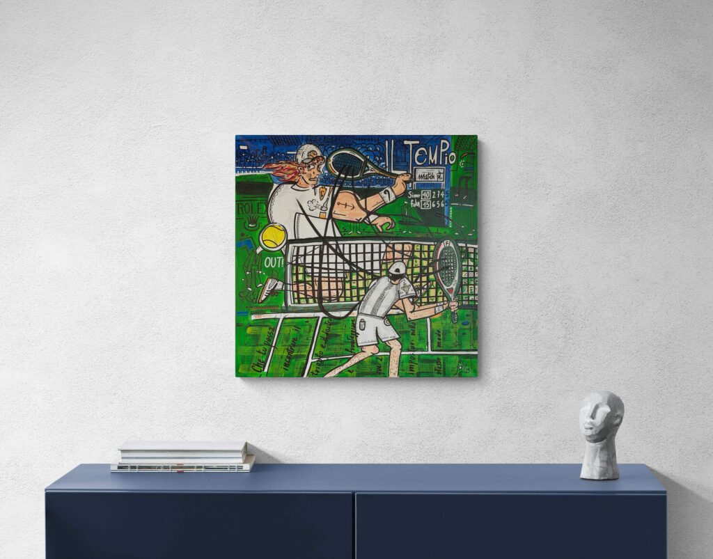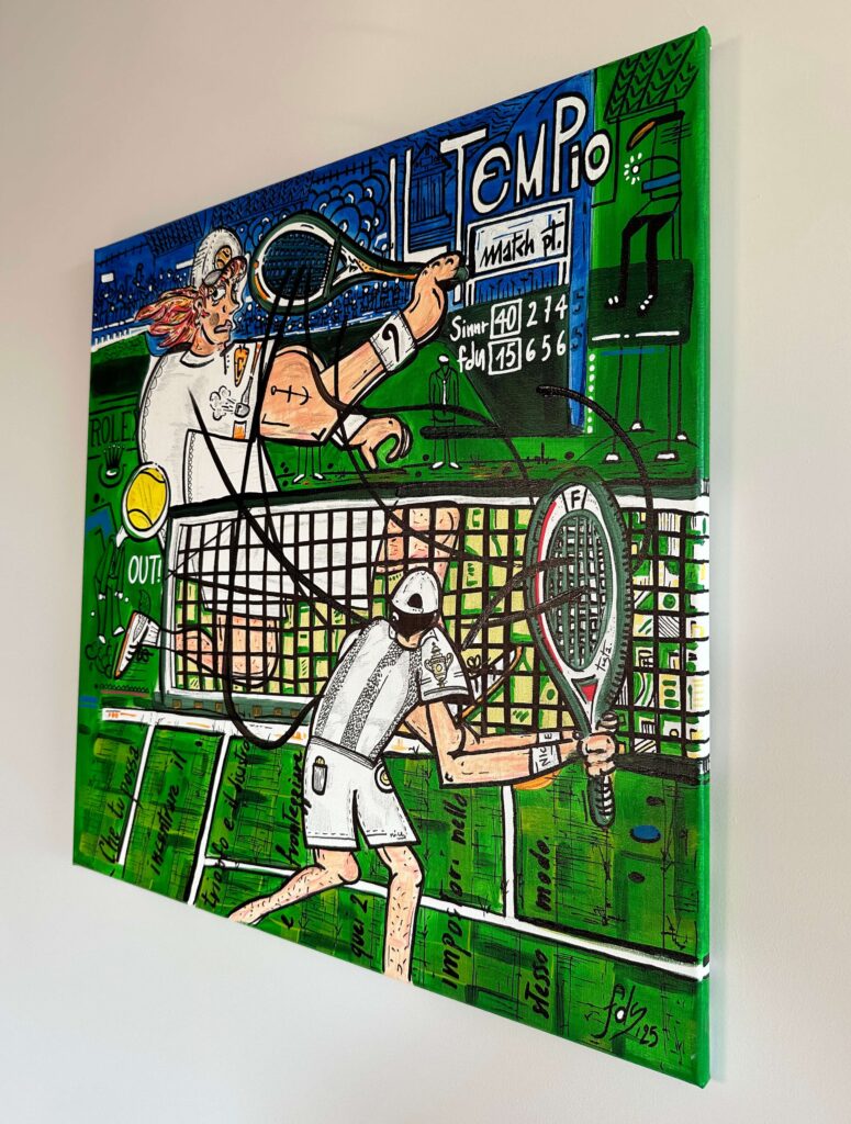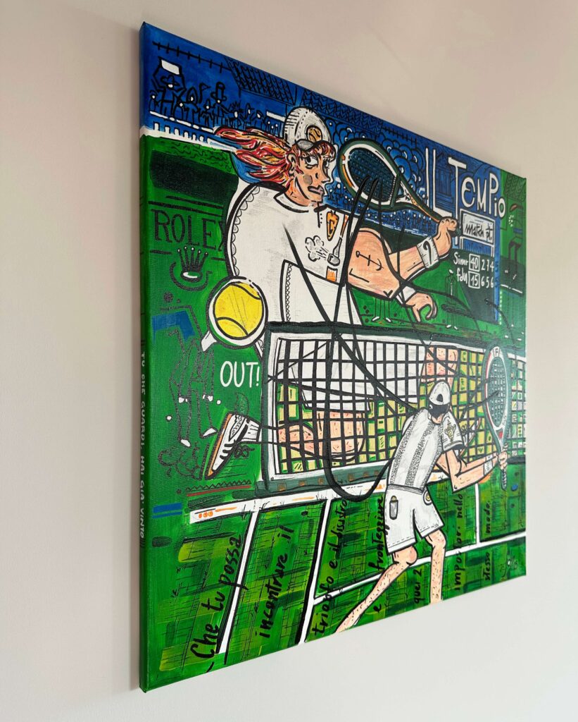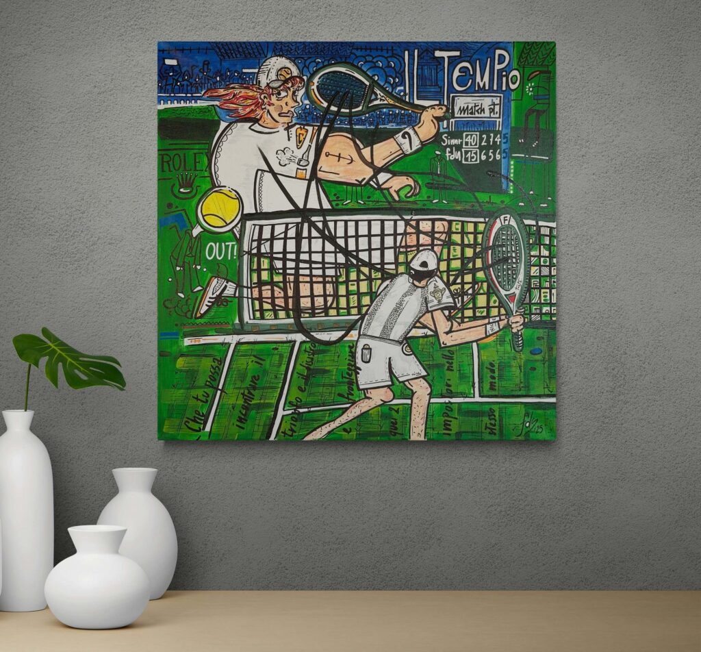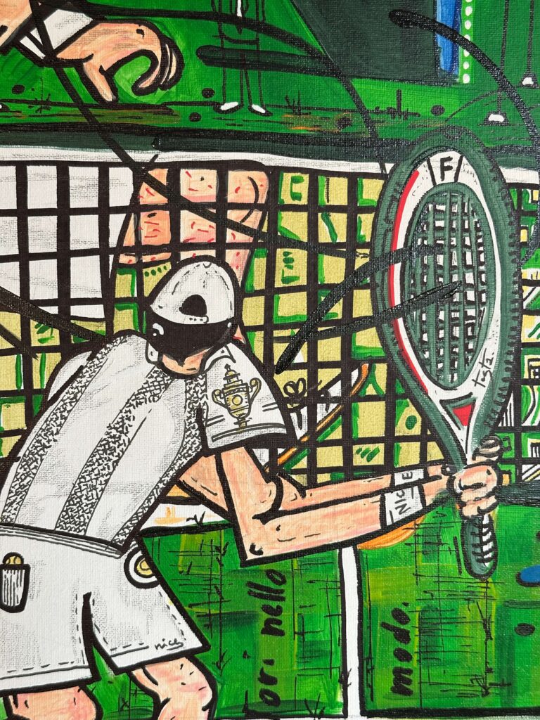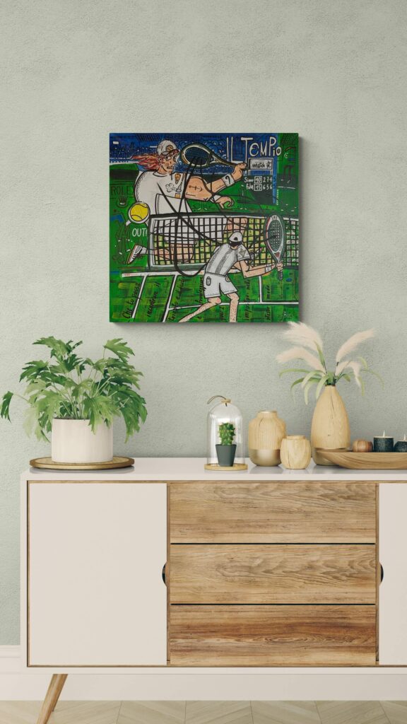 In questa tela ho voluto catturare proprio quell’istante: la tensione pura di una sfida sportiva, il rumore ritmico delle scarpe sull’erba, il luccichio della luce che scivola sulle racchette, il silenzio sospeso tra due colpi, carico di attesa.