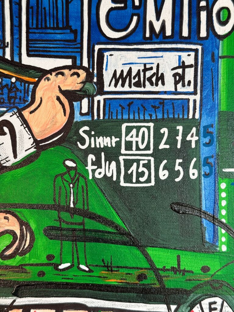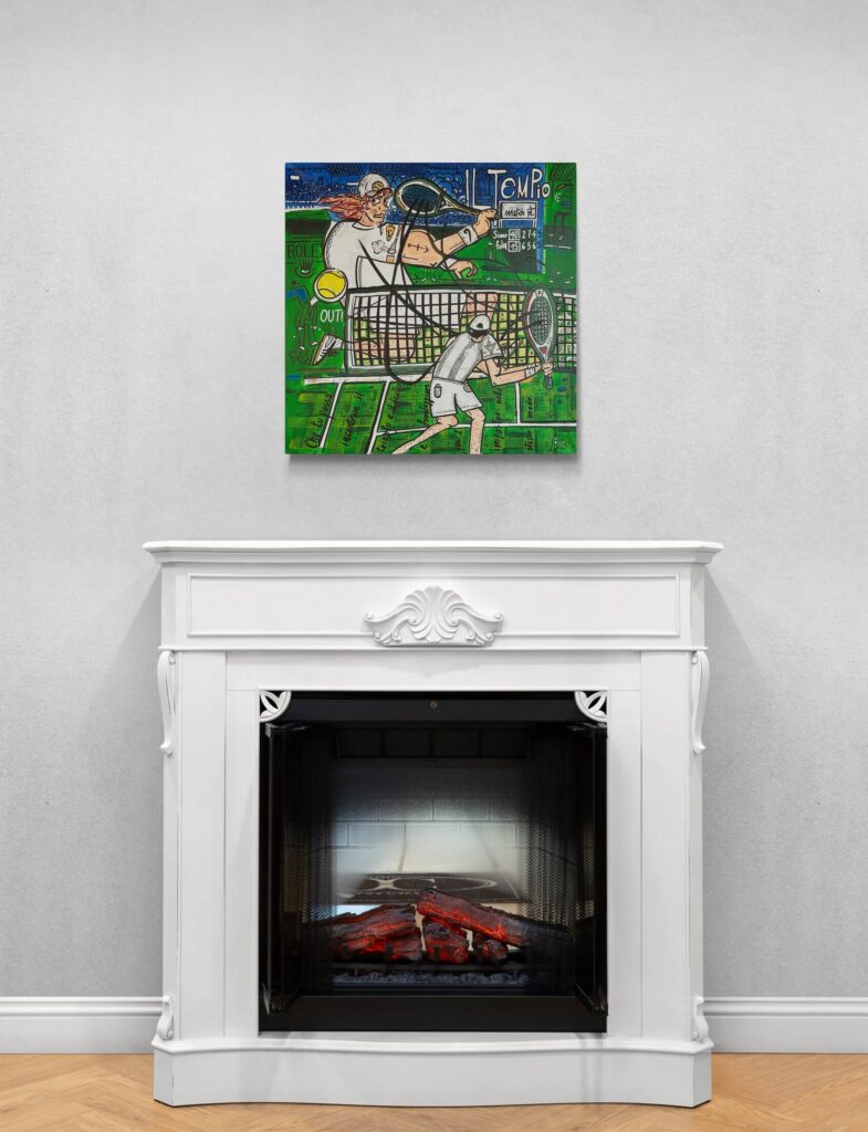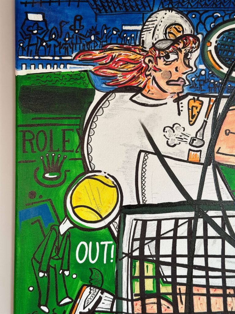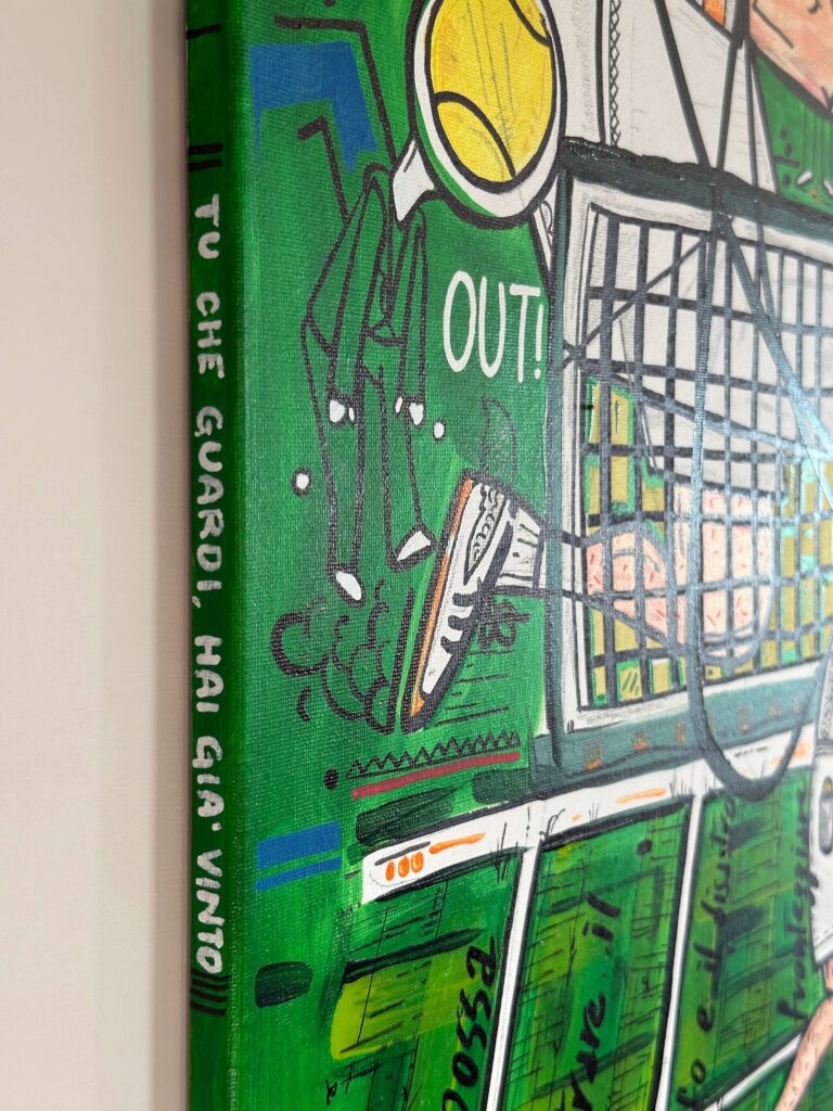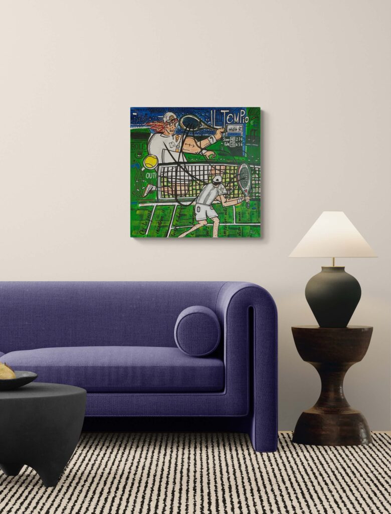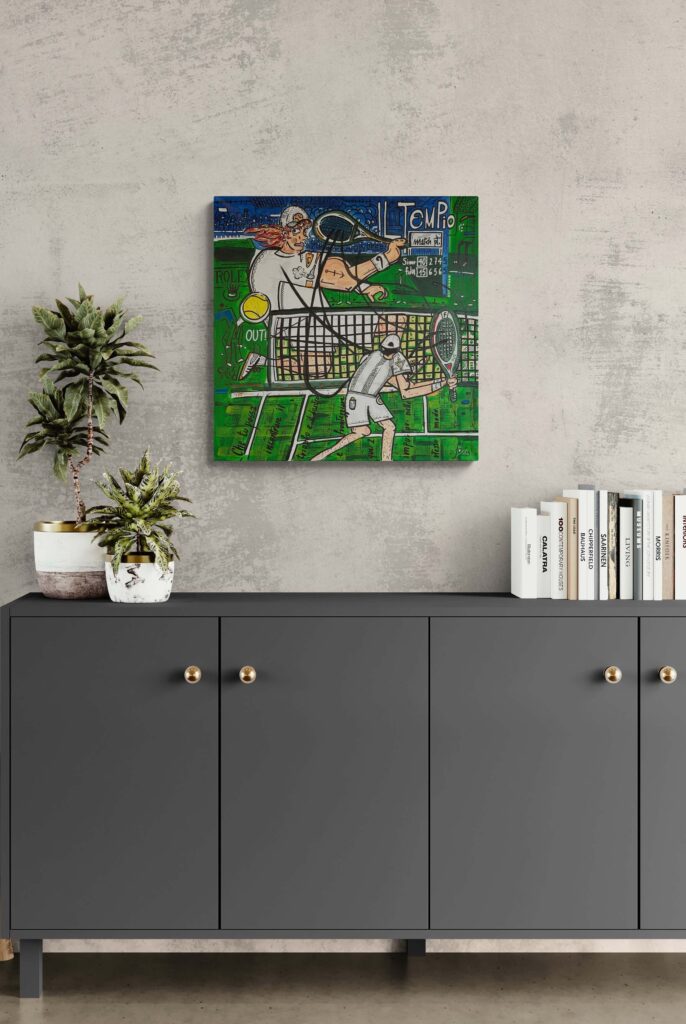 In questa tela ho voluto catturare proprio quell’istante: la tensione pura di una sfida sportiva, il rumore ritmico delle scarpe sull’erba, il luccichio della luce che scivola sulle racchette, il silenzio sospeso tra due colpi, carico di attesa.
