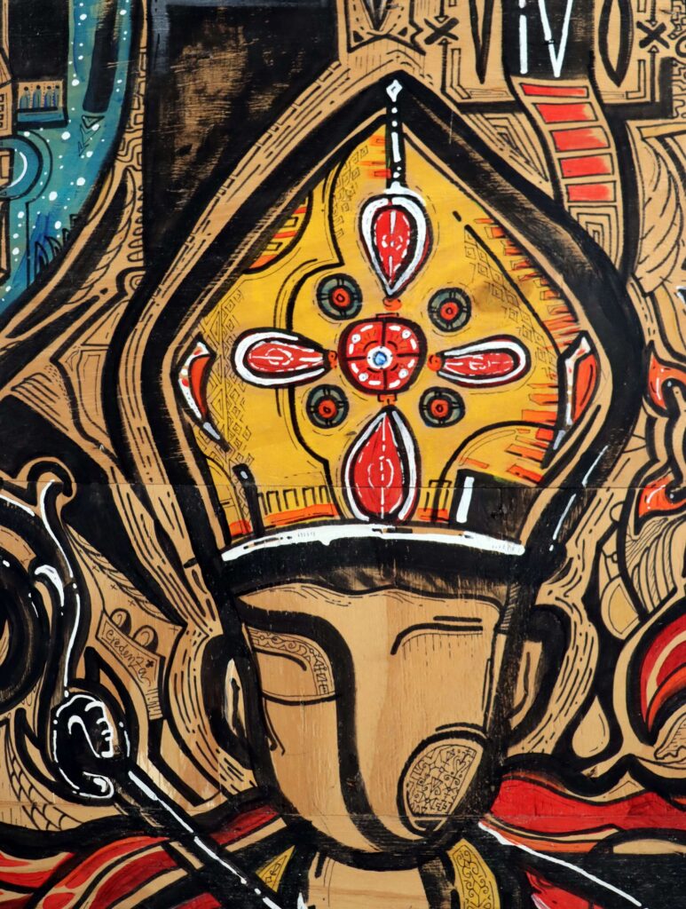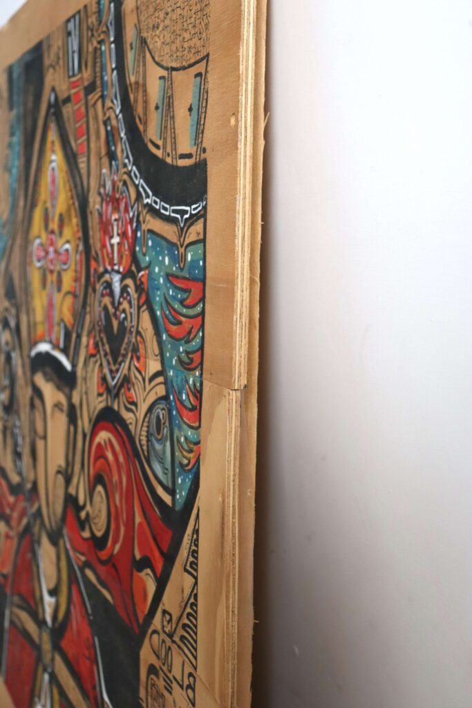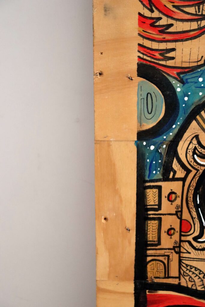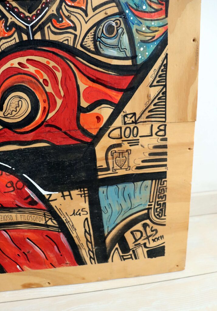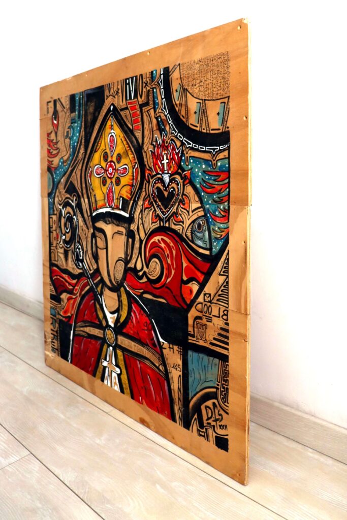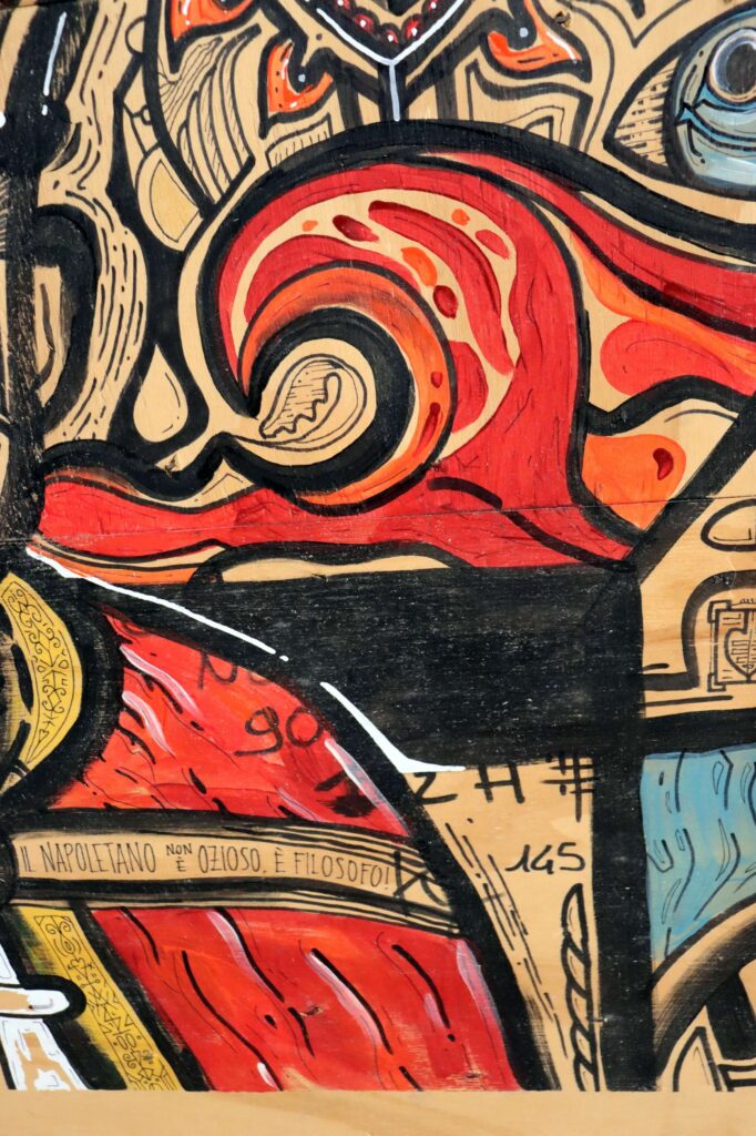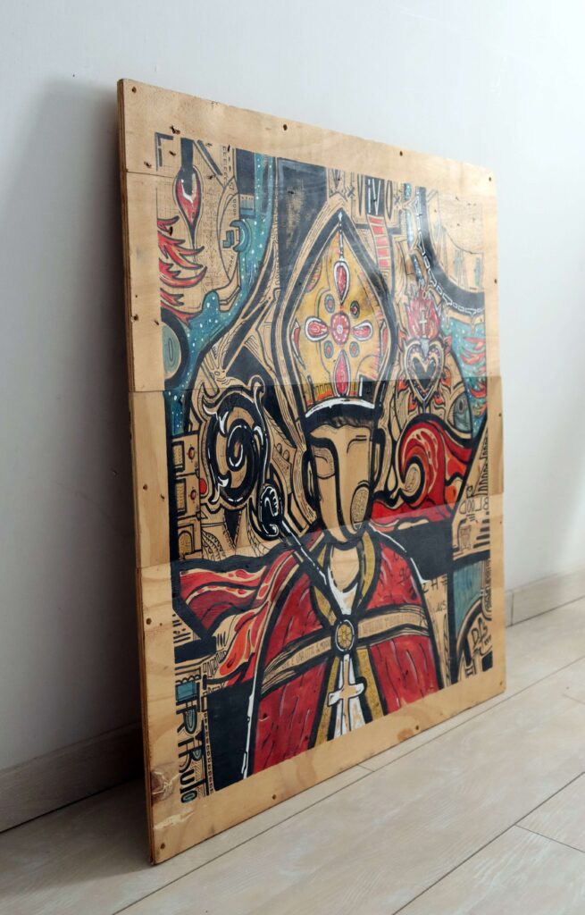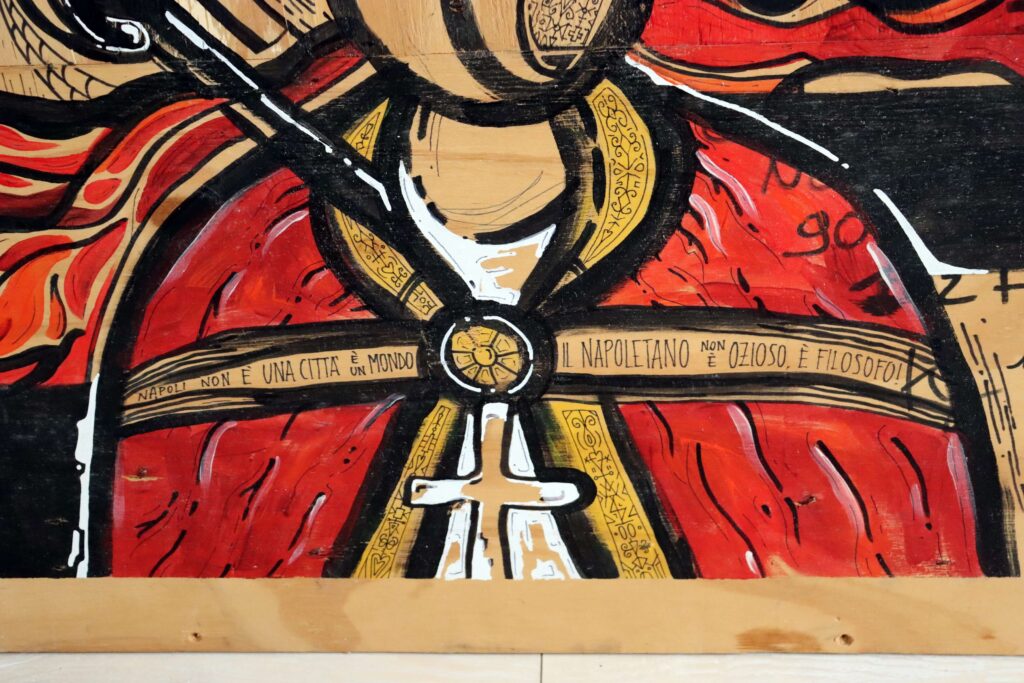 Il dipinto è realizzato su una superficie di legno di recupero, che conserva sullo sfondo le scritte originali del suo utilizzo passato. Questi segni, lontani e imperfetti, dialogano con la pittura e diventano parte integrante della narrazione: tracce del tempo che si intrecciano con la spiritualità del soggetto e con la storia viva di Napoli.