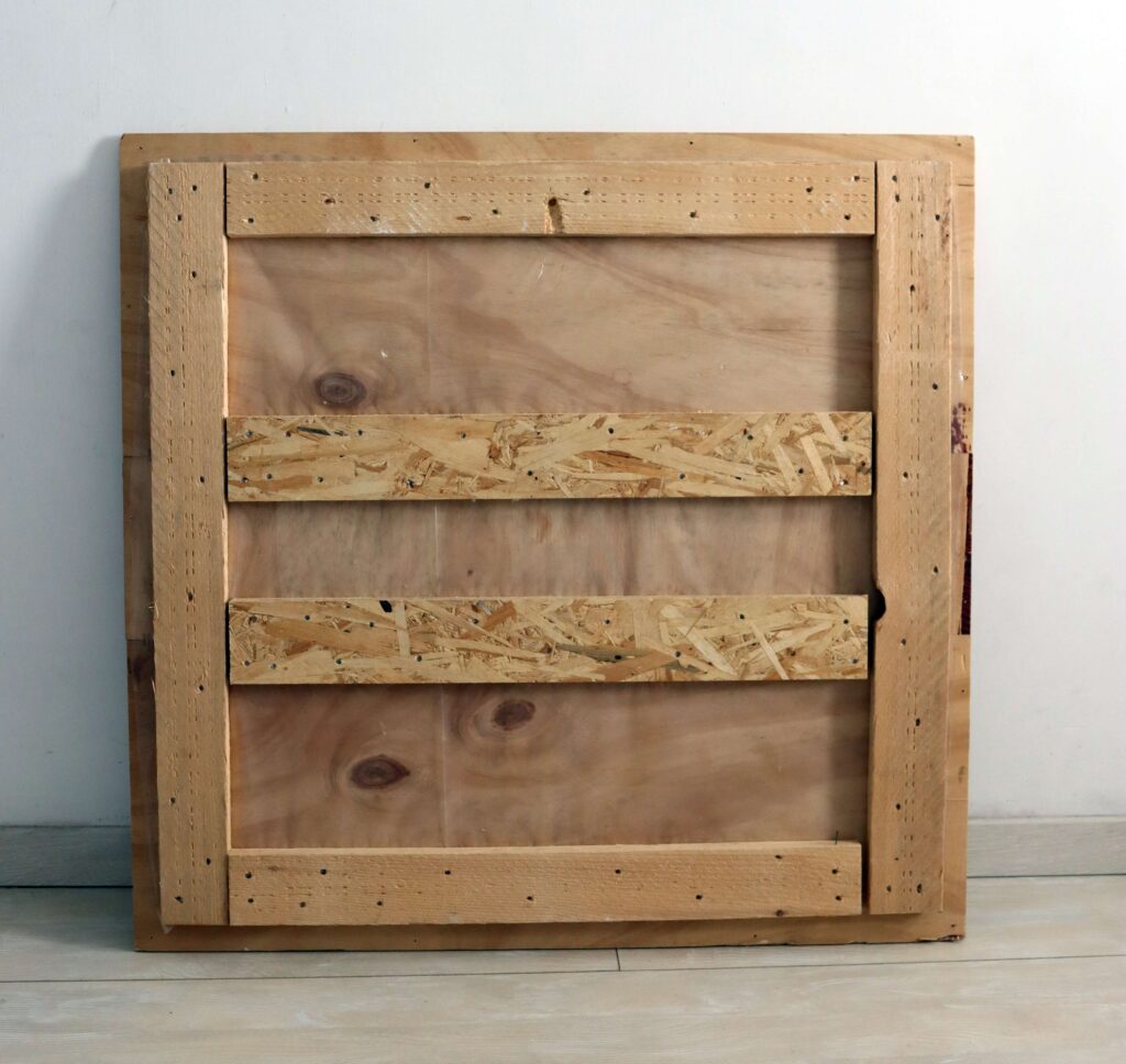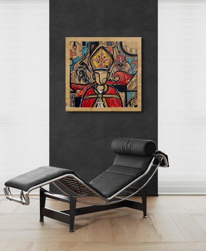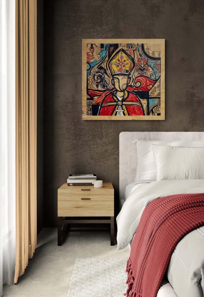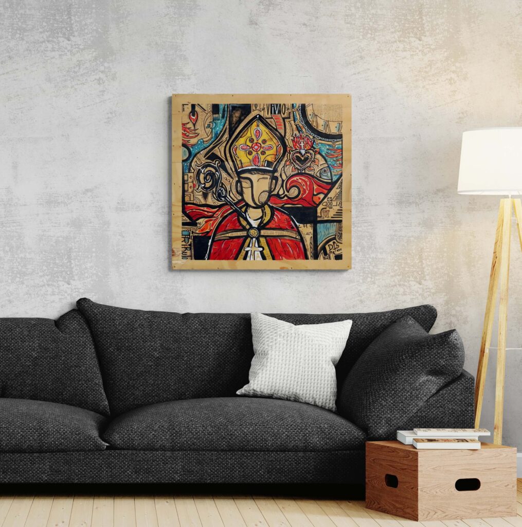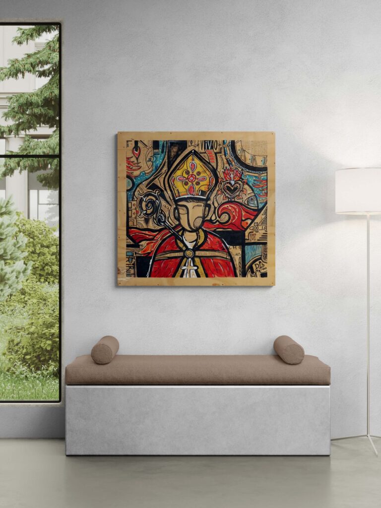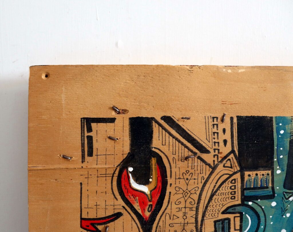 Il dipinto è realizzato su una superficie di legno di recupero, che conserva sullo sfondo le scritte originali del suo utilizzo passato. Questi segni, lontani e imperfetti, dialogano con la pittura e diventano parte integrante della narrazione: tracce del tempo che si intrecciano con la spiritualità del soggetto e con la storia viva di Napoli.