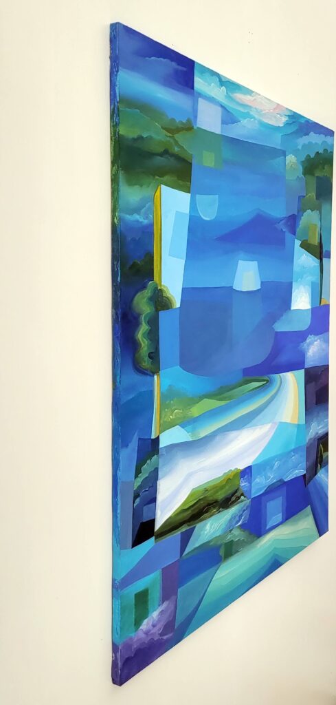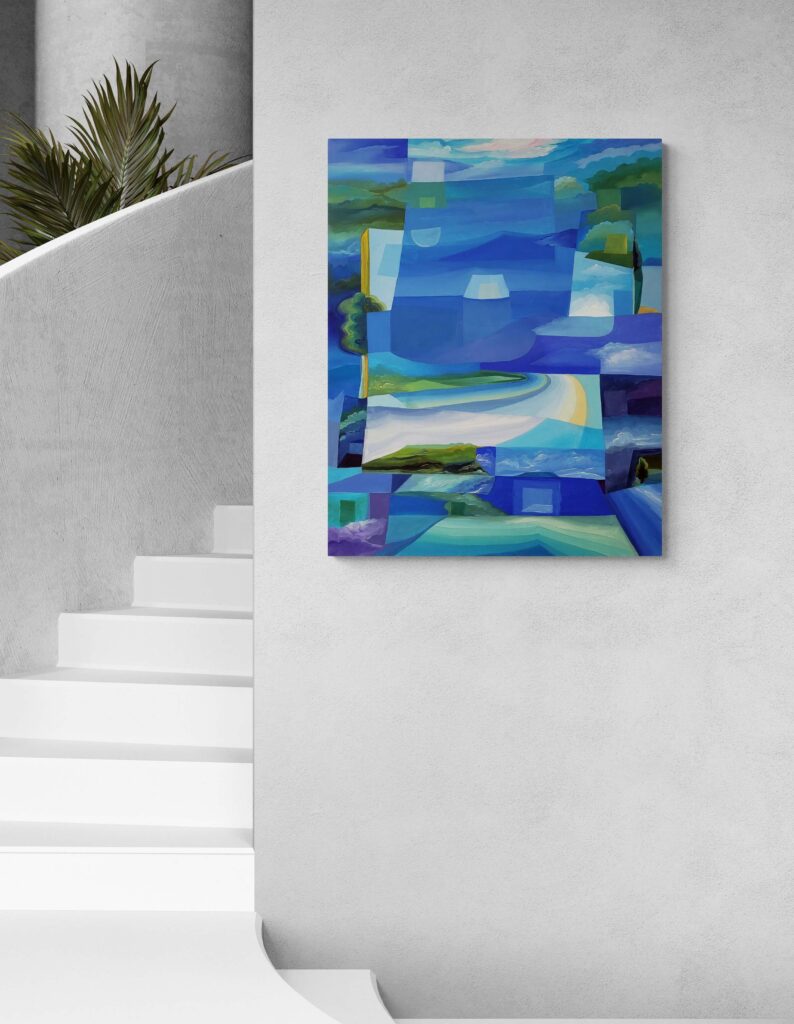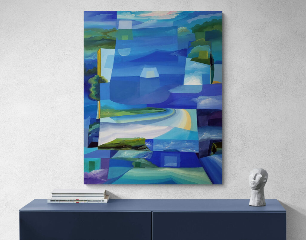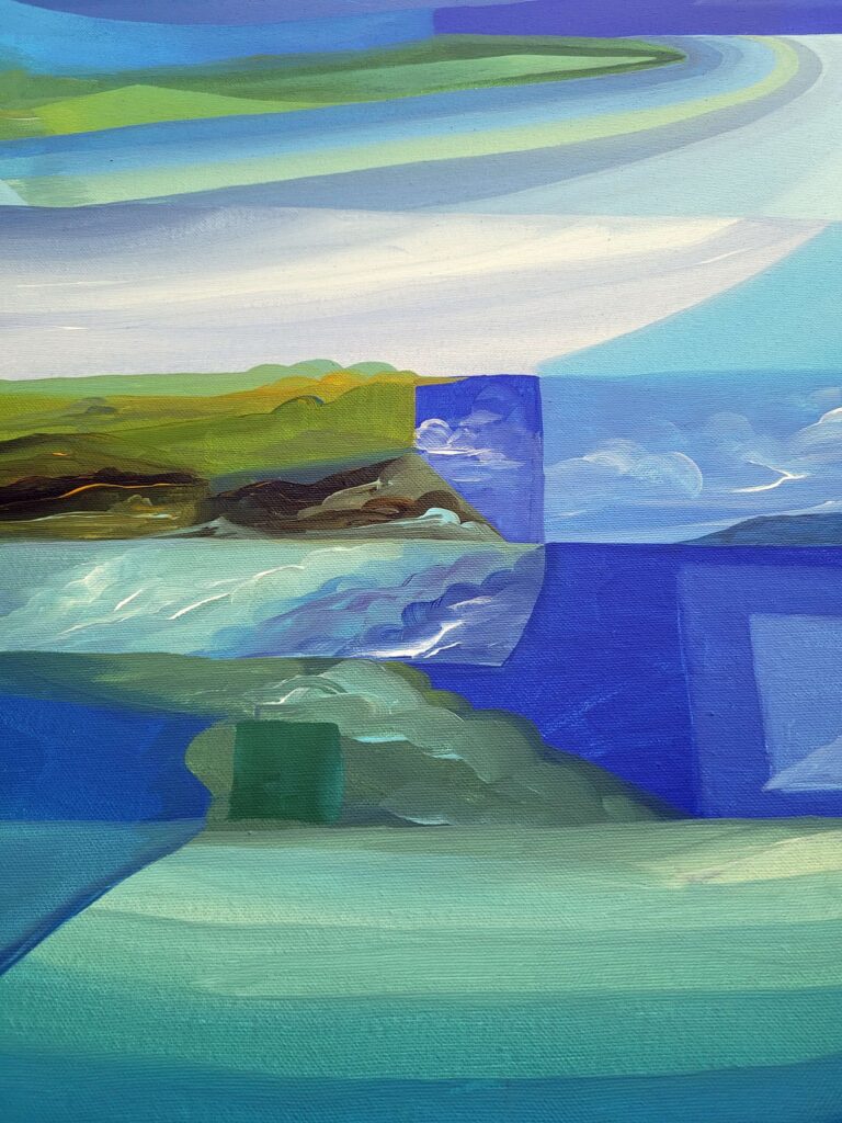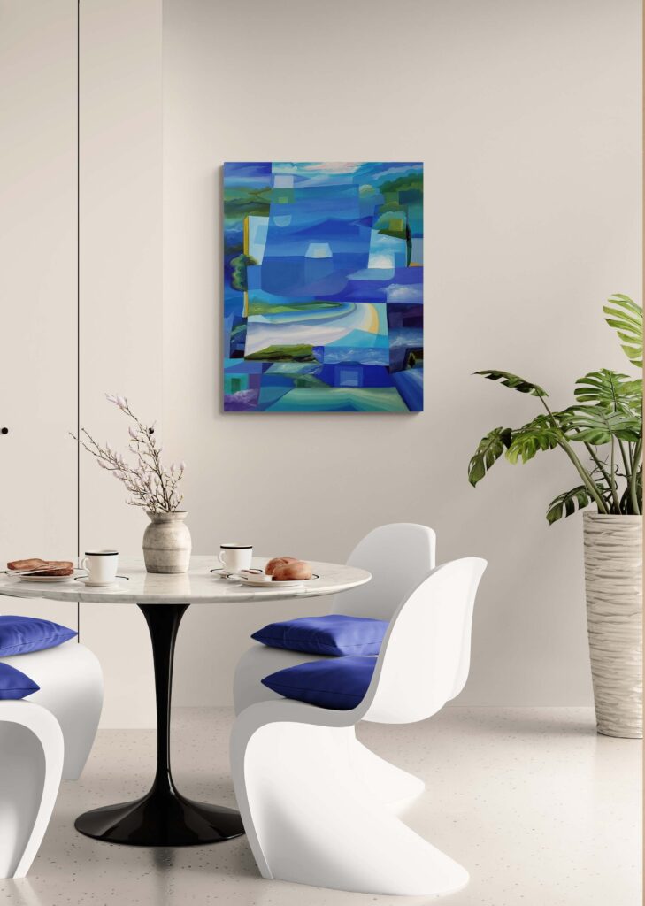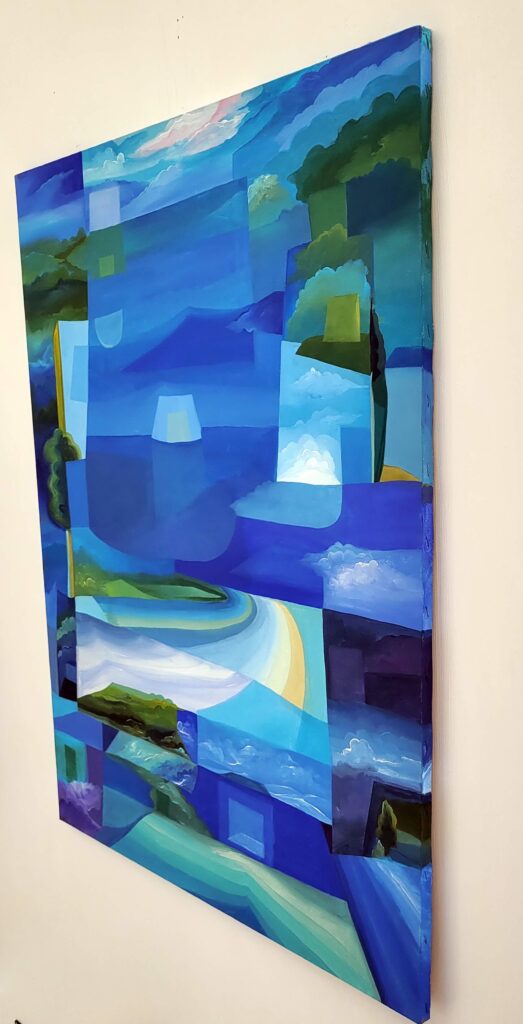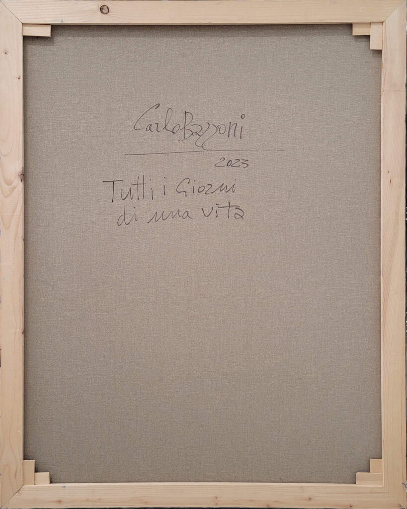 Un mosaico di frammenti luminosi e fluidi racconta il susseguirsi di istanti, come pagine sfogliate dalla memoria. L’andamento curvilineo delle forme guida lo sguardo lungo traiettorie dolci e continue, in cui cielo, terra e mare si intrecciano senza soluzione di continuità. In questo flusso, Bazzoni cattura la percezione del tempo non come una linea retta, ma come un insieme di ritorni, risonanze e cicli interiori.