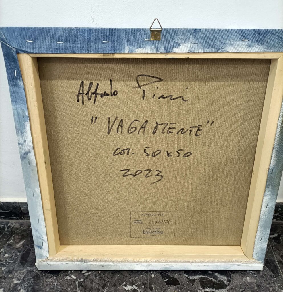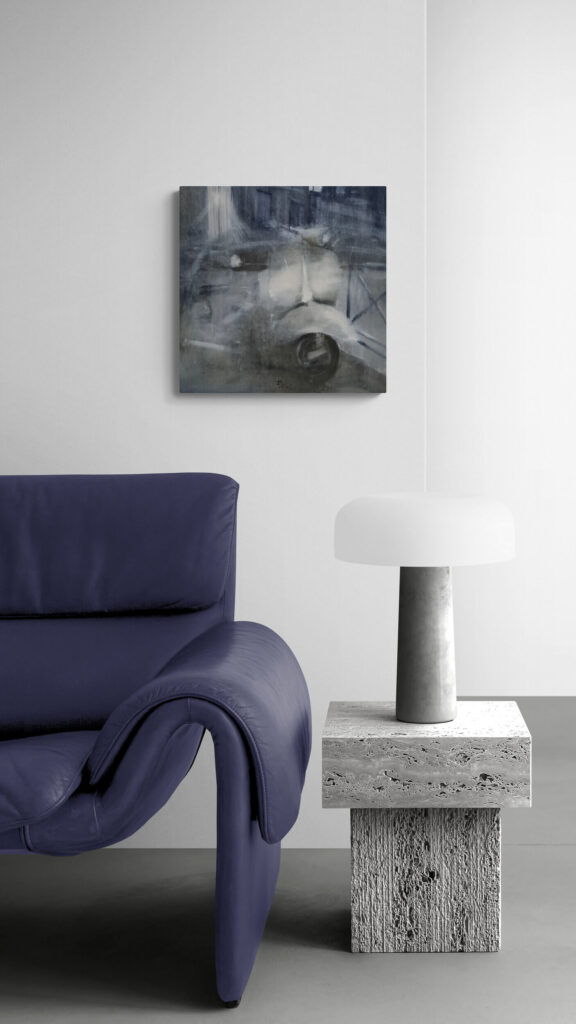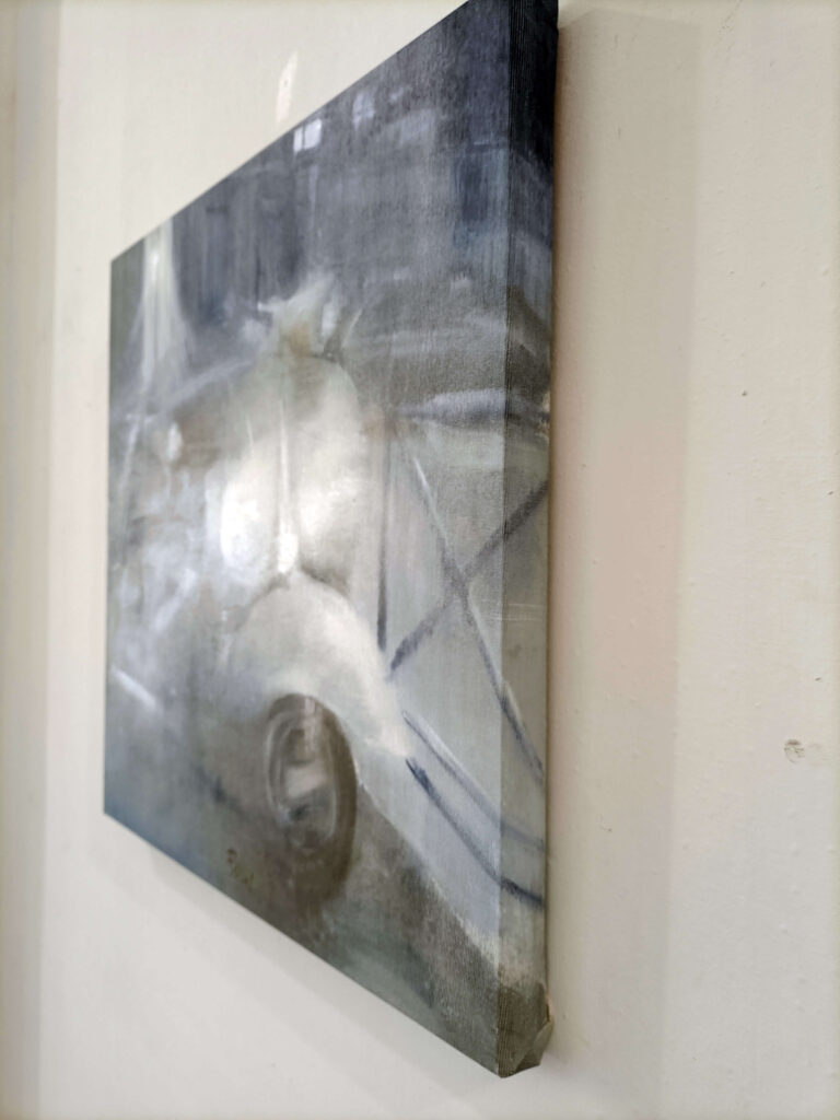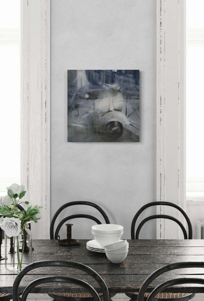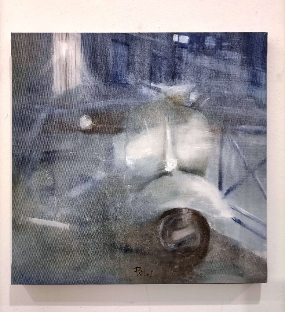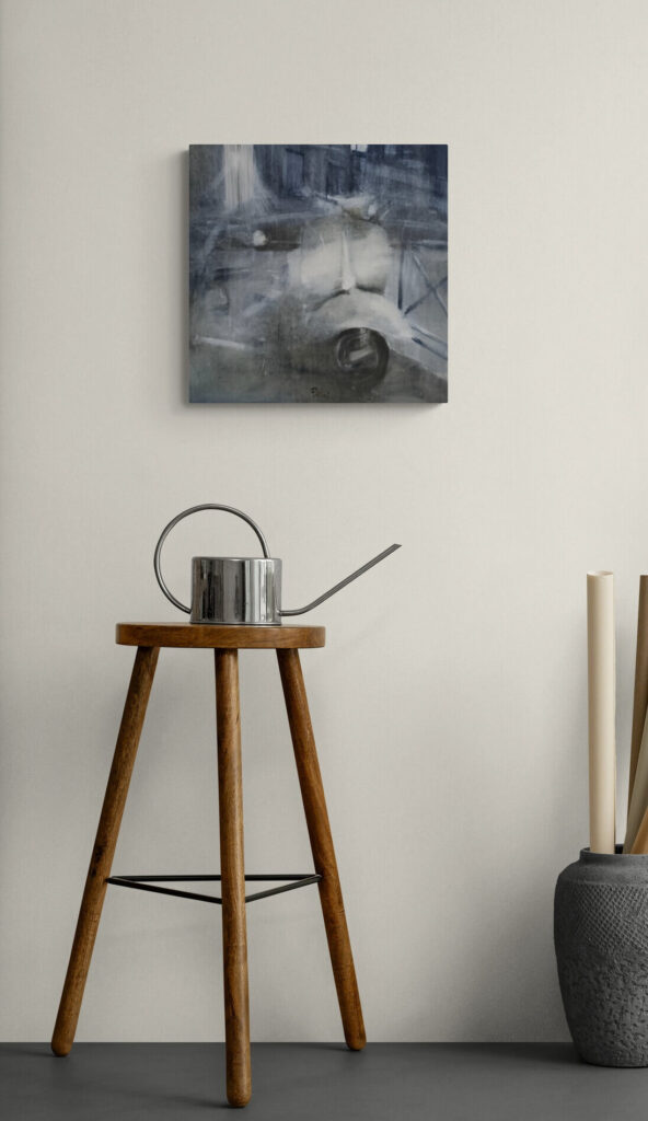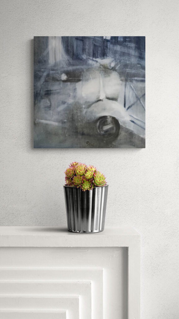 In Vagamente, l’immagine affiora come un ricordo sfocato, un frammento di vita sospeso tra sogno e memoria. L’artista dissolve le forme in una luce lattiginosa, dove la realtà perde consistenza e si fa evocazione. La Vespa, appena riconoscibile, diventa simbolo di un tempo lontano, di un passaggio fugace nella città silenziosa. Tutto appare “vagamente”, come in un ricordo che svanisce mentre si tenta di afferrarlo.