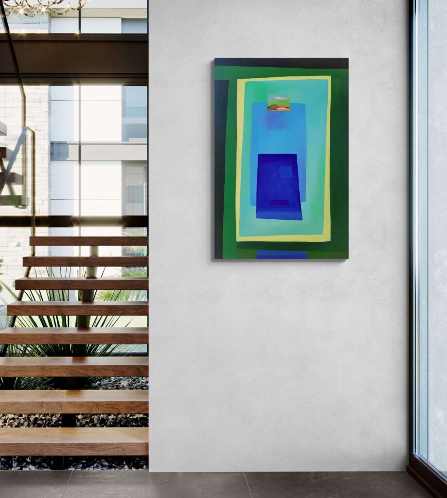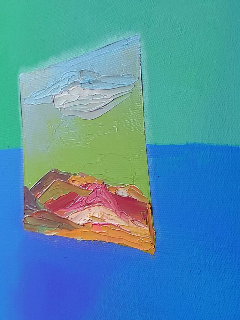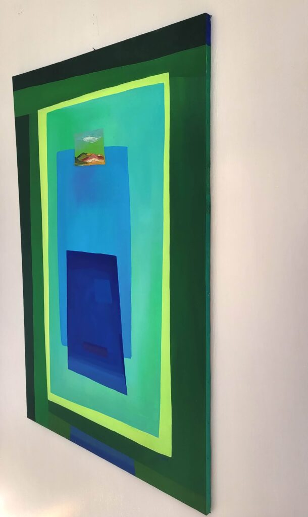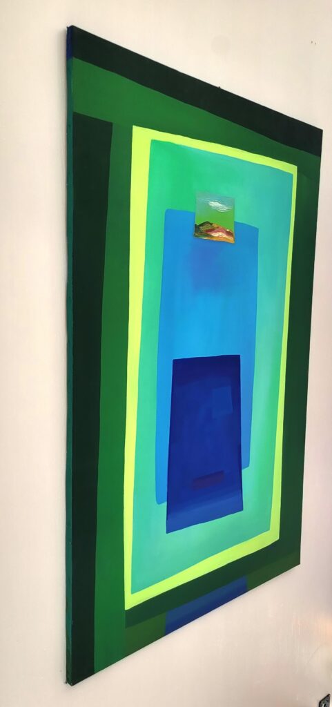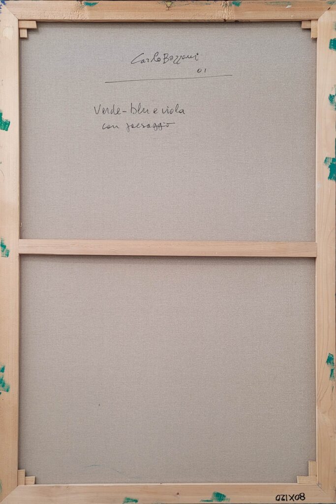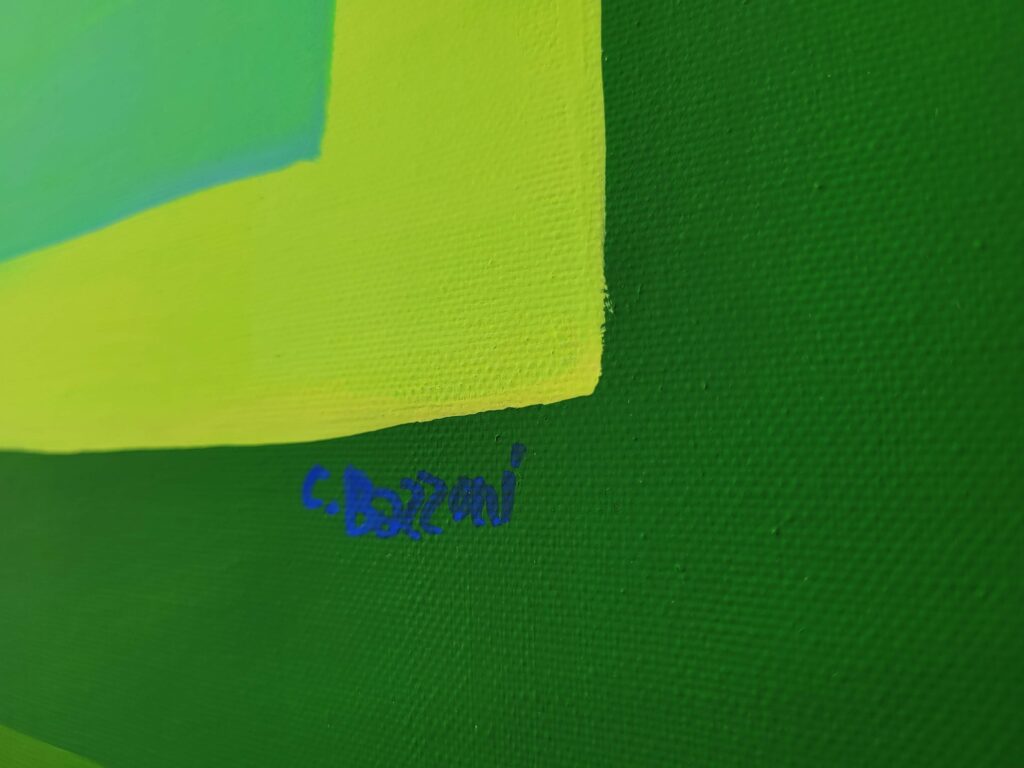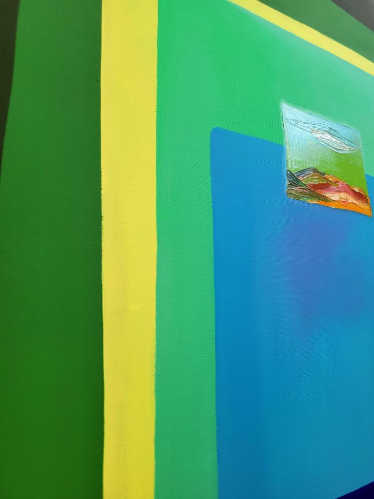 Quest’opera di Bazzoni è una meditazione sulla percezione, dove il colore si trasforma in portale. Verde, blu e viola con paesaggio è una finestra dentro una finestra: al centro, un paesaggio quasi reale — una nube, una collina, la luce calda del tramonto — incastonato in una composizione che ne isola la presenza come fosse un frammento sacro.