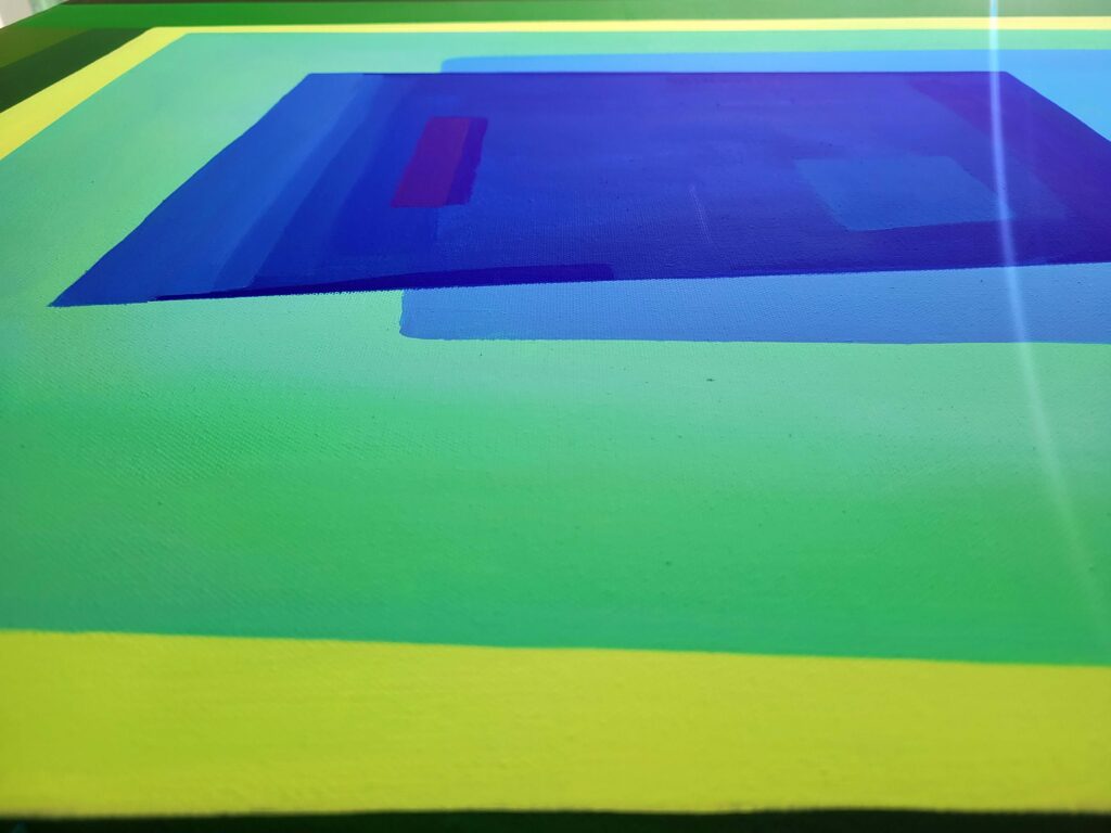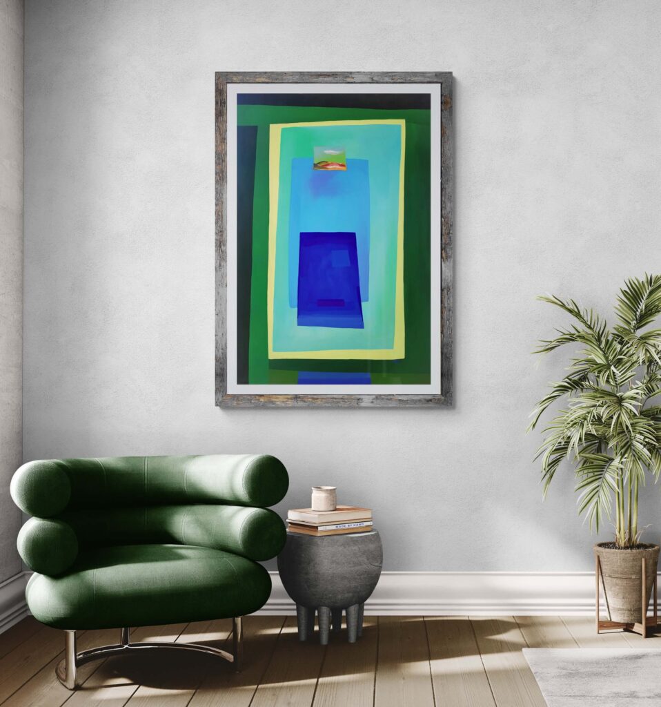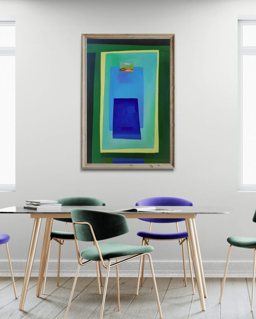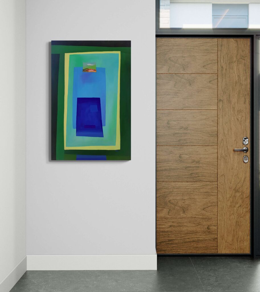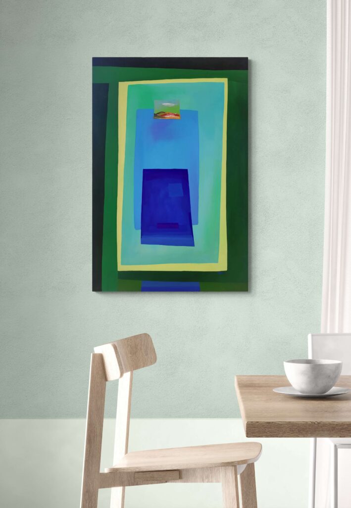 Quest’opera di Bazzoni è una meditazione sulla percezione, dove il colore si trasforma in portale. Verde, blu e viola con paesaggio è una finestra dentro una finestra: al centro, un paesaggio quasi reale — una nube, una collina, la luce calda del tramonto — incastonato in una composizione che ne isola la presenza come fosse un frammento sacro.