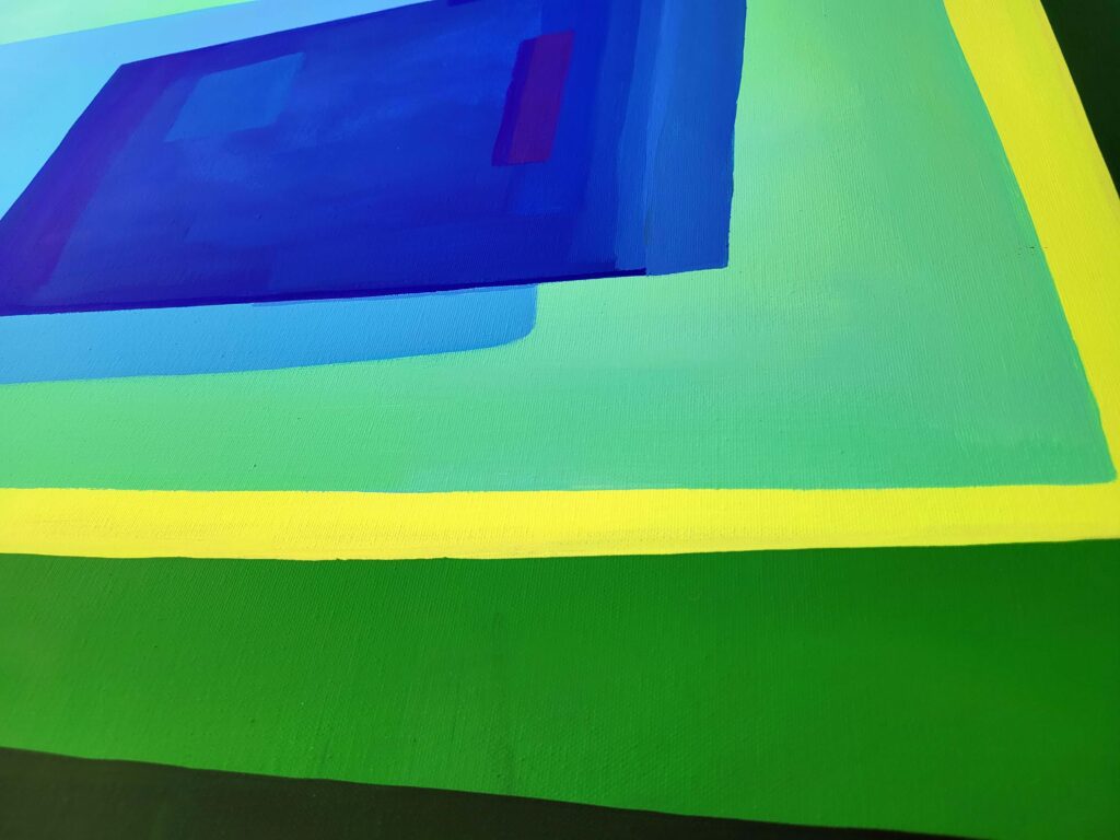 Le campiture geometriche, in tonalità fredde ma vibranti, avvolgono e contengono la visione. Sono strati di distanza, soglie di astrazione che guidano l’occhio verso un nucleo misterioso. Il paesaggio, pur così piccolo, è la chiave: ci invita a una contemplazione concentrata, suggerendo che l’essenza può trovarsi solo al centro dell’assenza.